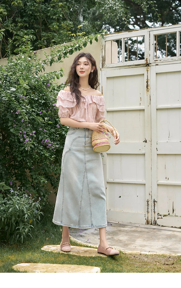 MISHOW French Retro Floral Short Sleeve Blouses Summer 2025 Loose One Line Shoulder Ruffled Edge Lace Up Sweet Top MXD25X1520