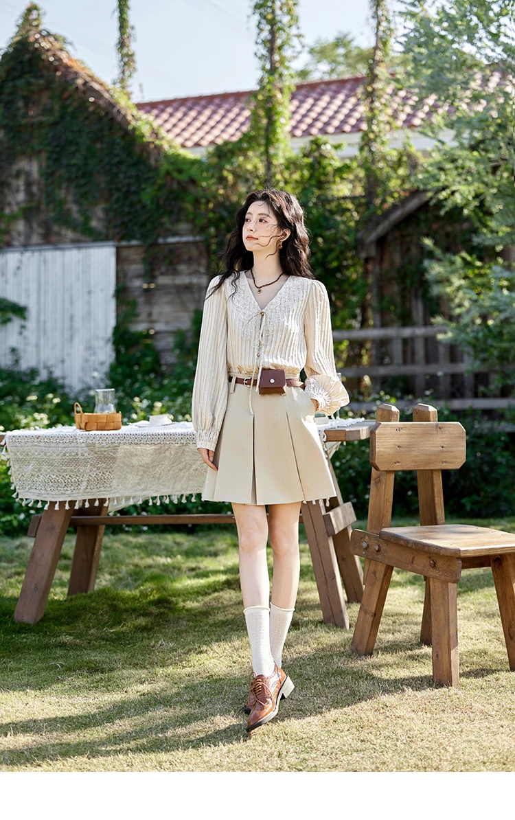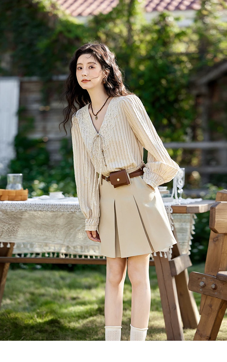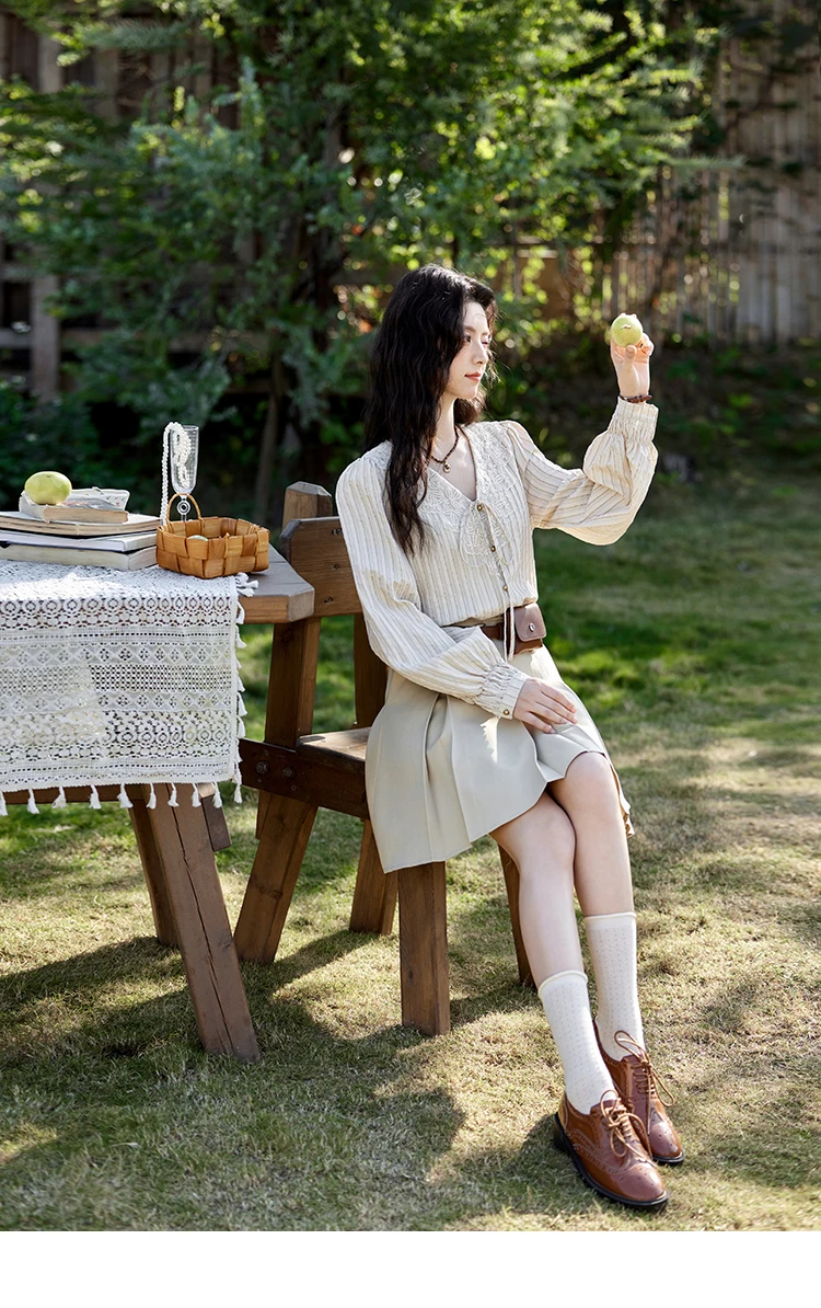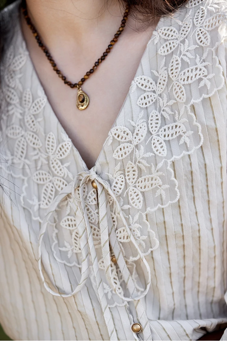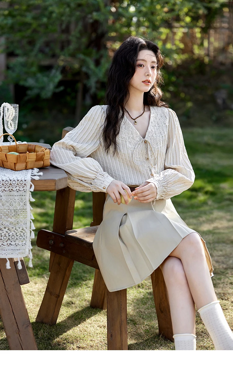 MISHOW French Retro V-neck Lace-up Striped Shirt for Women Spring 2025 Embroidered Lace Long Sleeve Top Casual Shirts MXE12X1715