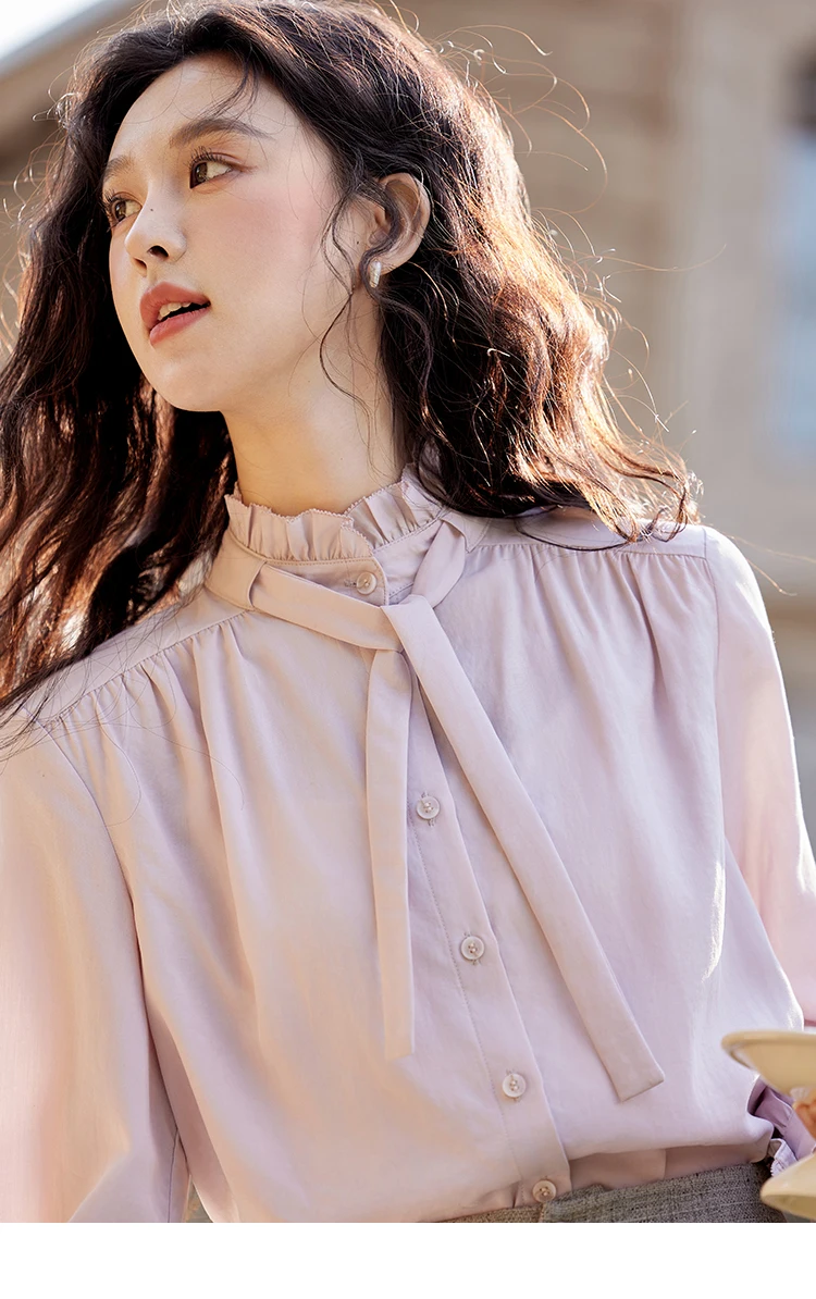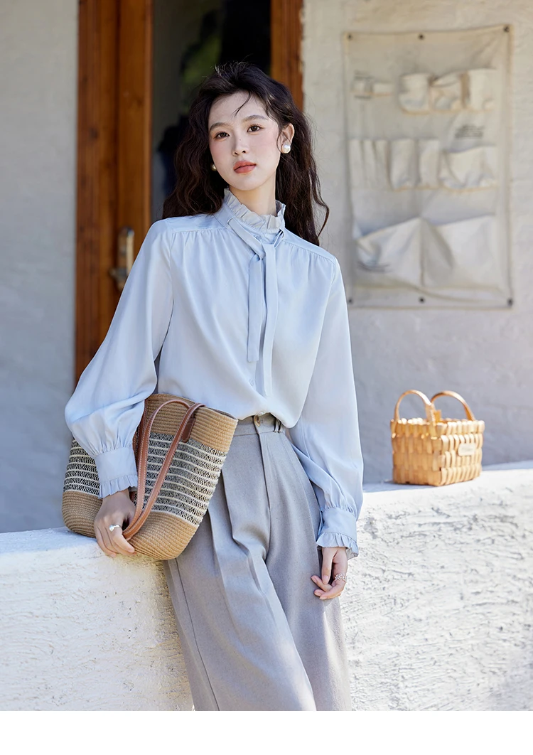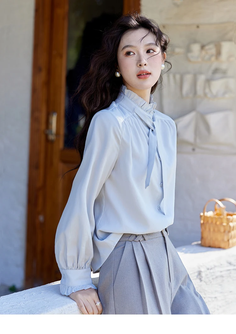 MISHOW French Ribbon Stringy Selvedge Neck Shirt for Women Spring 2025 Slim 100 Lyocell Shirts Solid Commuter Tops MXE13C0383