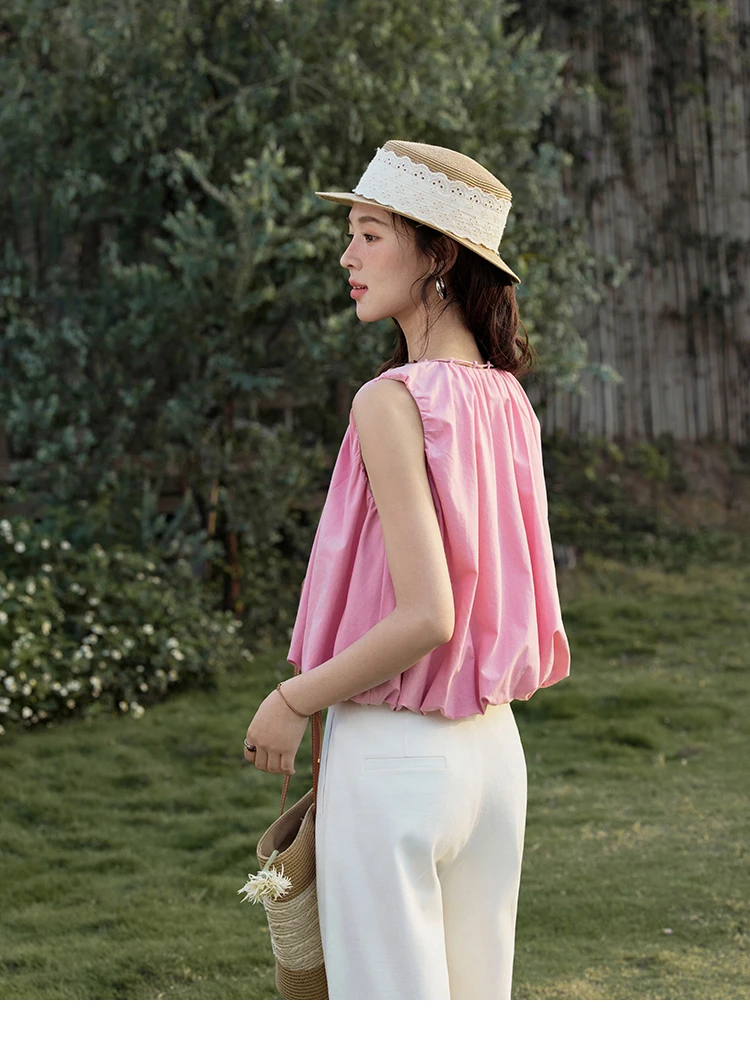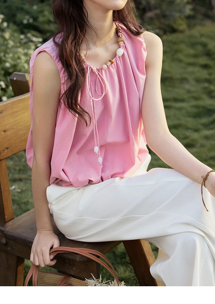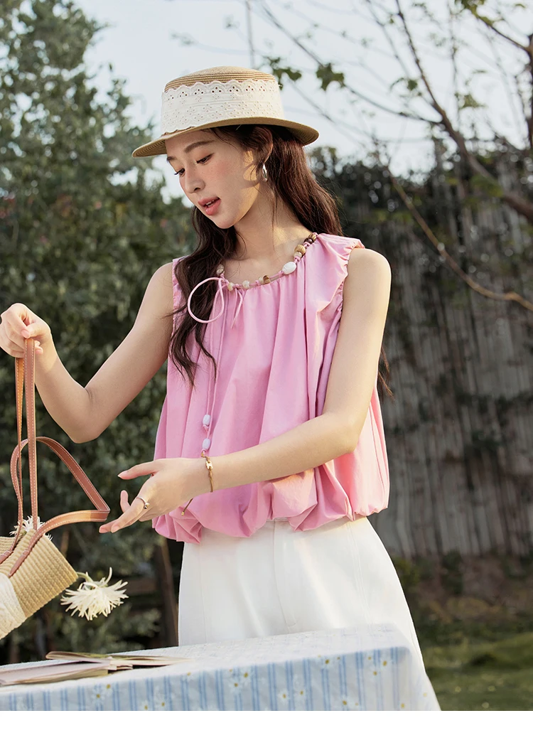 MISHOW French Rose Red Blouses Women Summer 2025 Sleeveless Round Neck Beaded Strap Design Short Tops Lady New Thin MXE32X1773