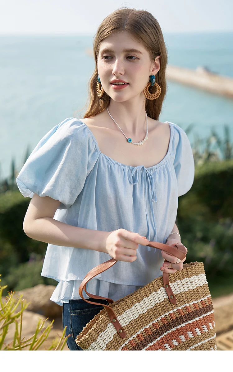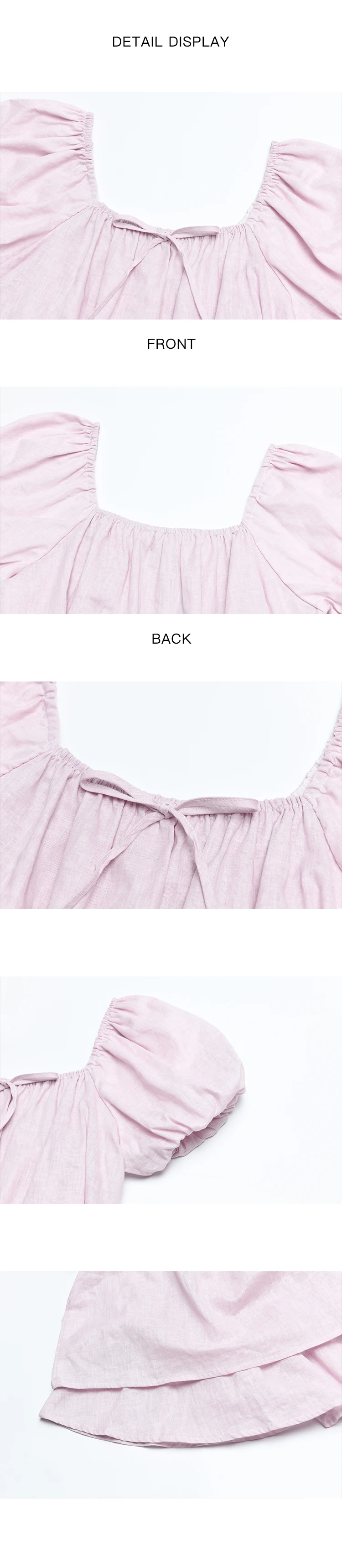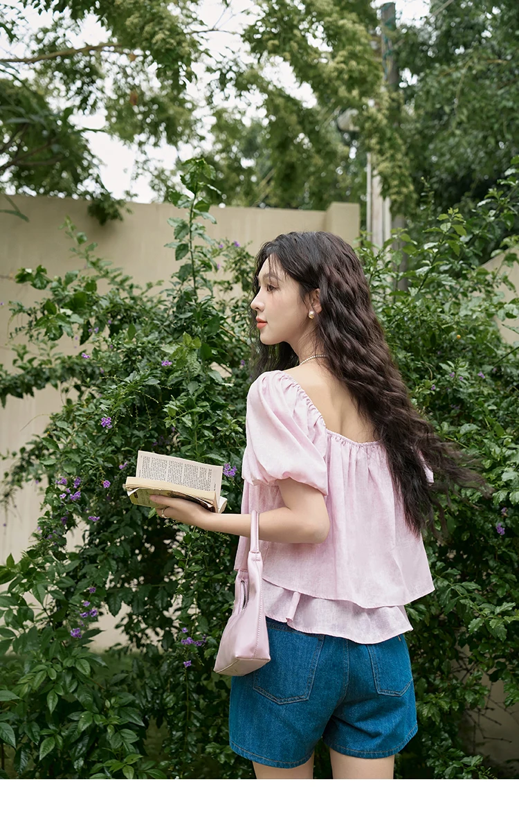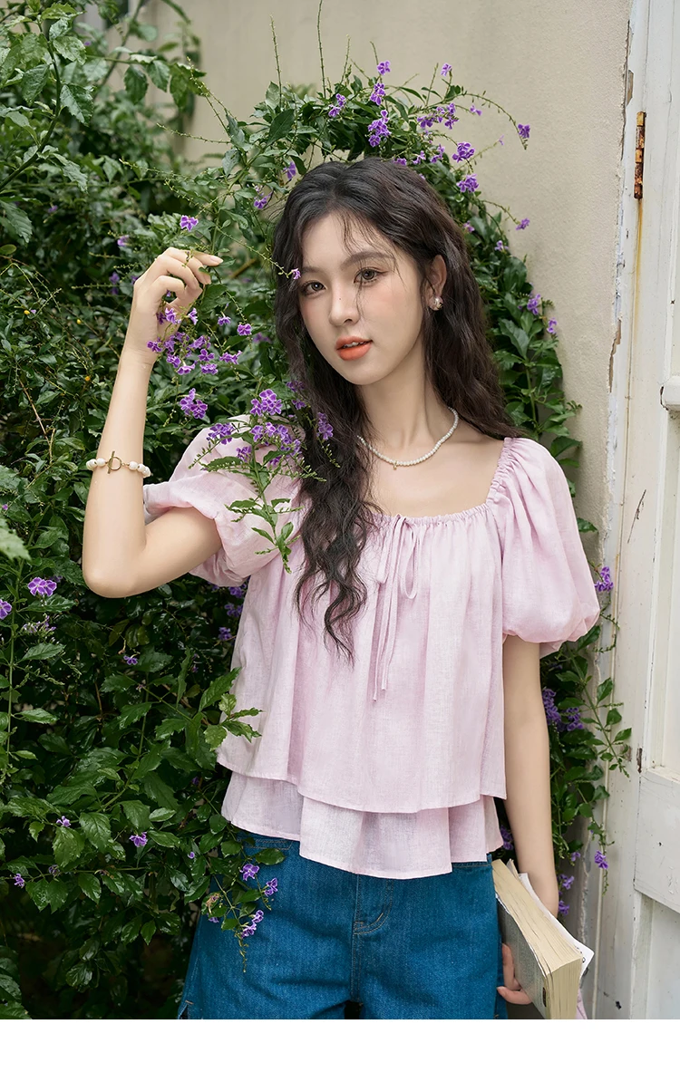 MISHOW French Square Neck Tied Lantern Sleeve Blouses 2025 Summer Double Layered Hem Puff Sleeve Solid Sweet Tops MXD26X1551