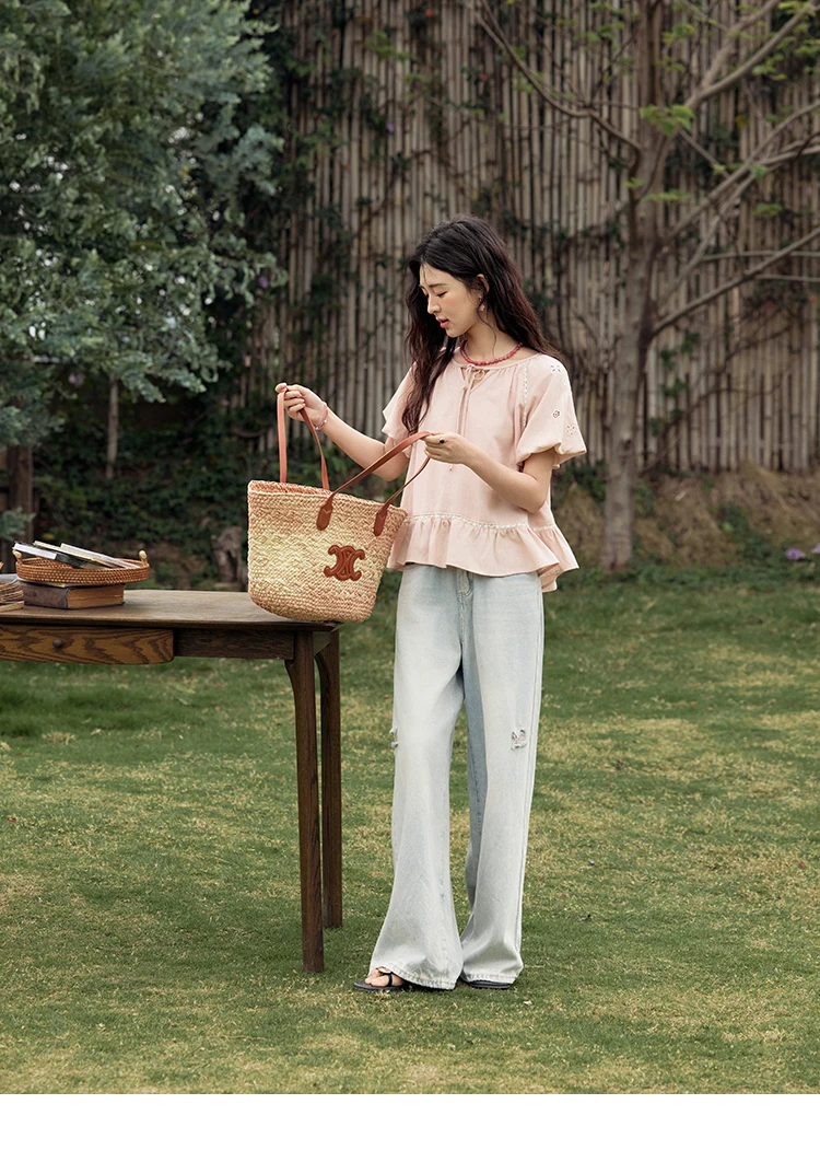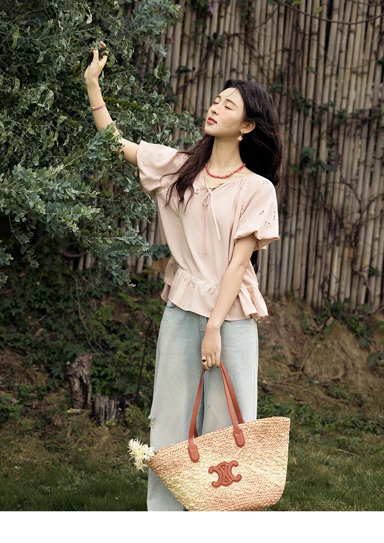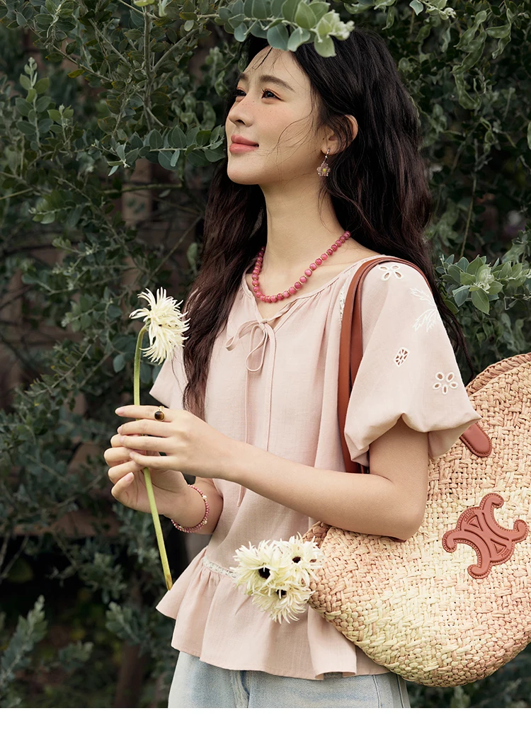MISHOW French Summer Blouse Women 2025 Short Puff Sleeve Round Neck Solid Hollow Embroidery Shirts Woman Holiday Thin MXE31X1747