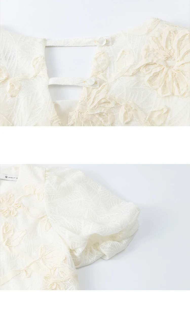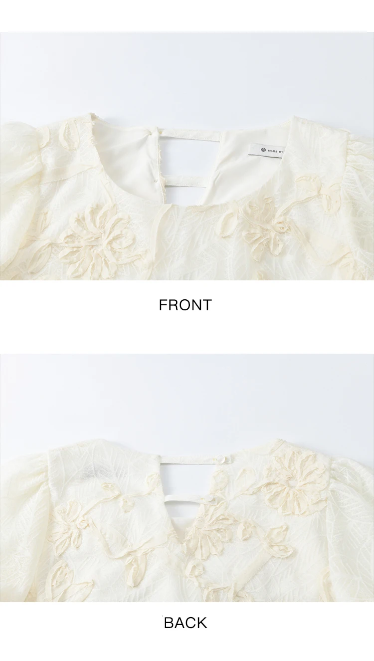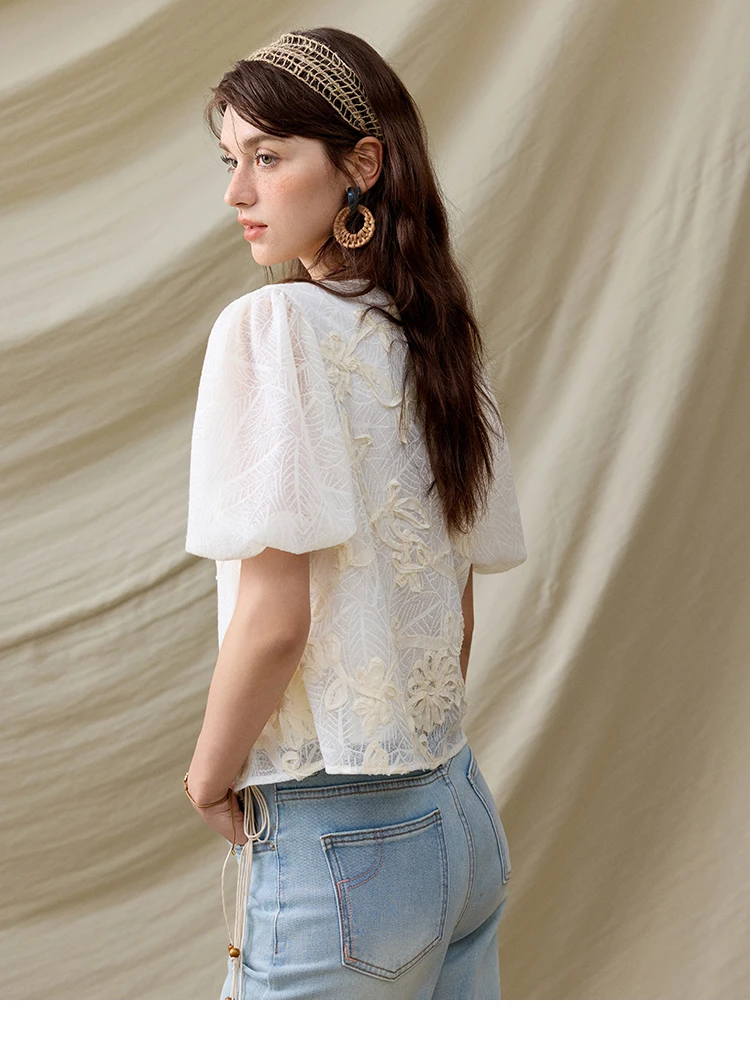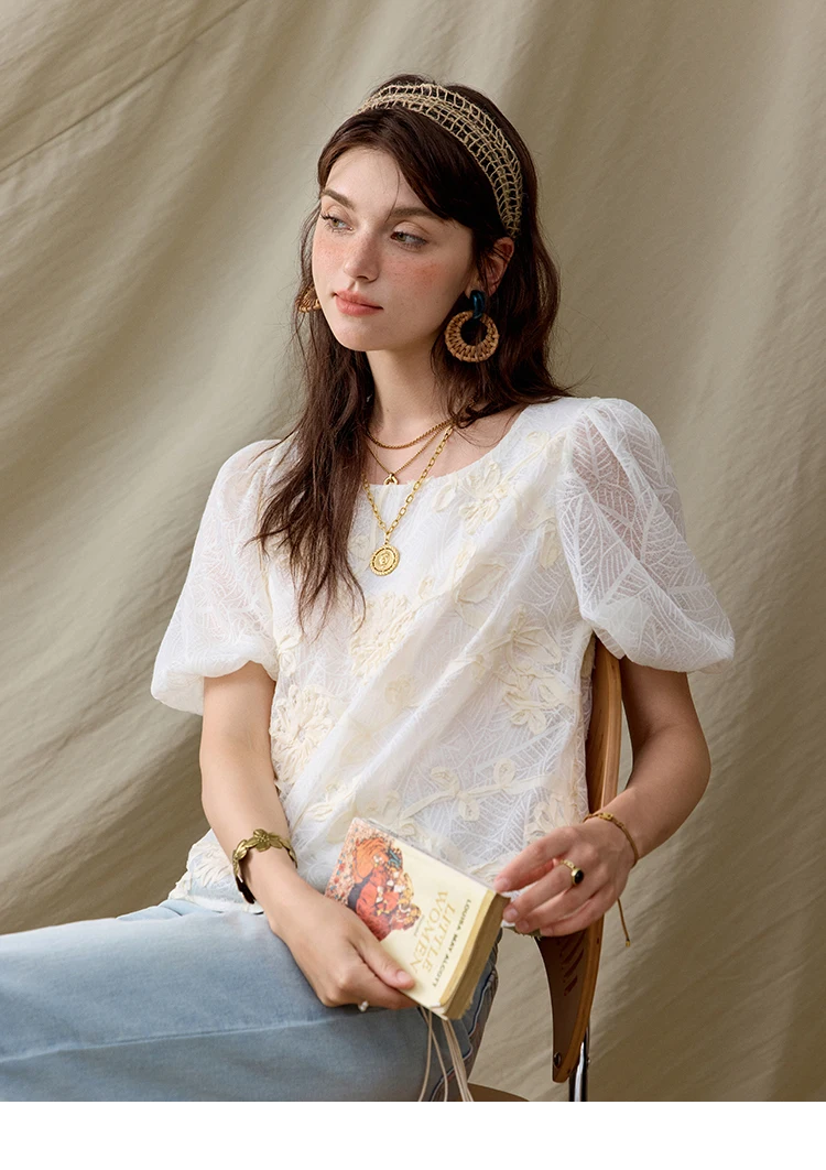 MISHOW French Summer Blouses Women New 2025 Short Puff Sleeve Round Neck Jacquard Flower Slim Shirts Woman Versatile MXE32X1772
