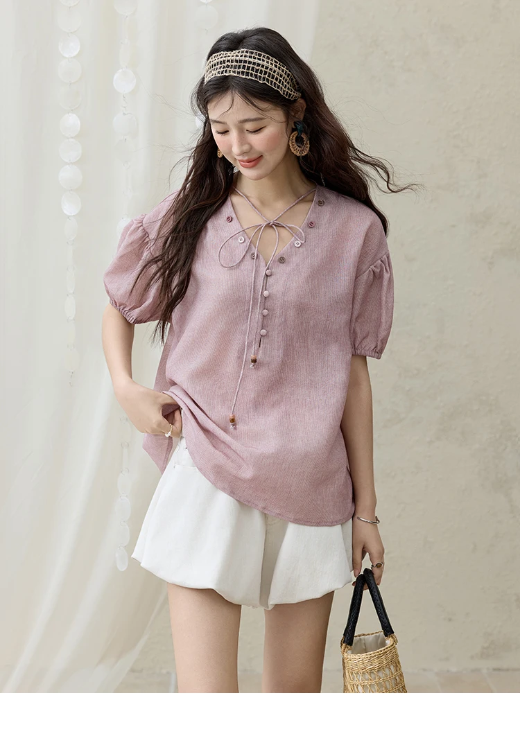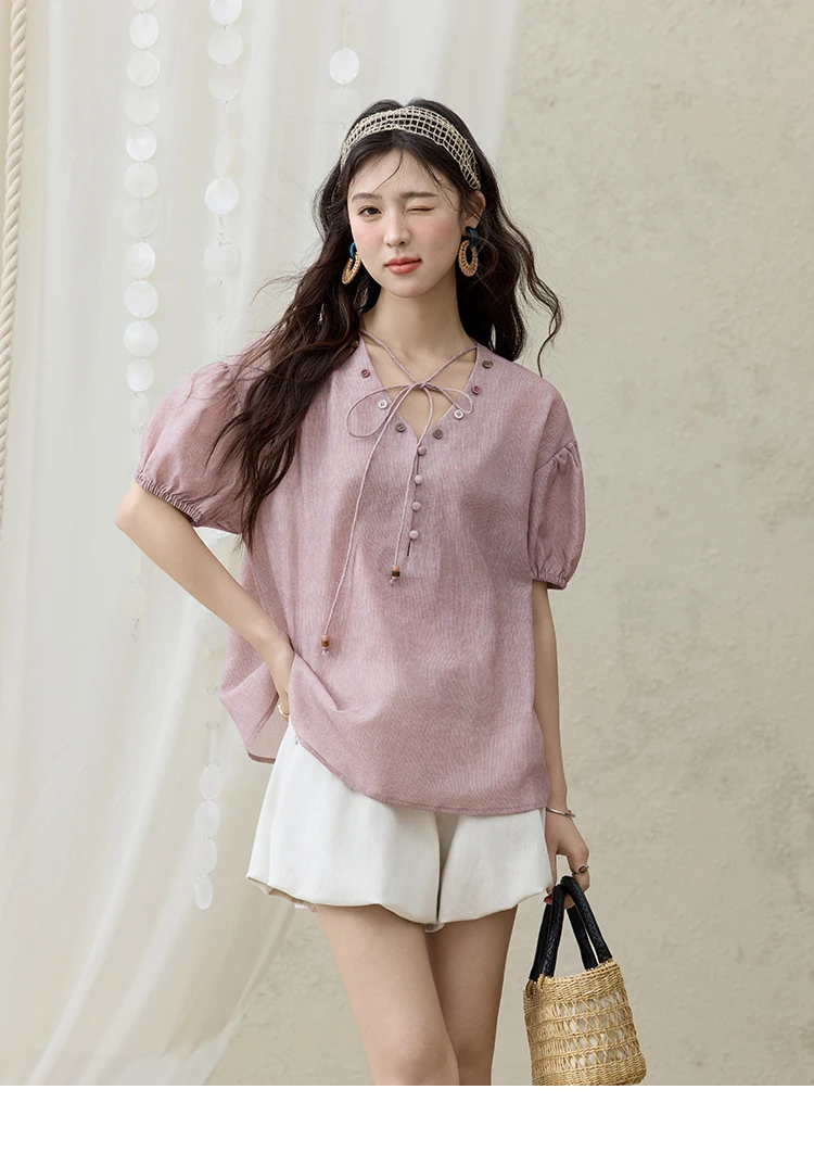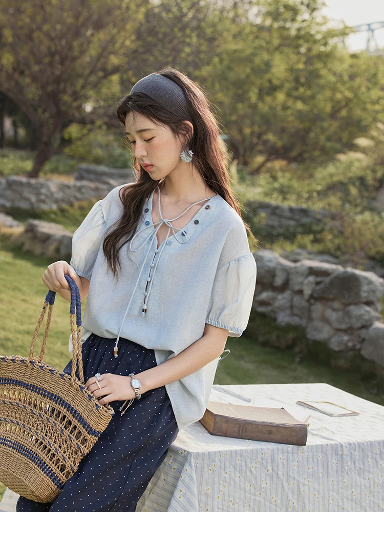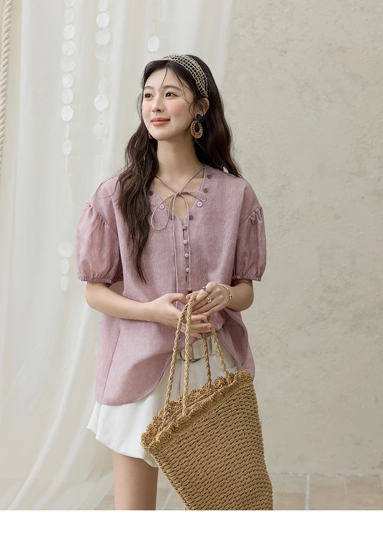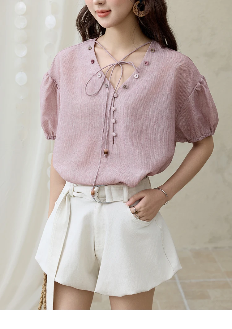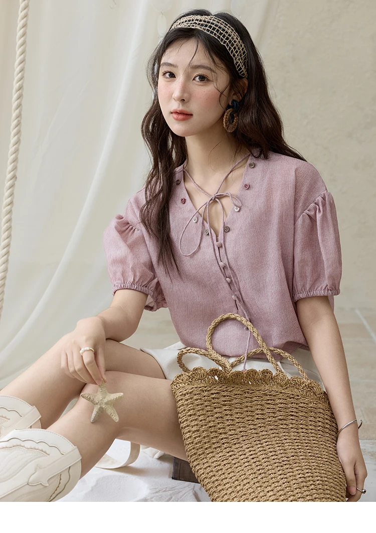 MISHOW French Summer Blouses Women Solid Short Puff Sleeve V-neck Lace-up Design Shirts Female Fashion Straight Tops MXE33X1743