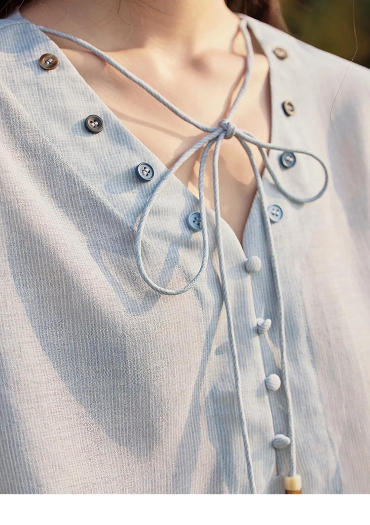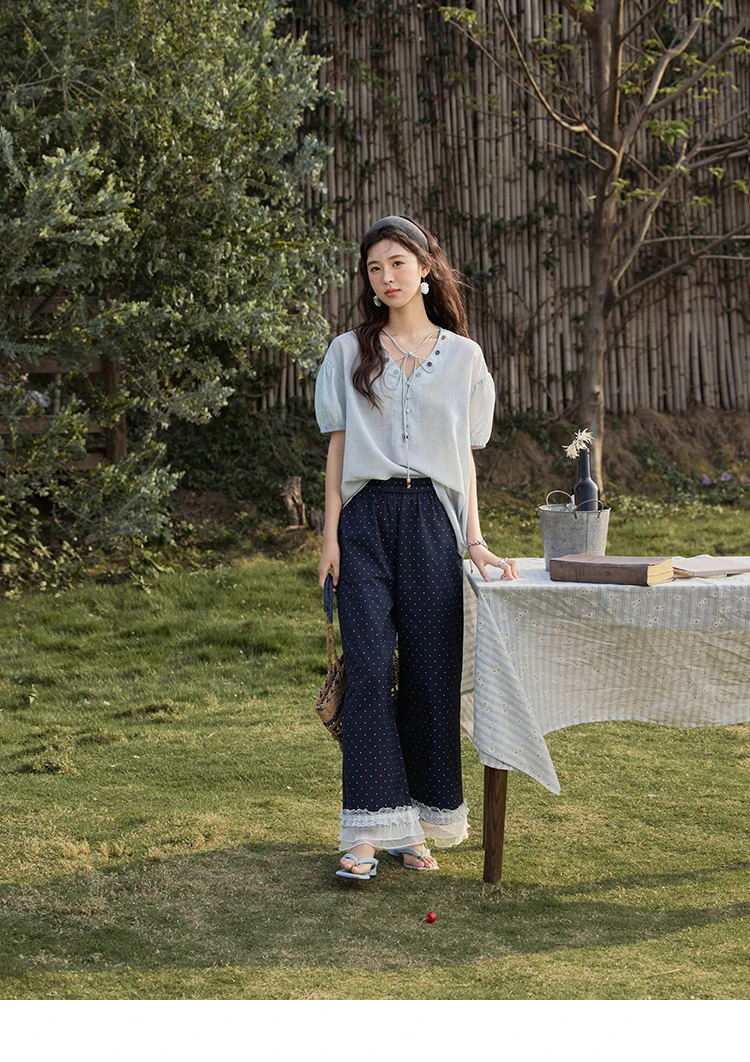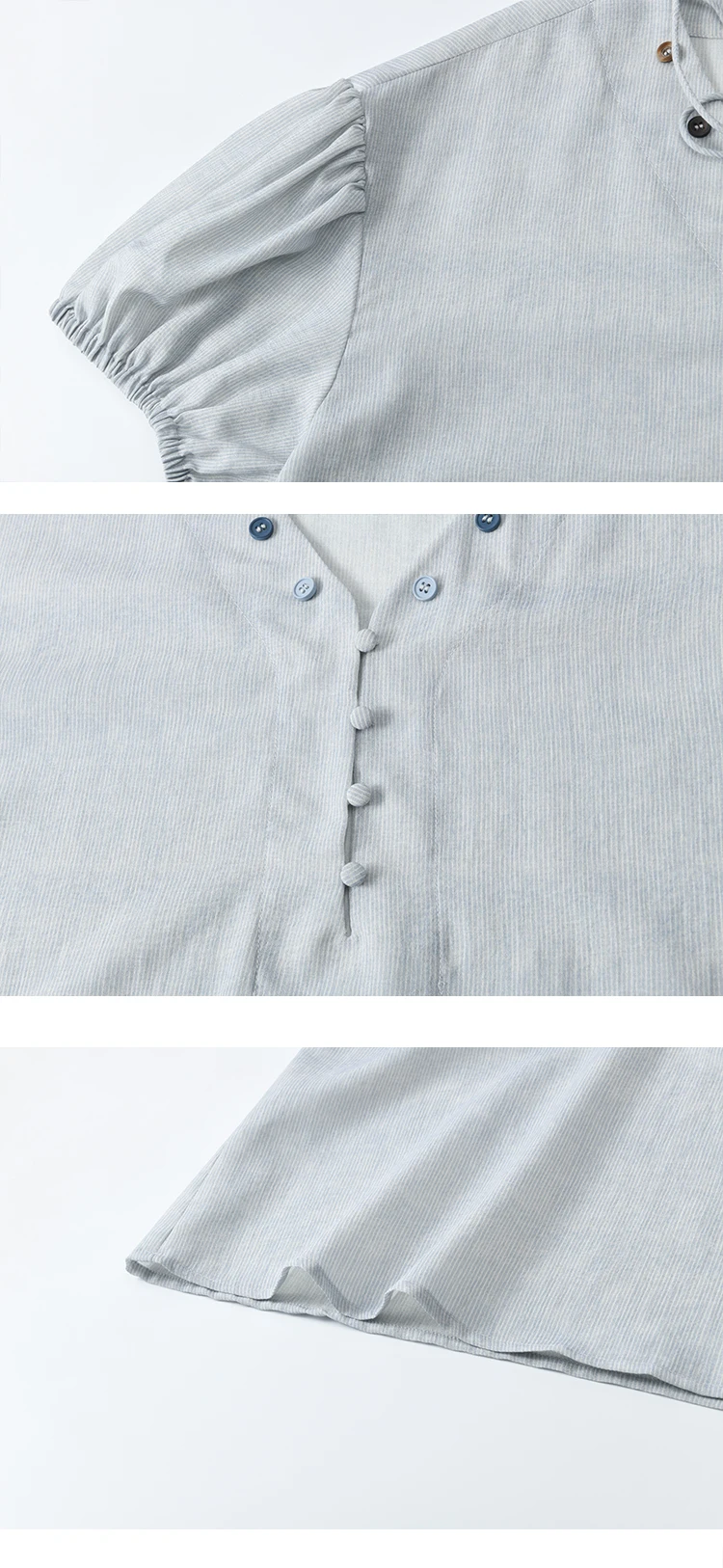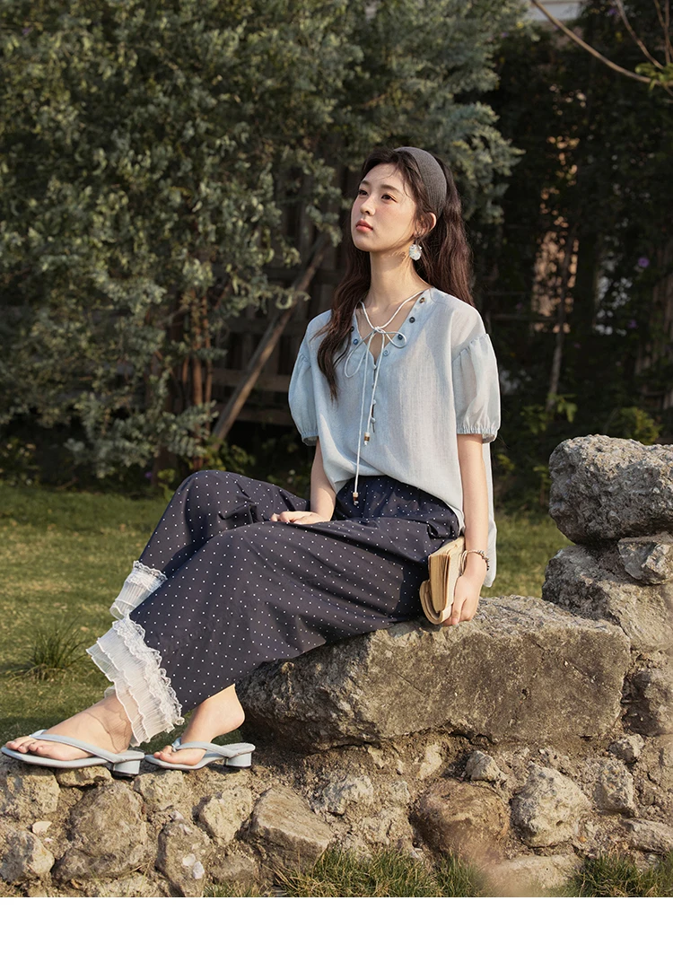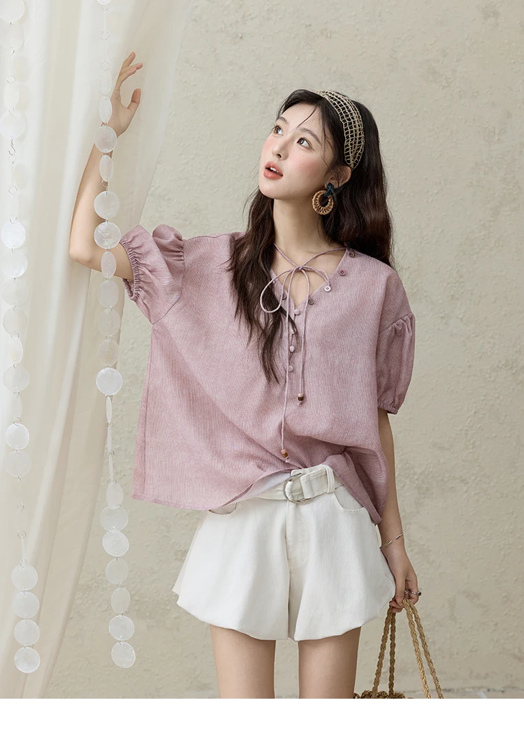 MISHOW French Summer Blouses Women Solid Short Puff Sleeve V-neck Lace-up Design Shirts Female Fashion Straight Tops MXE33X1743