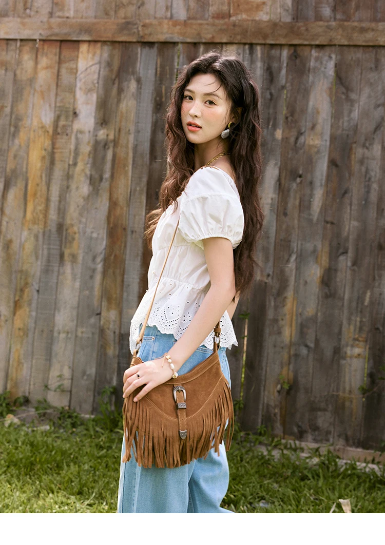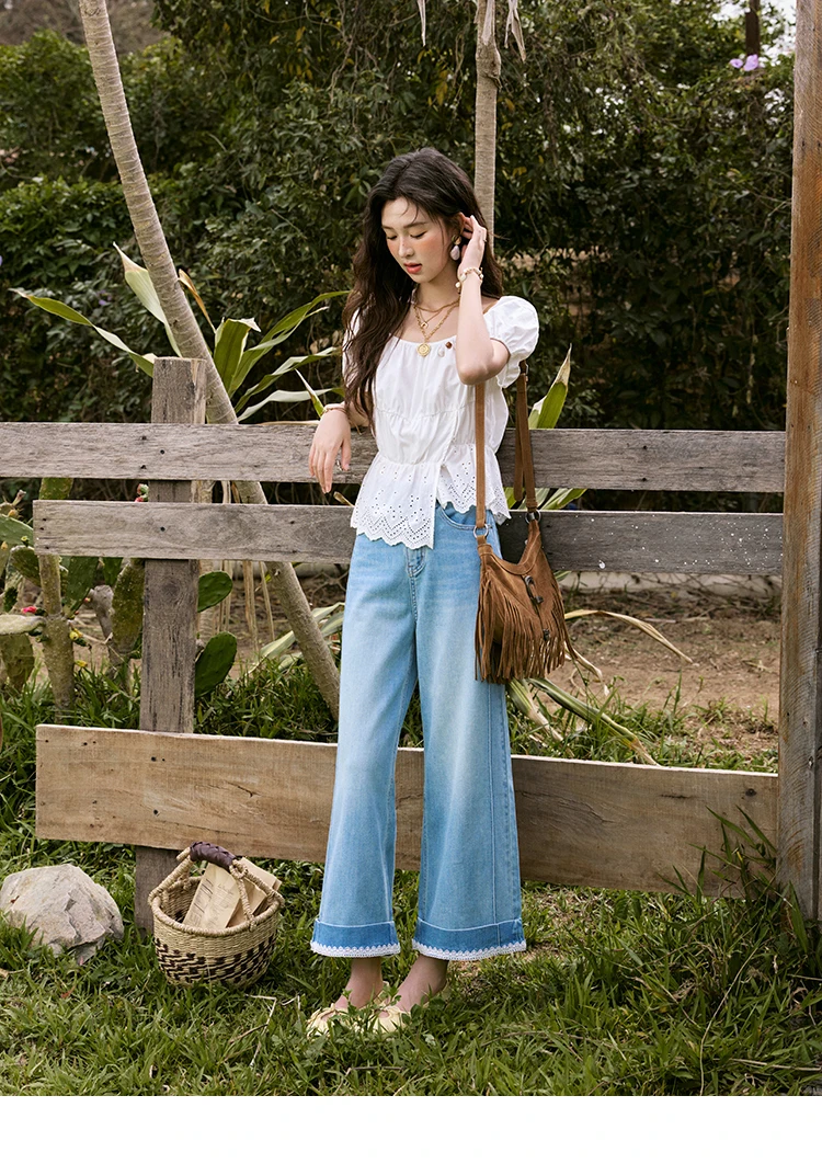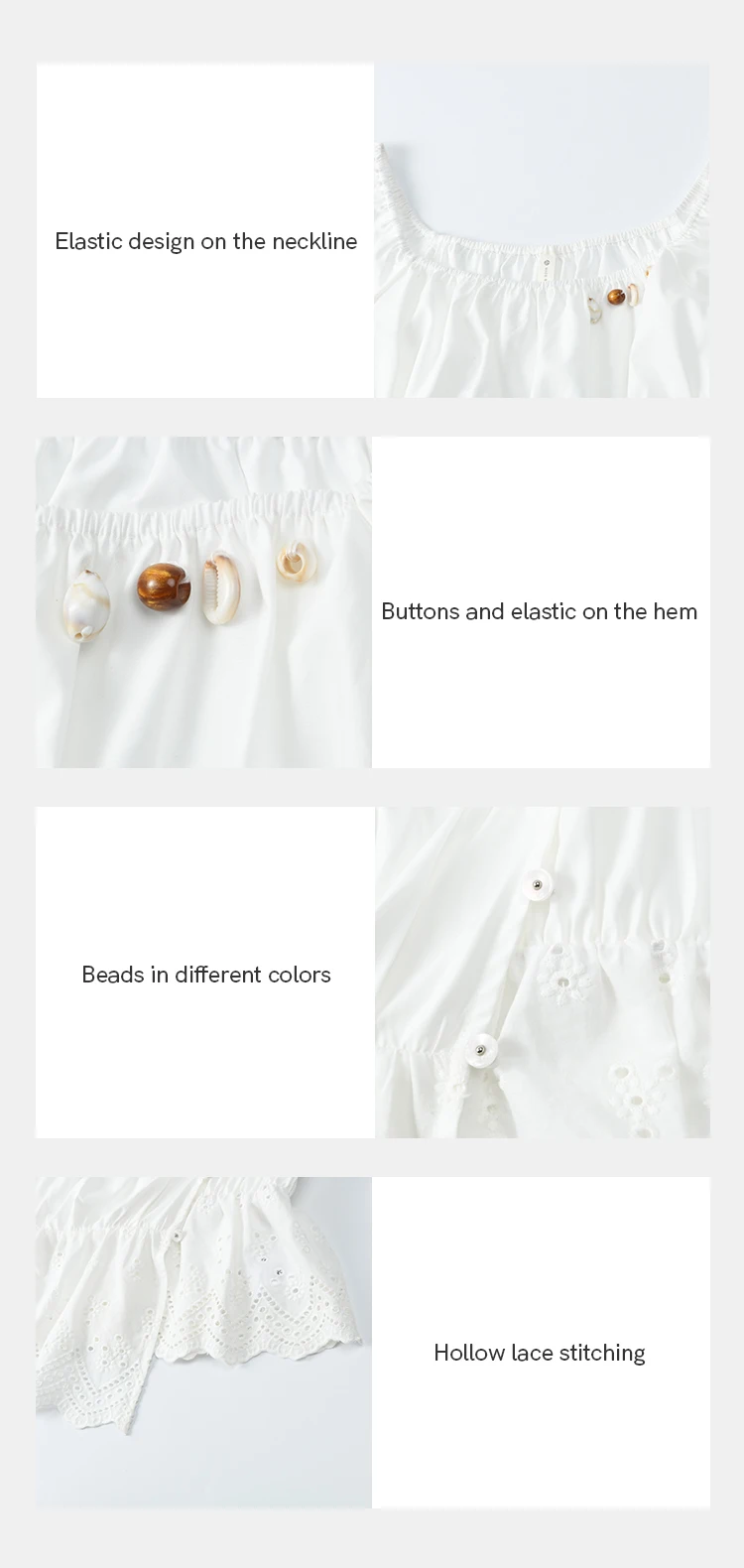 MISHOW French Summer Casual Blouses 2025 Solid Short Puff Sleeve Hem Hollow Cotton Tops Loose Collar Beading Blouse MXE33X1776