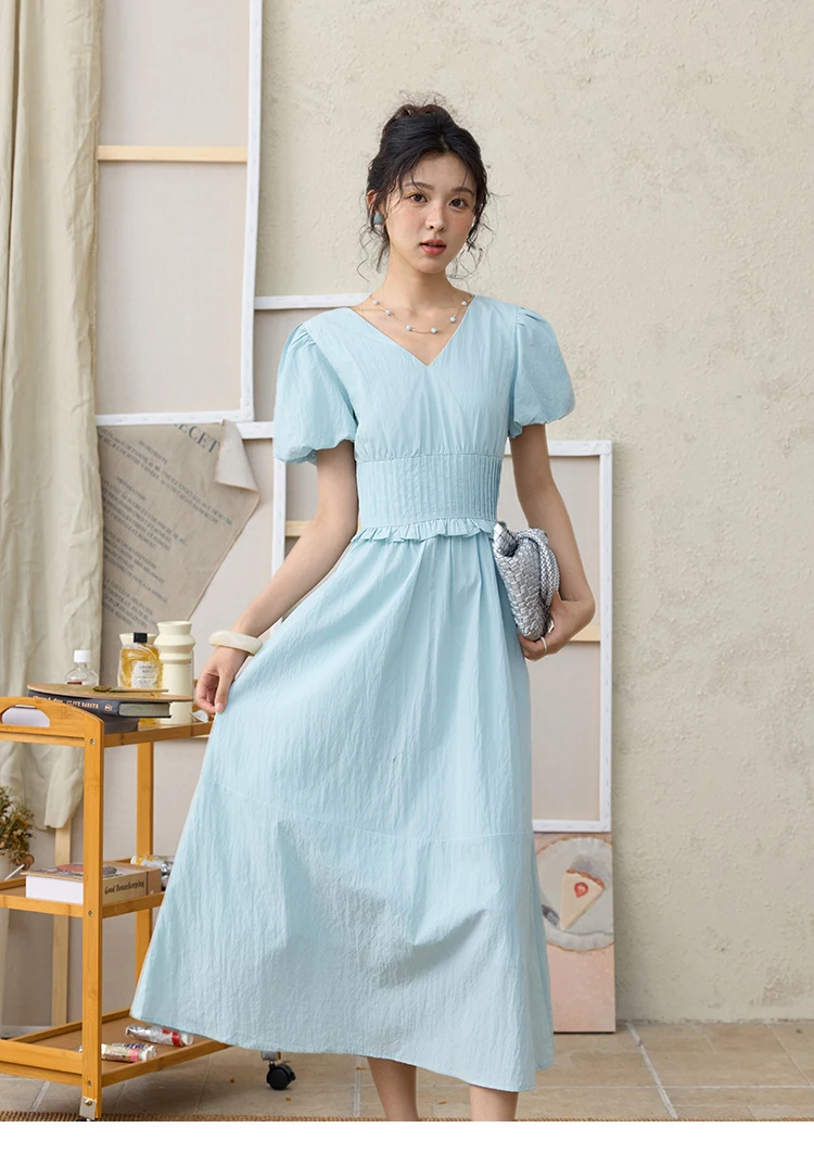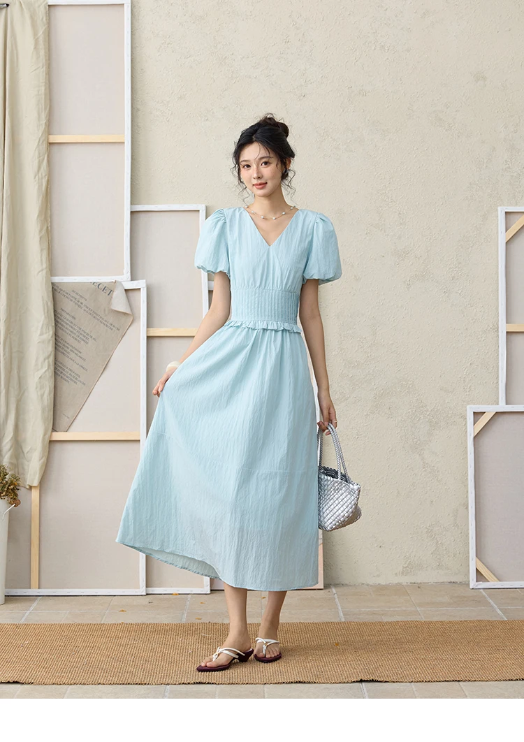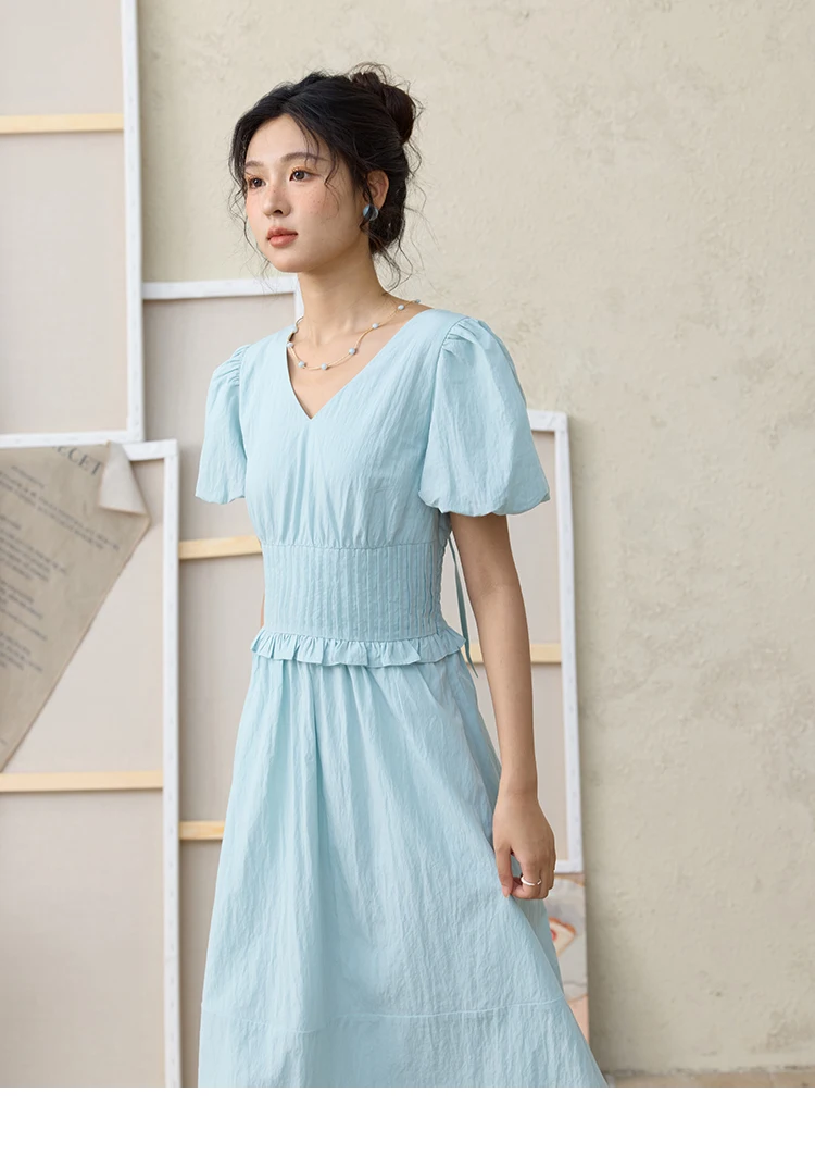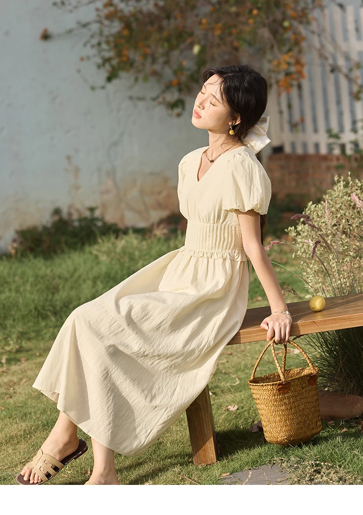 MISHOW French Summer Dresses Women 2025 New Short Puff Sleeve V-neck Solid Cotton Blended Dress Female Slimming MXE34L2288