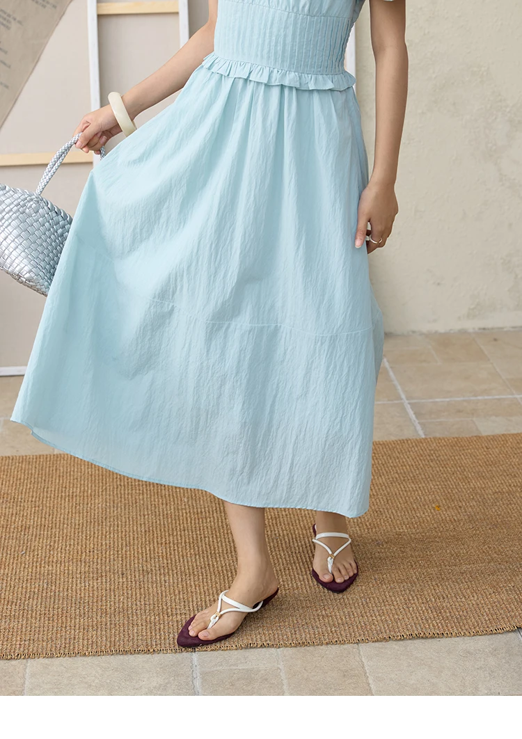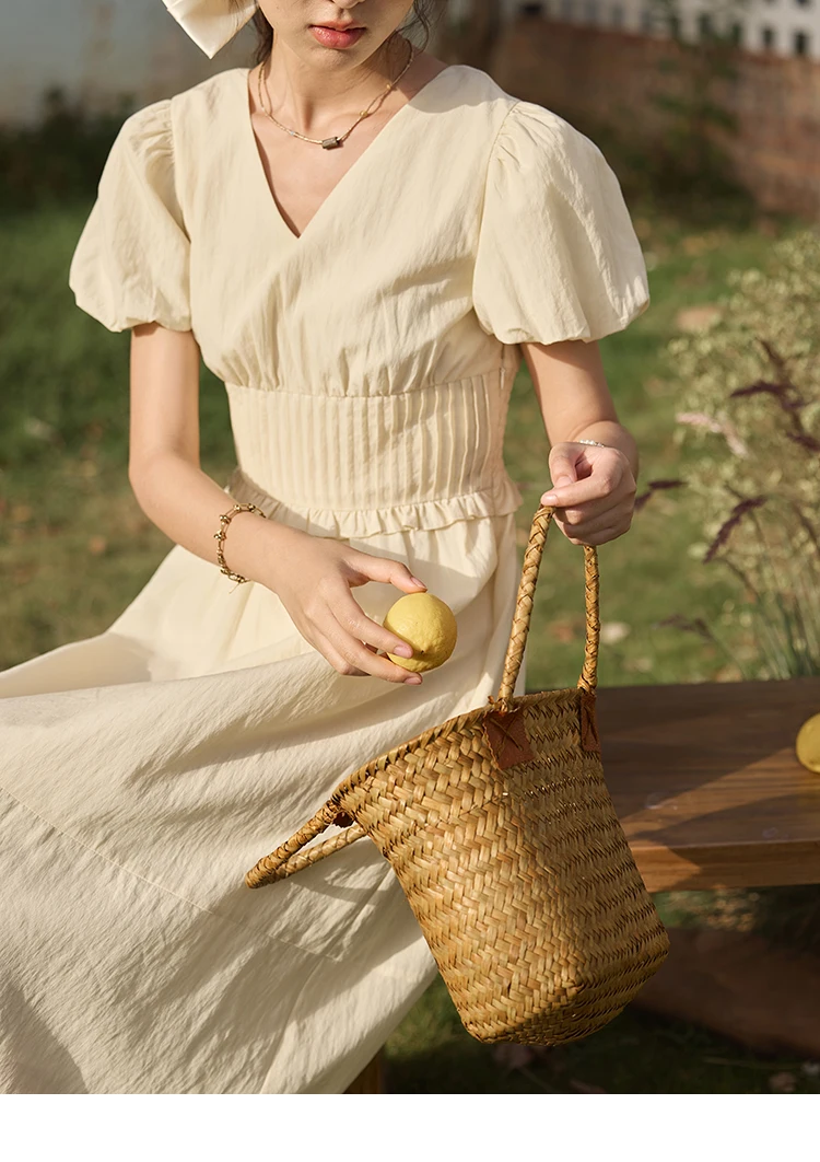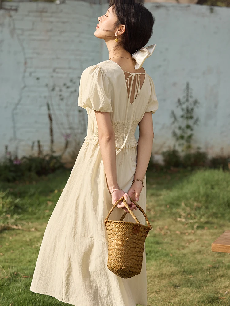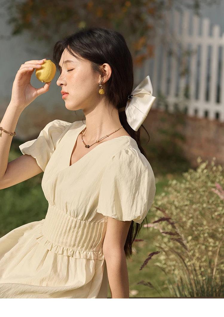 MISHOW French Summer Dresses Women 2025 New Short Puff Sleeve V-neck Solid Cotton Blended Dress Female Slimming MXE34L2288
