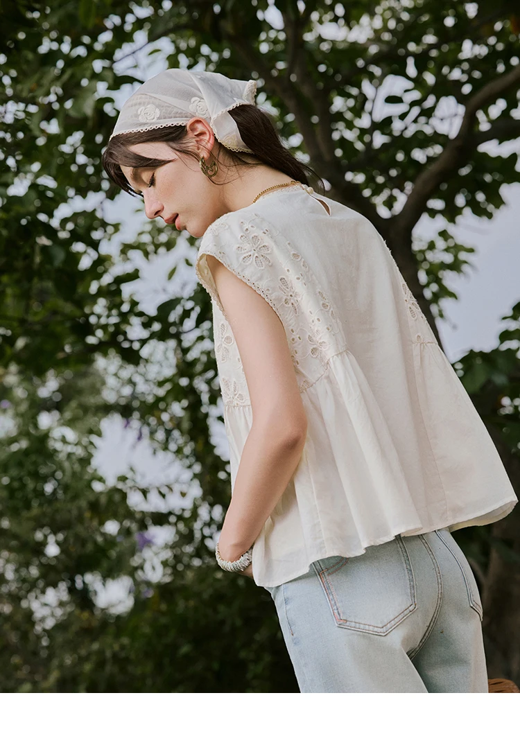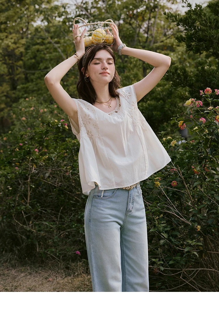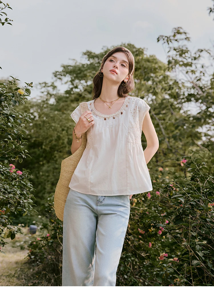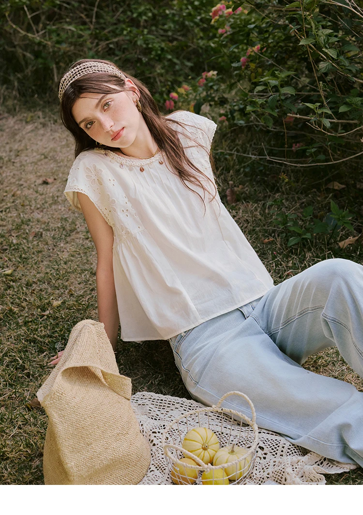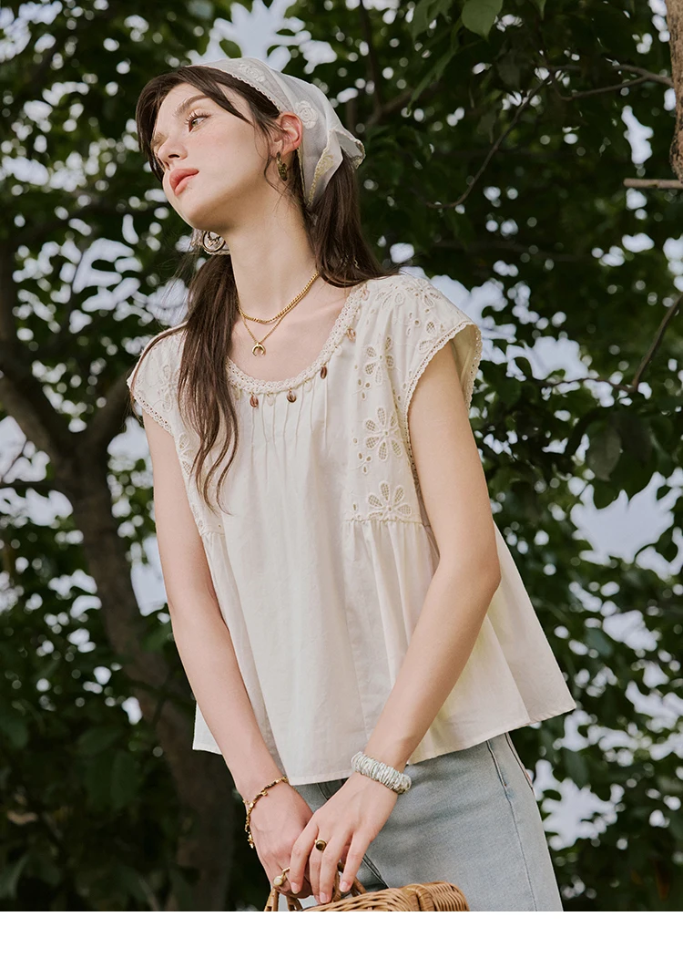 MISHOW French Summer Elegant Blouses Women 2025 Solid Short Flying Sleeve Round Neck Hollow Lace Shirts Woman Fashion MXE33X1778