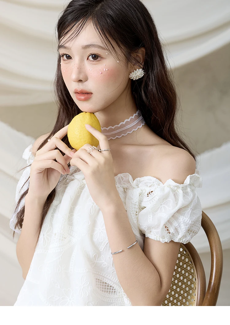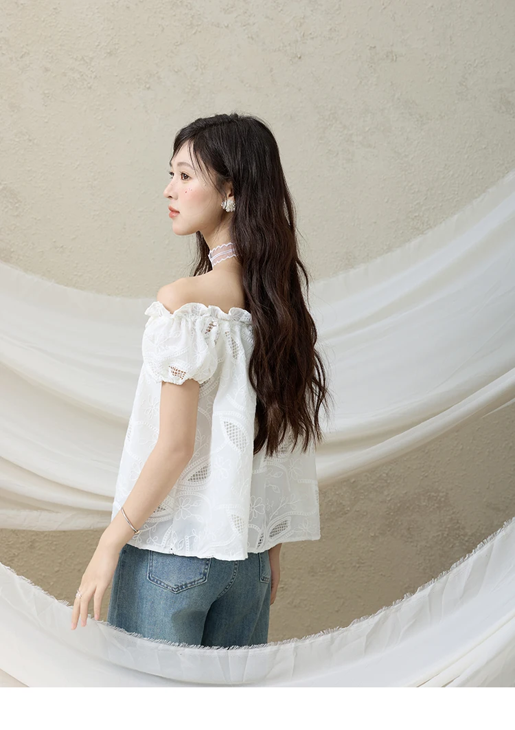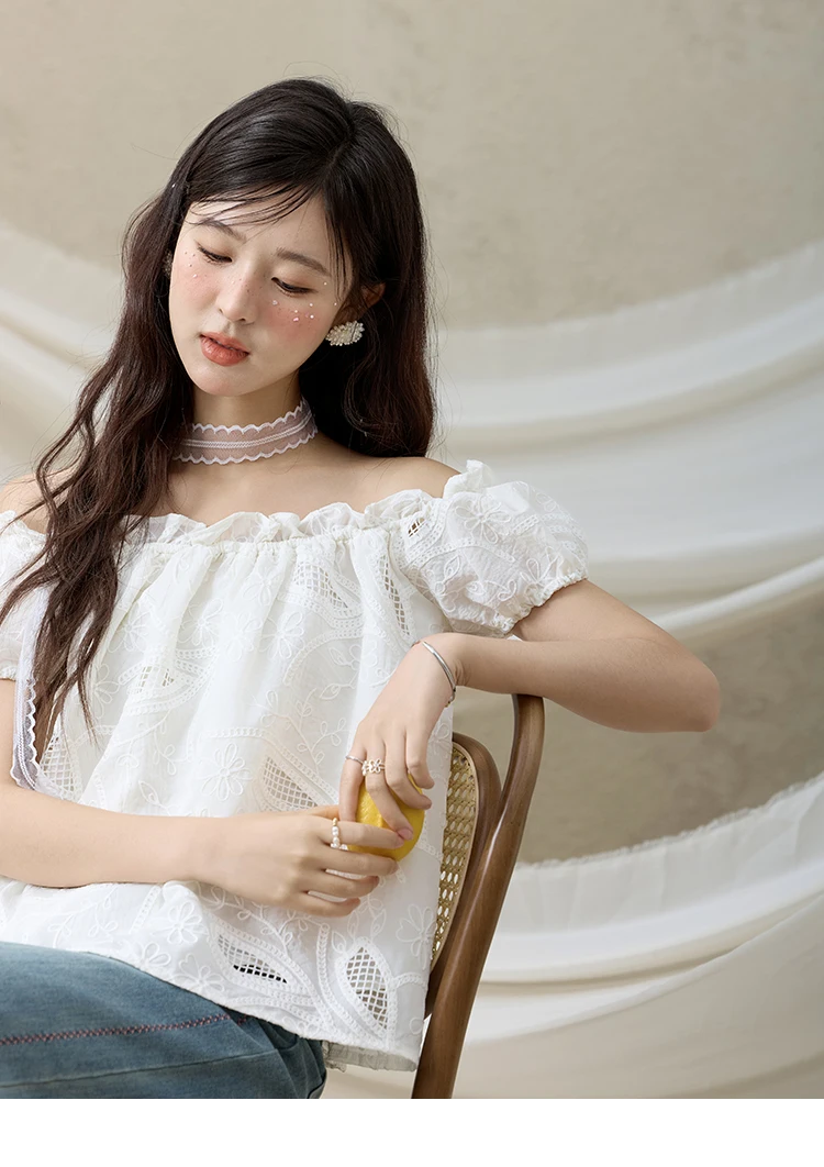 MISHOW French Summer Shirts Women New 2025 Slash Neck Short Sleeve Solid Lace Blouses Female Fashion Slim Tops Lady MXE35X1775
