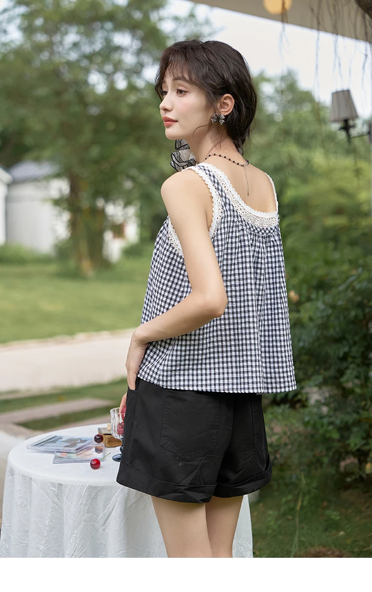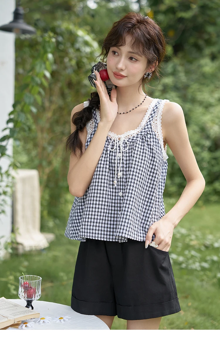 MISHOW French Sweet Lace Plaid Suspender Vest Women 2025 Summer Loose Fit U Neck Lace-up Blouses Sleeveless Doll Top MXD26X1567