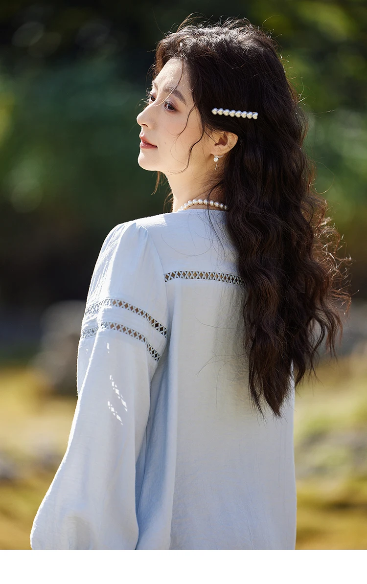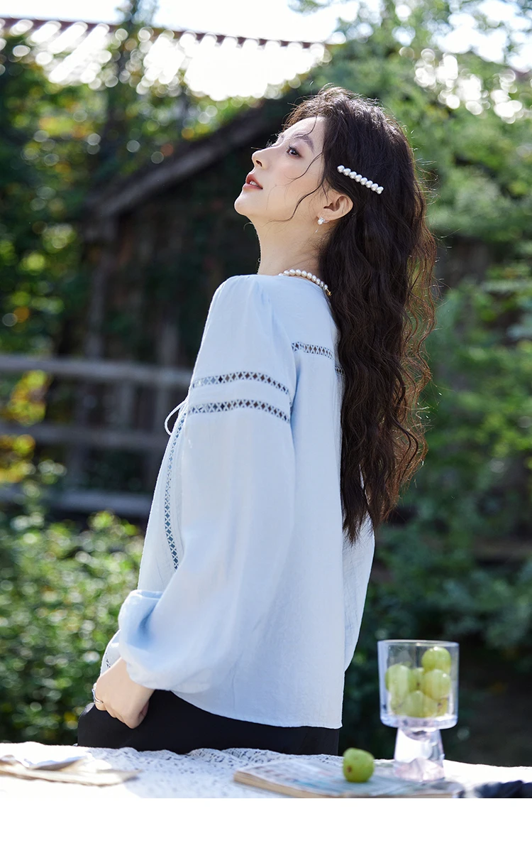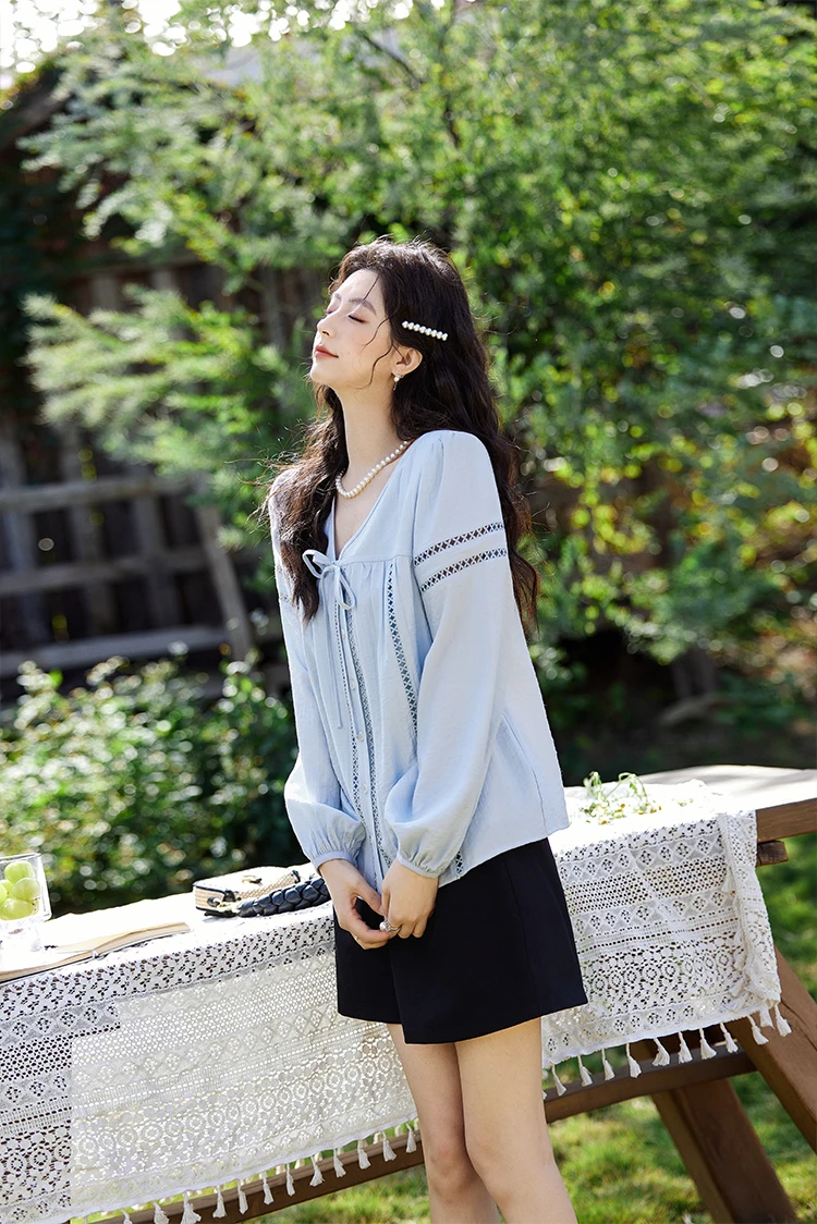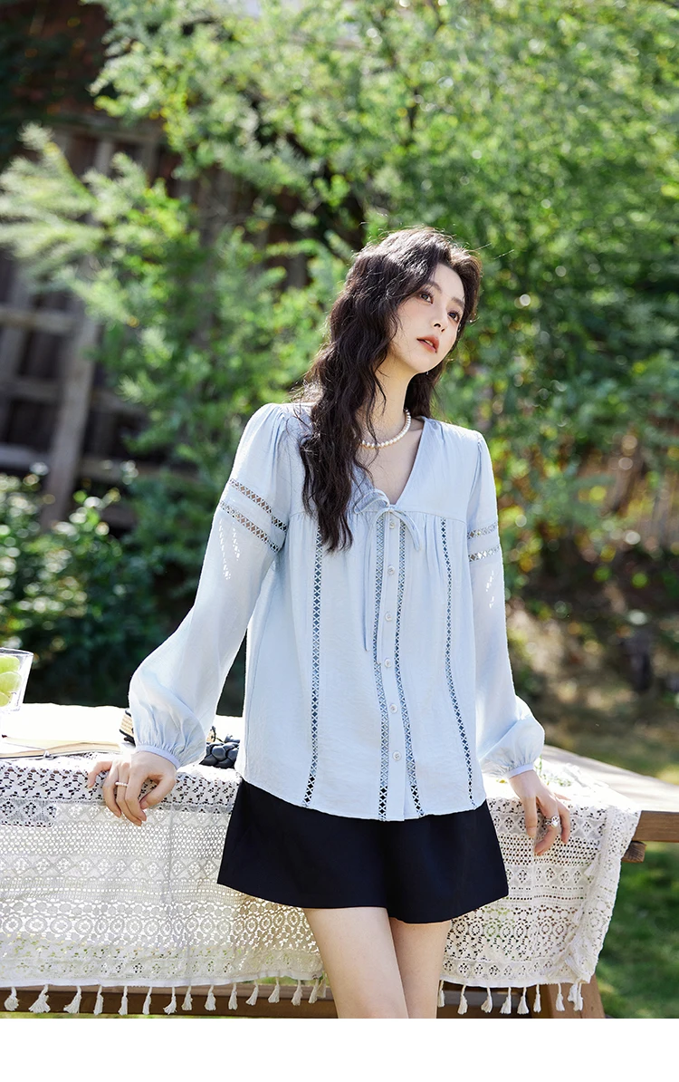MISHOW French Sweet Loose Blue Shirt for Women 2025 Spring Summer V-neck Lace-up Hollow Doll Shirt Lantern Sleeve Top MXE12C0411