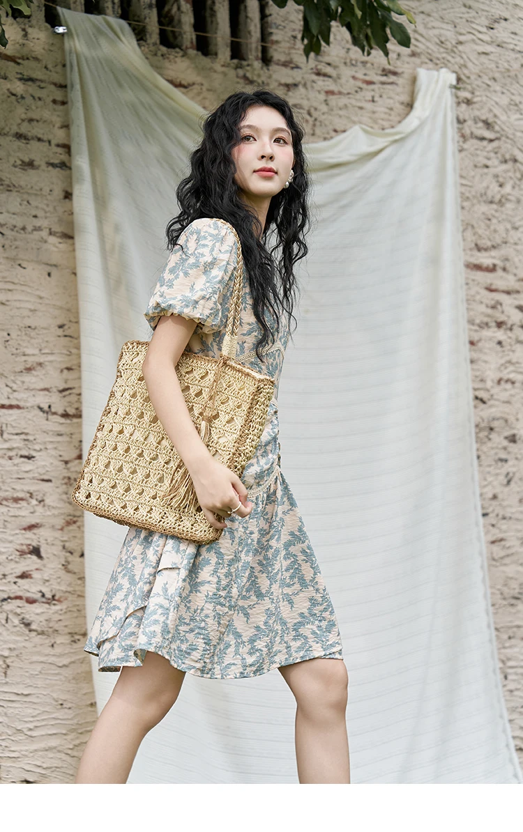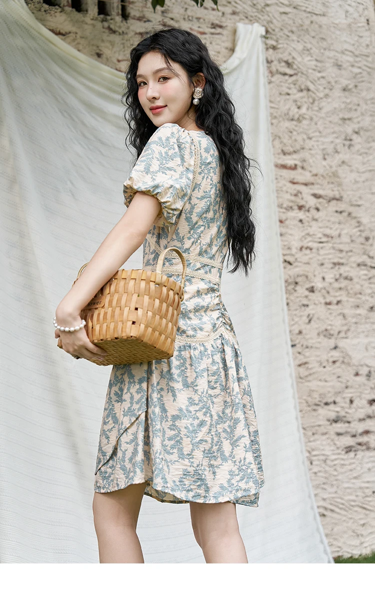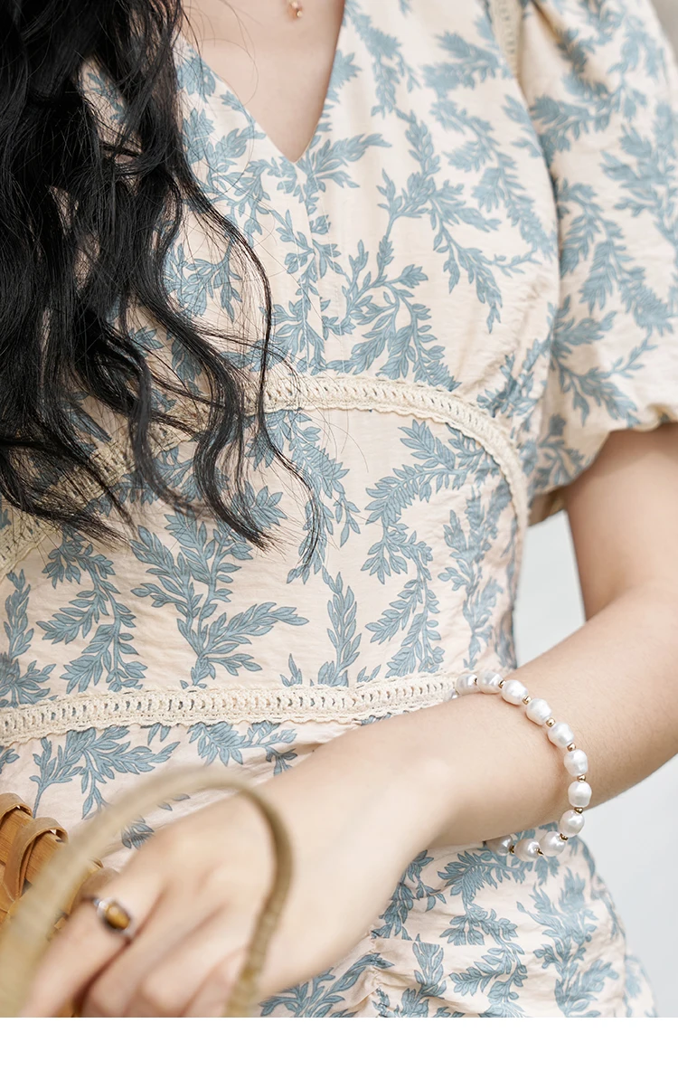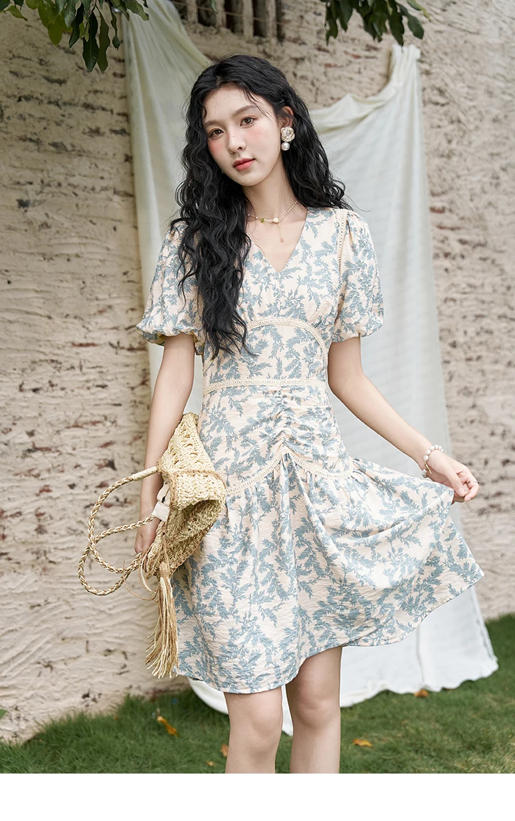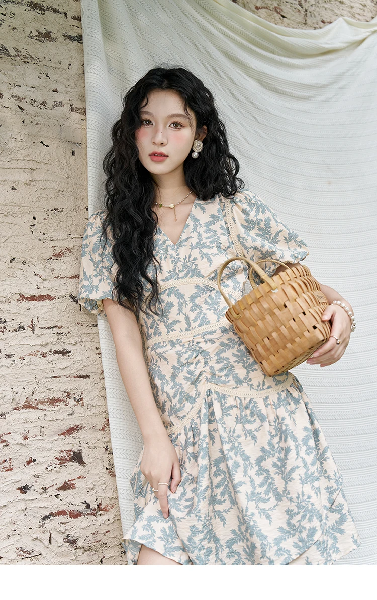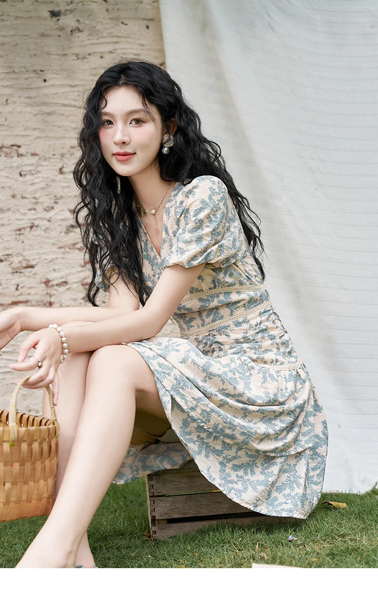 MISHOW French Vintage V-neck Dress 2024 Summer Waist Bubble Sleeve Slim Dress Fragmented Flower Splicing Lace Dresses MXD24L1730