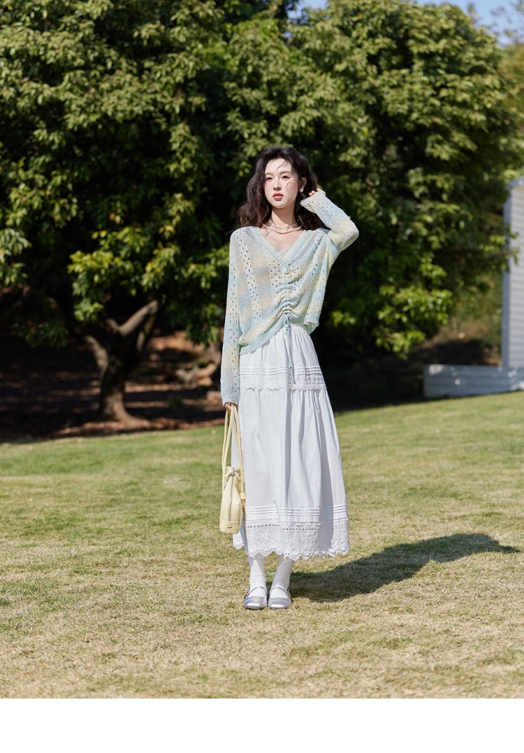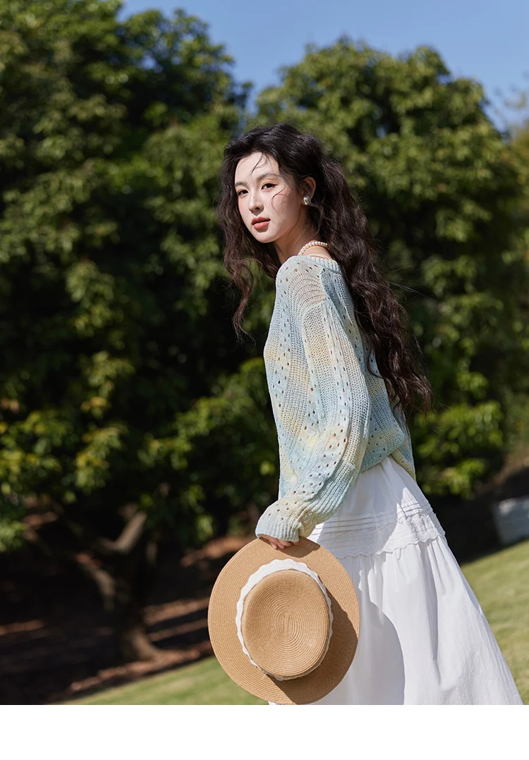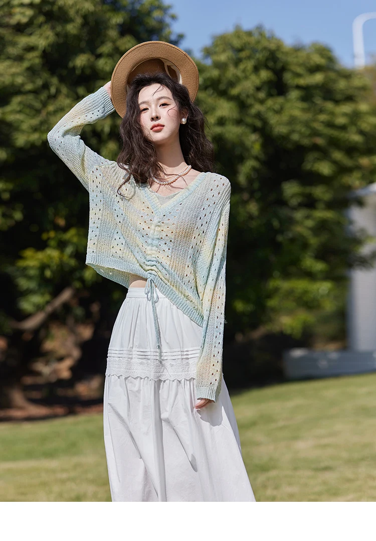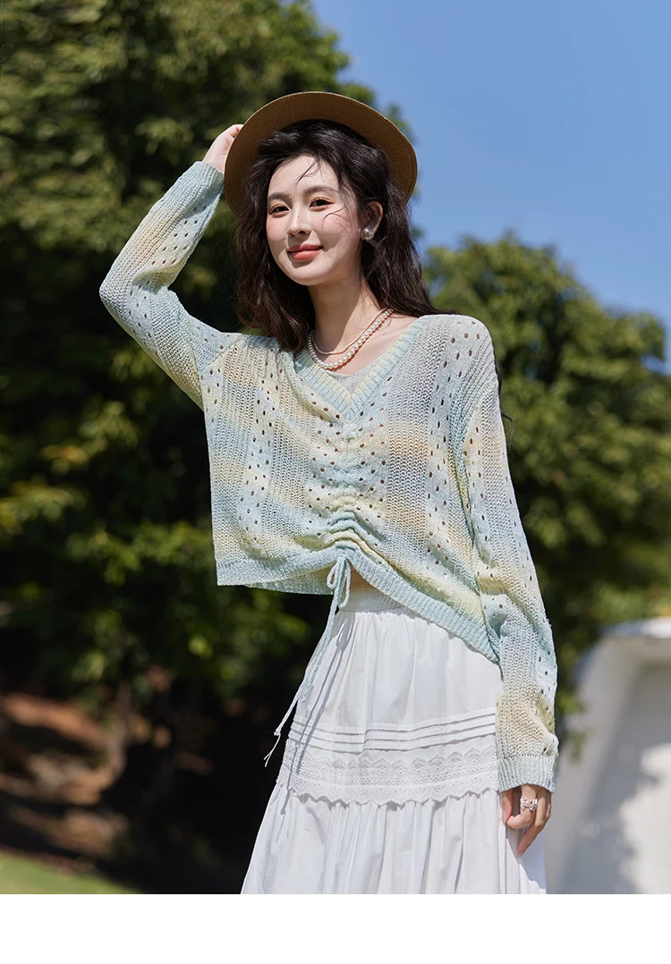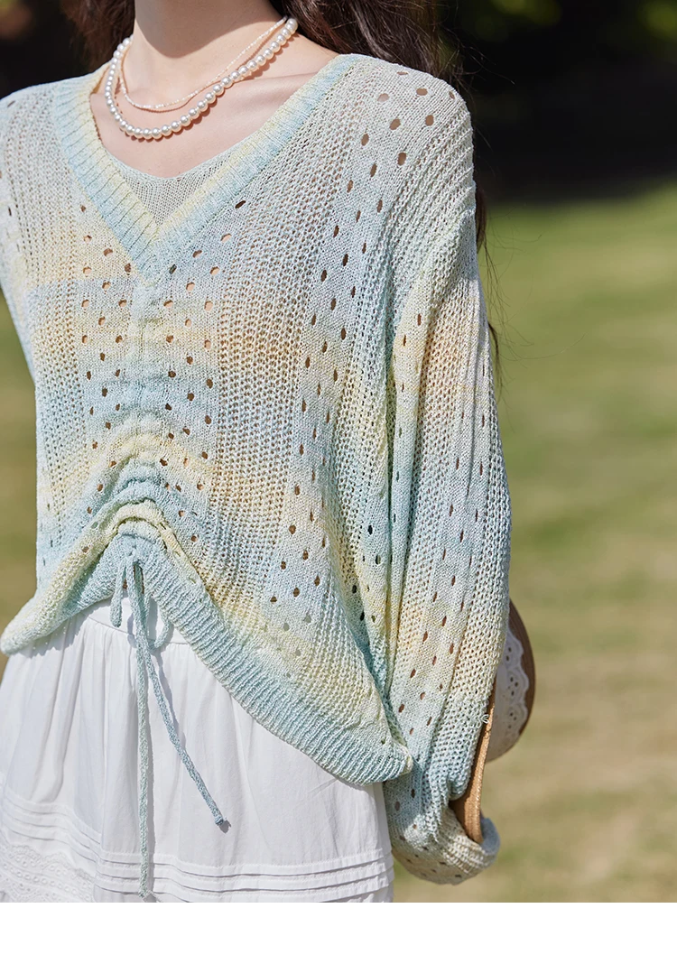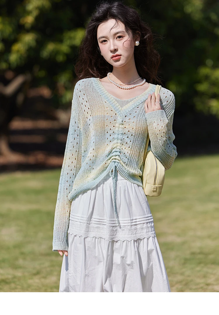 MISHOW Gradient Blue Green Knitted Sweater Women 2025 Autumn Long Sleeve V-neck Drawstring Tops New Fashion Sweaters MXE16Z1171
