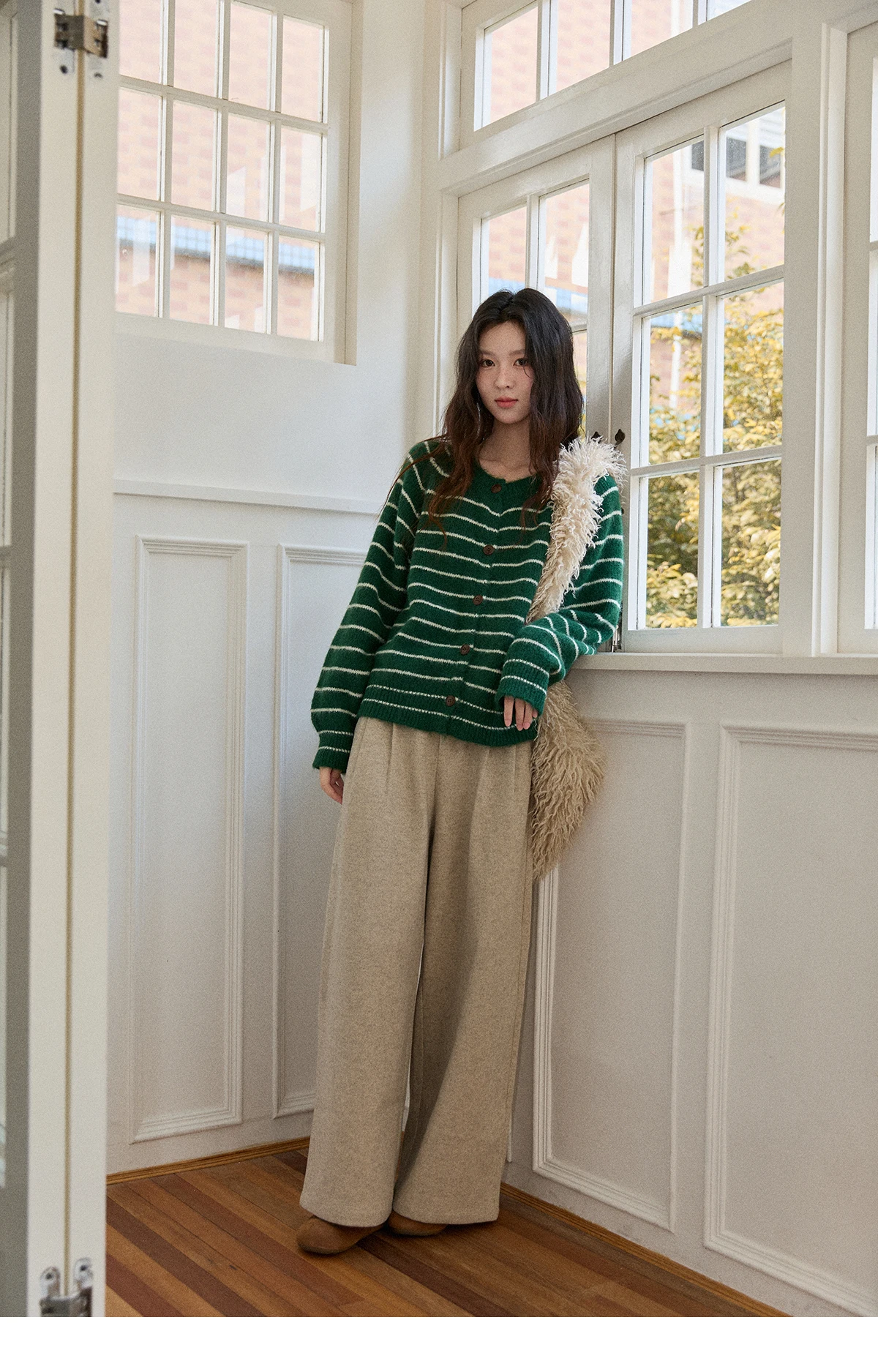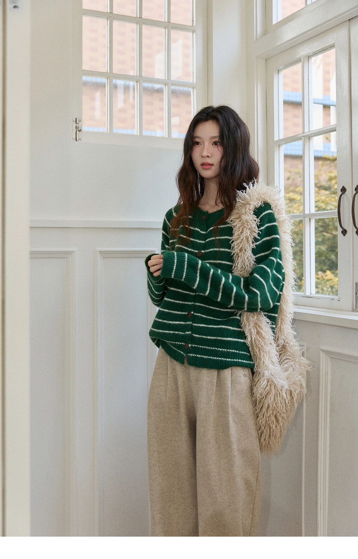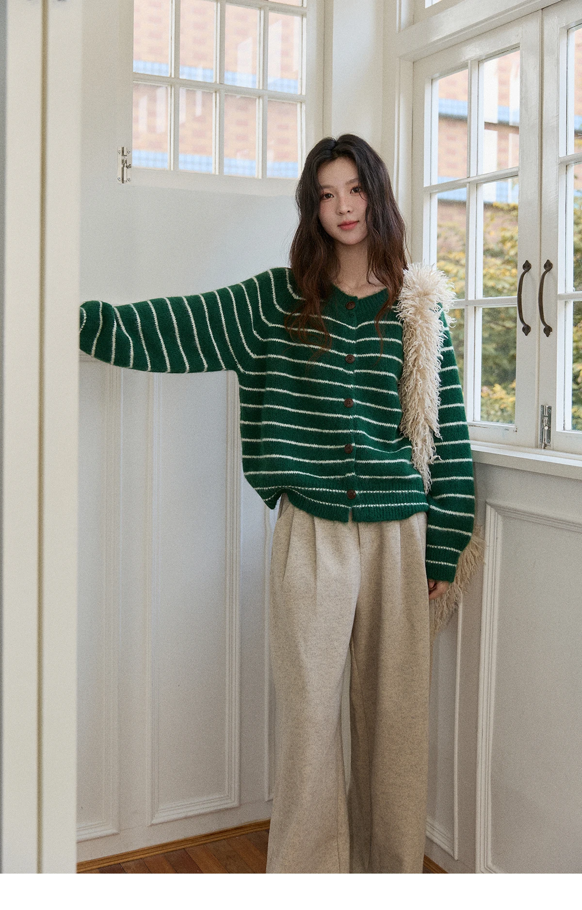 MISHOW Green Striped Cardigans for Woman 2025 Winter Knitted Cardigan Wool Blend Loose Retro Crew Neck Knit Sweater MXE86Z2735