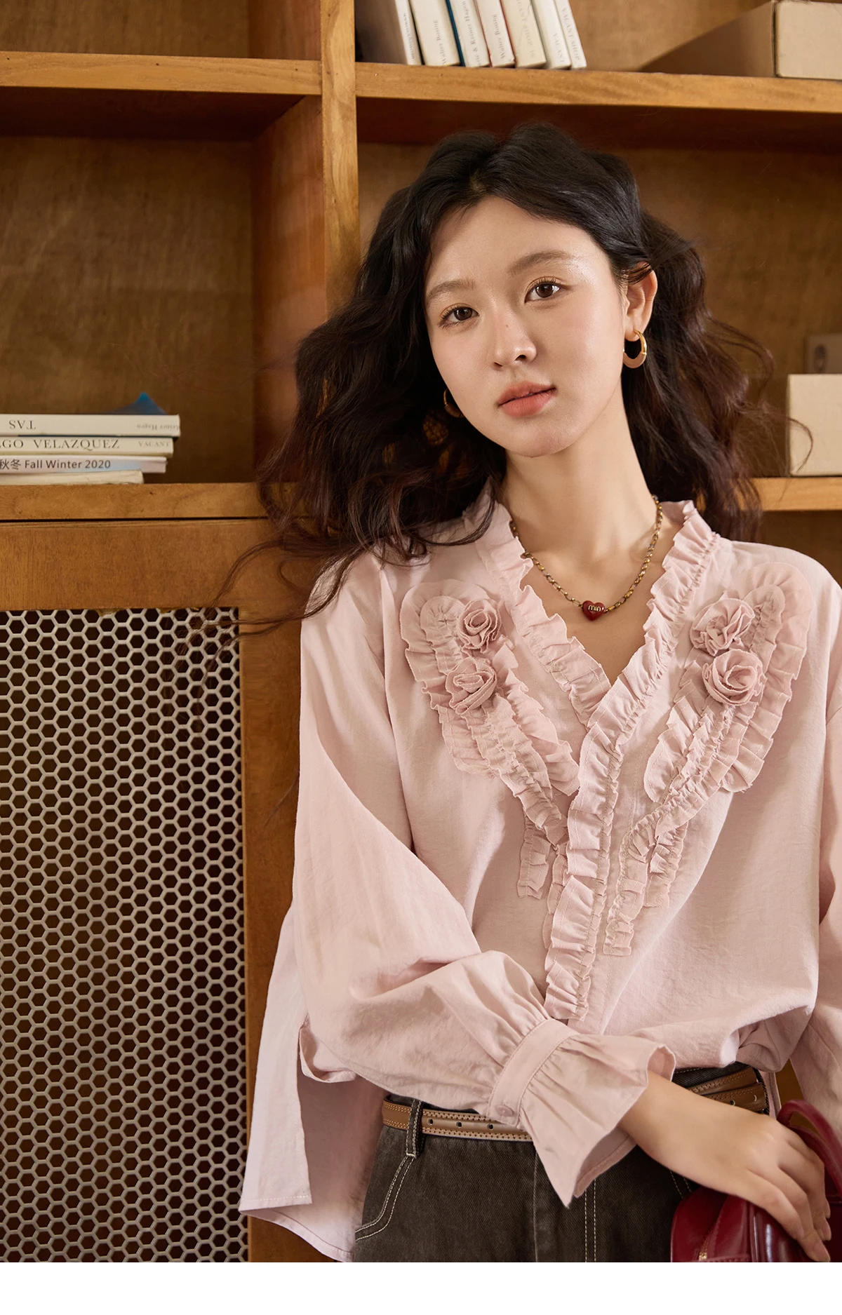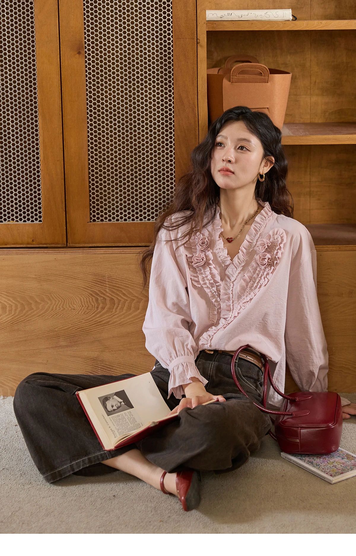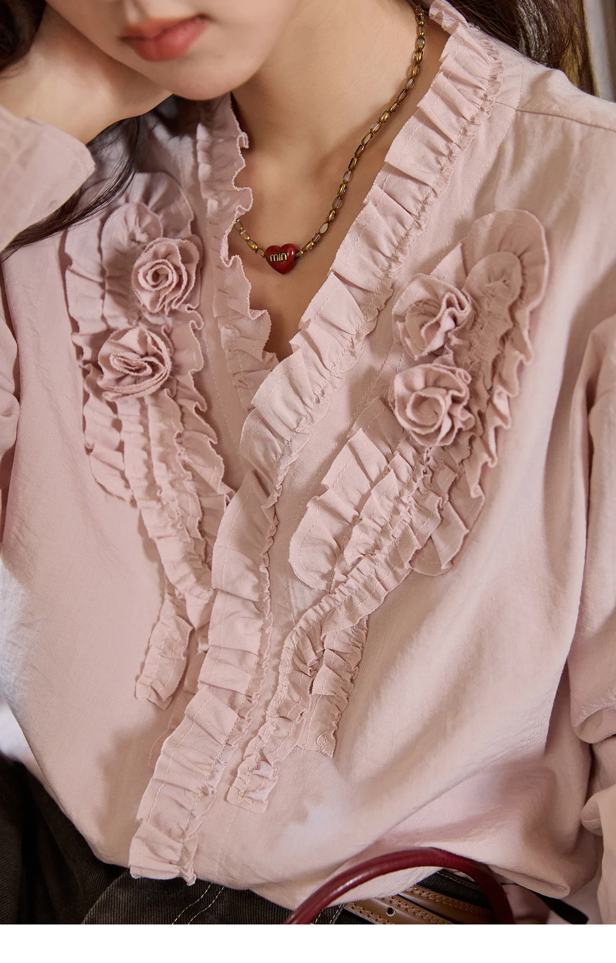 MISHOW Hand Sewn Rose Blouse for Women Autumn 2025 V-neck Edible Tree Fungus Edge Tops Sweet Lantern Sleeves Blouses MXE44X2470