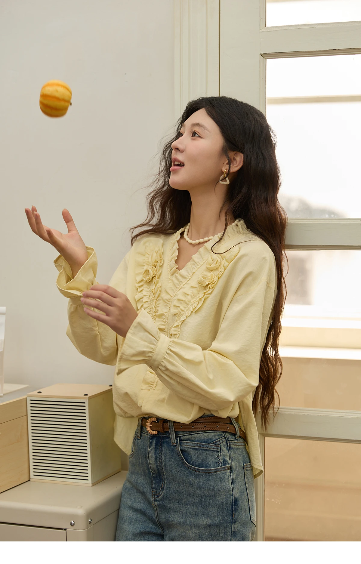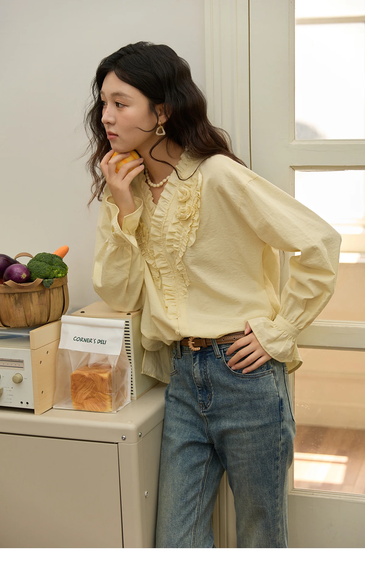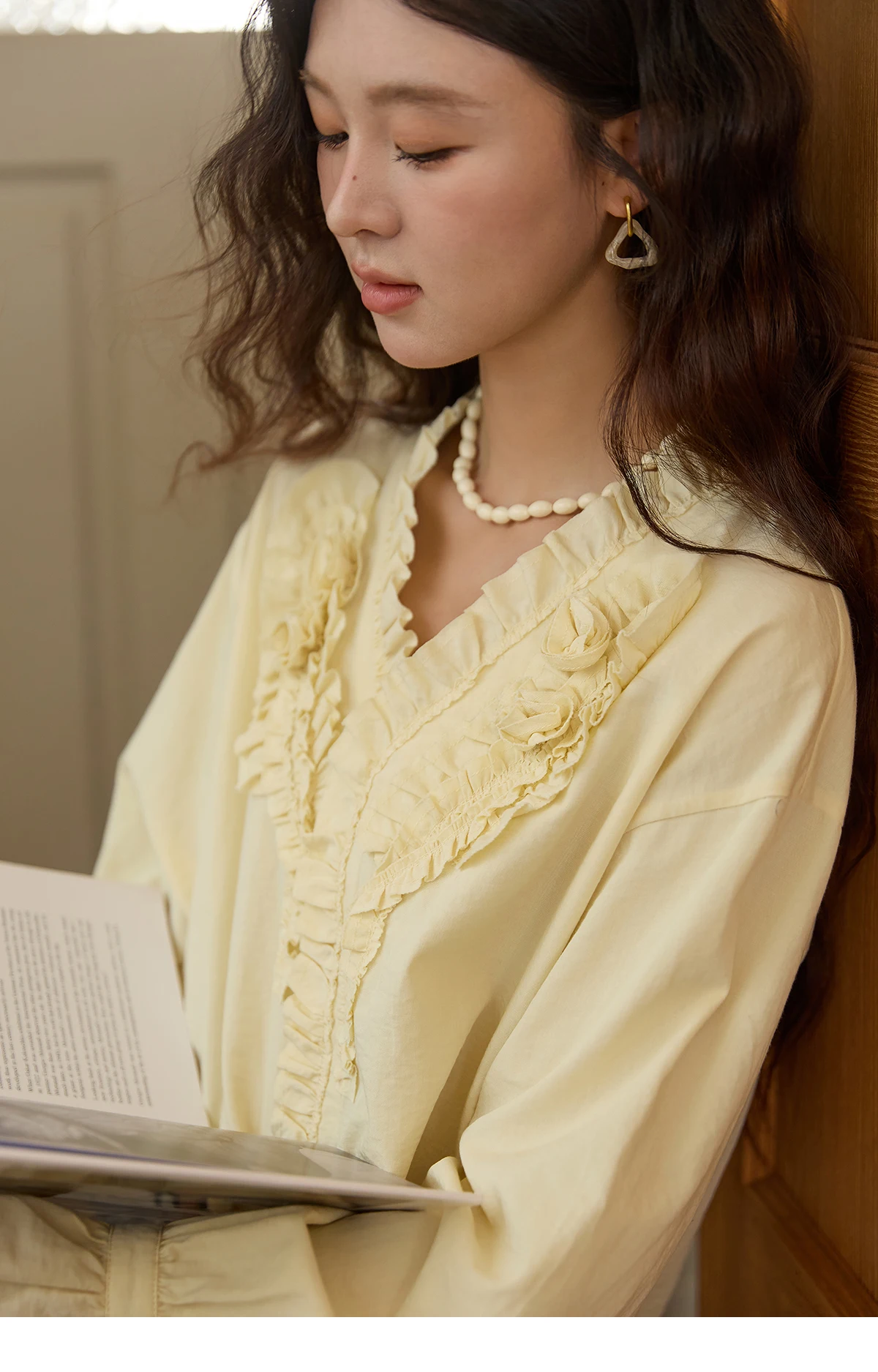 MISHOW Hand Sewn Rose Blouse for Women Autumn 2025 V-neck Edible Tree Fungus Edge Tops Sweet Lantern Sleeves Blouses MXE44X2470