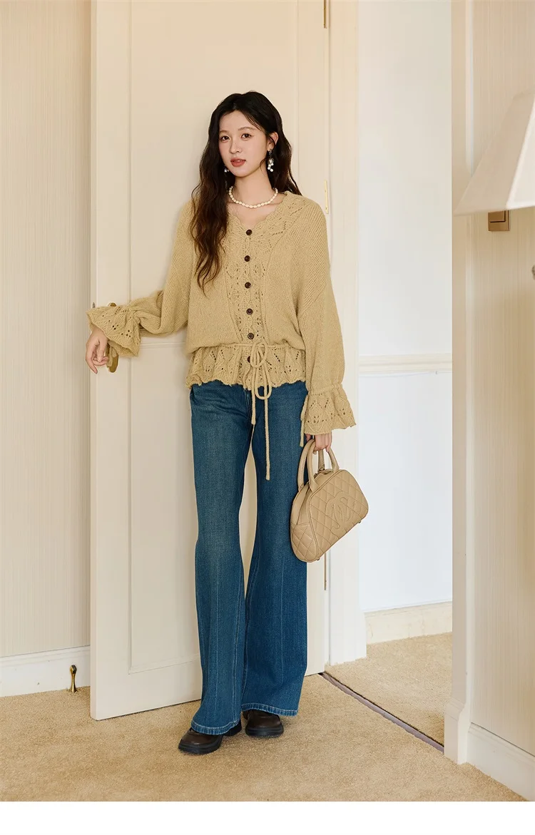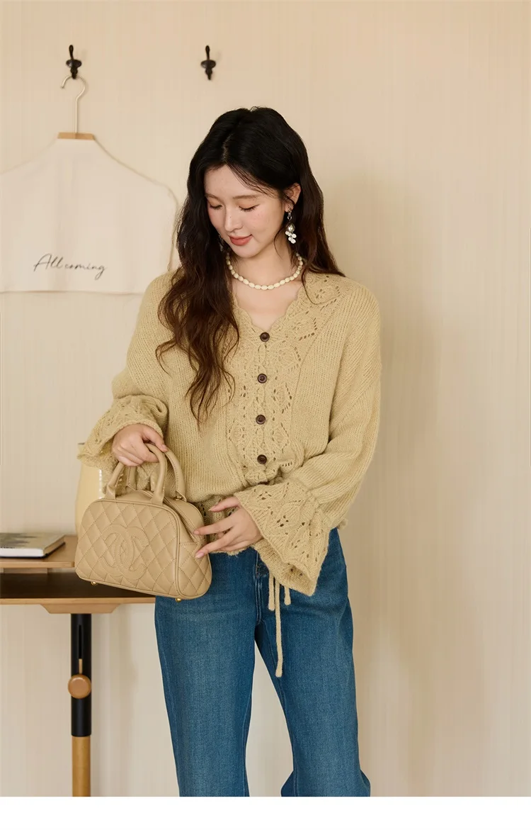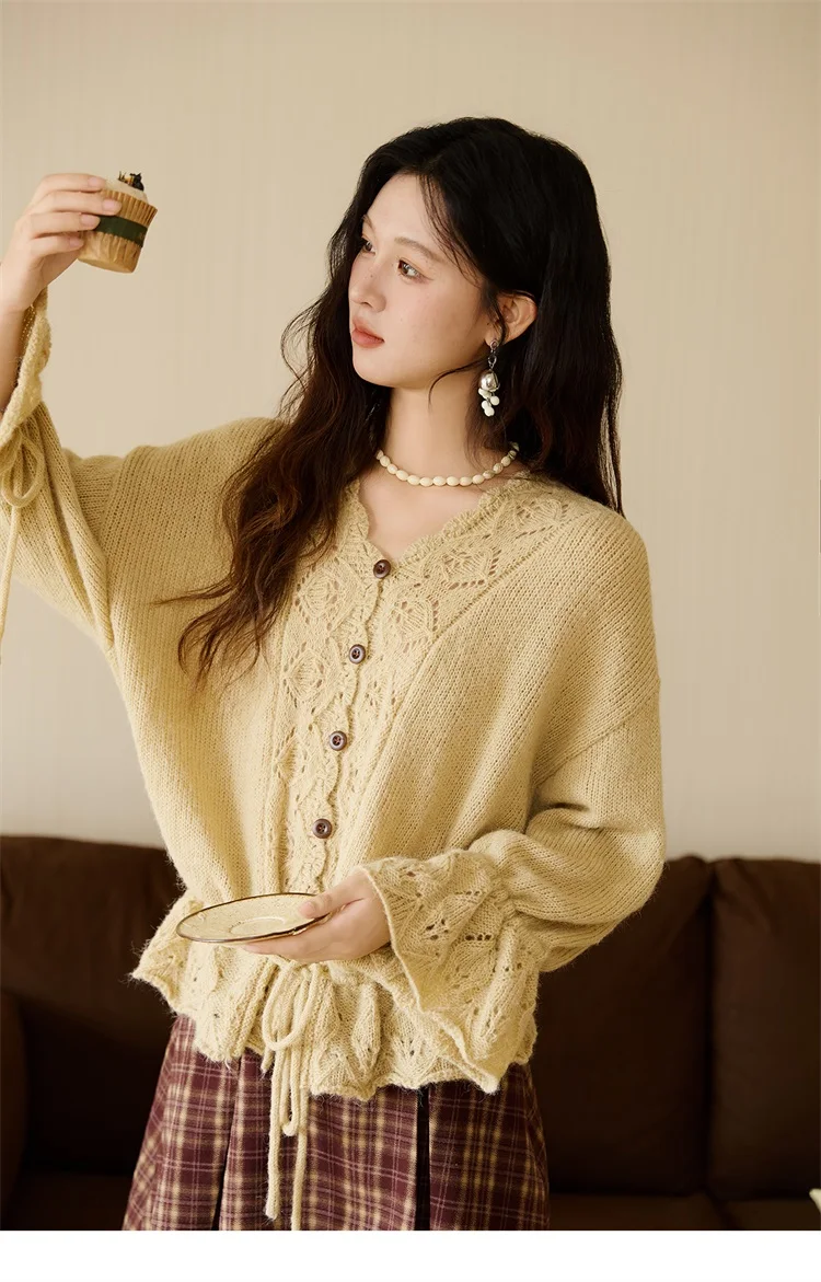MISHOW Handmade Crochet Sweater Cardigan Autumn Mohair Flare Sleeve Knitted Tops Wave V-neck Lace-up Waist Sweater MXE47Z2513