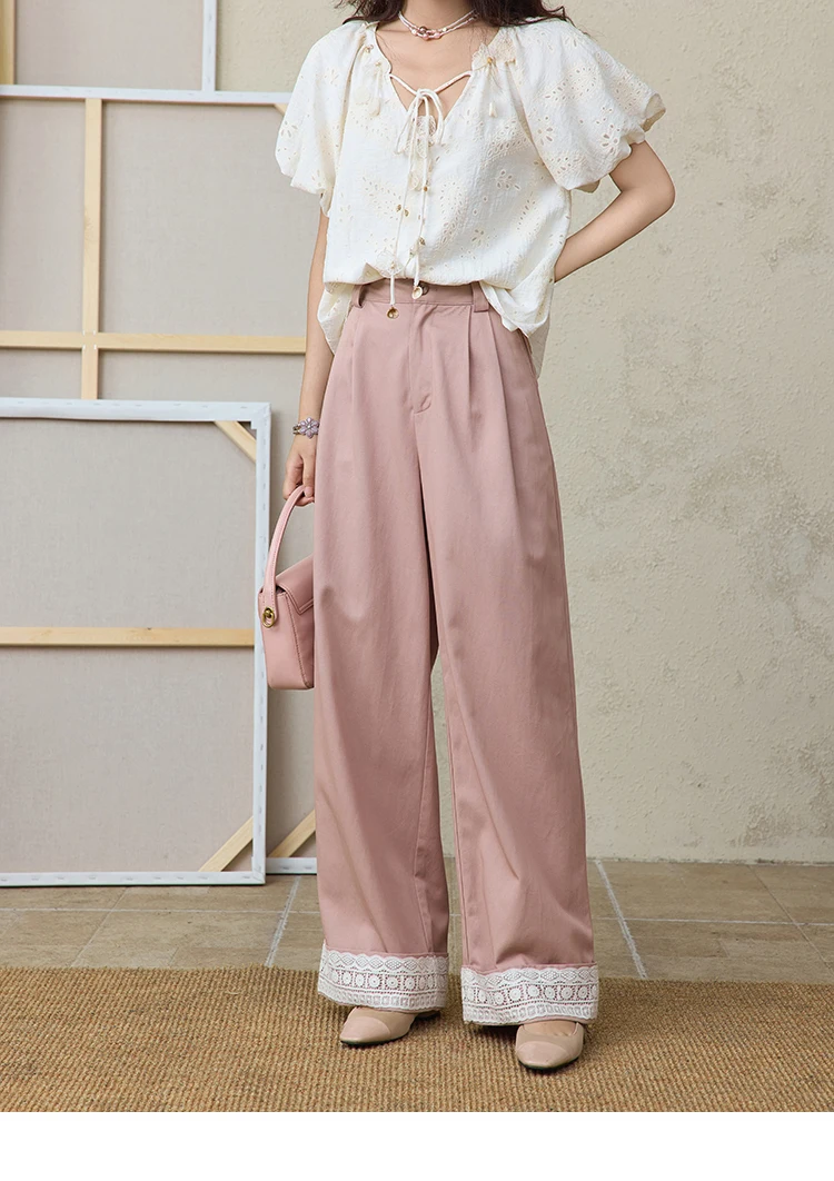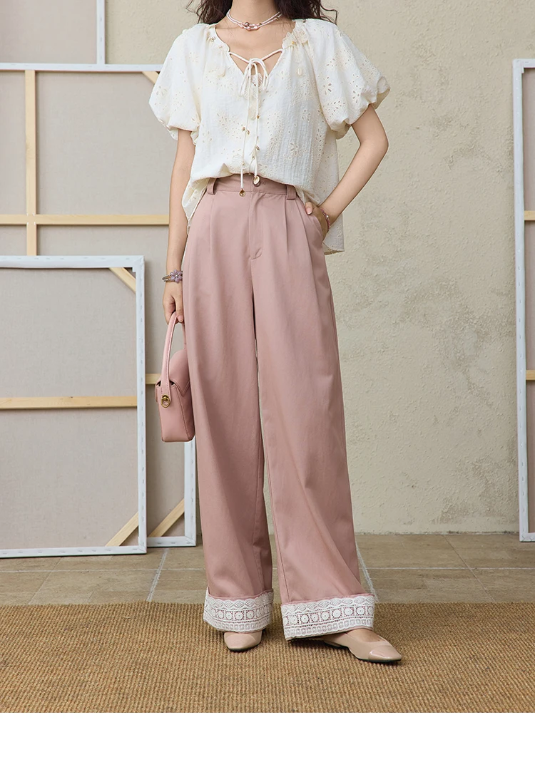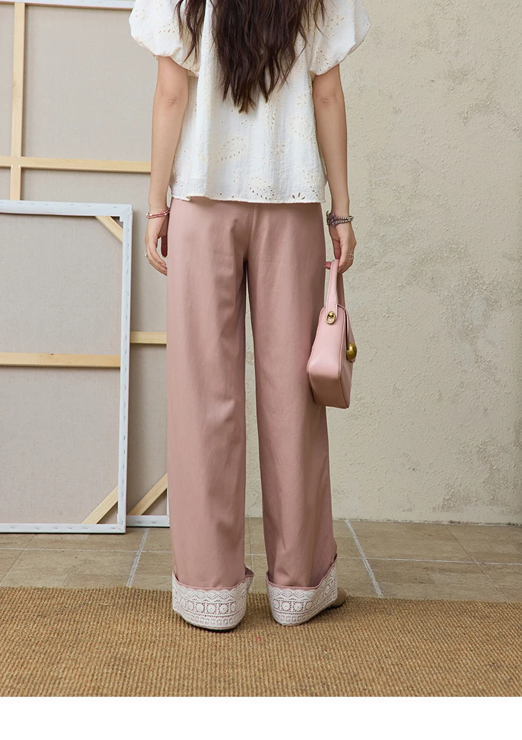 MISHOW Hem Lace Hollow Out Wide Leg Pants for Women Summer 2025 High Waist Loose Pink Pants Straight Leg Trousers MXE31K0900