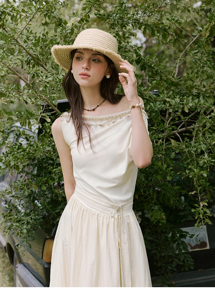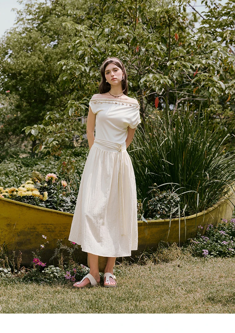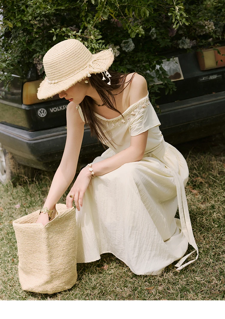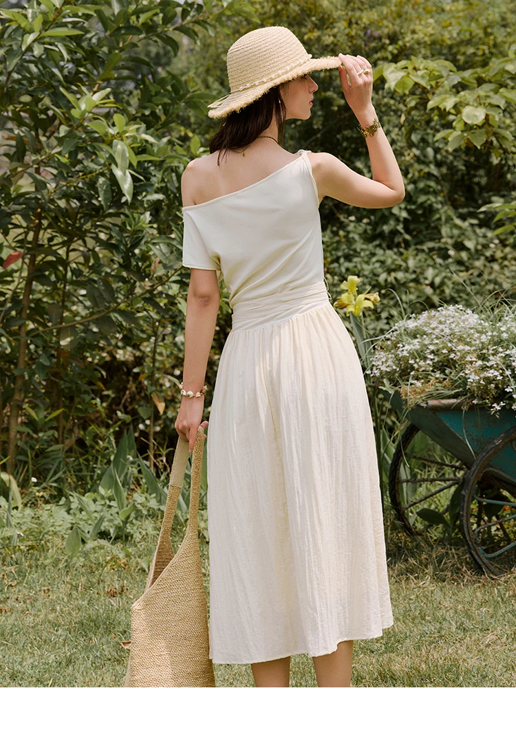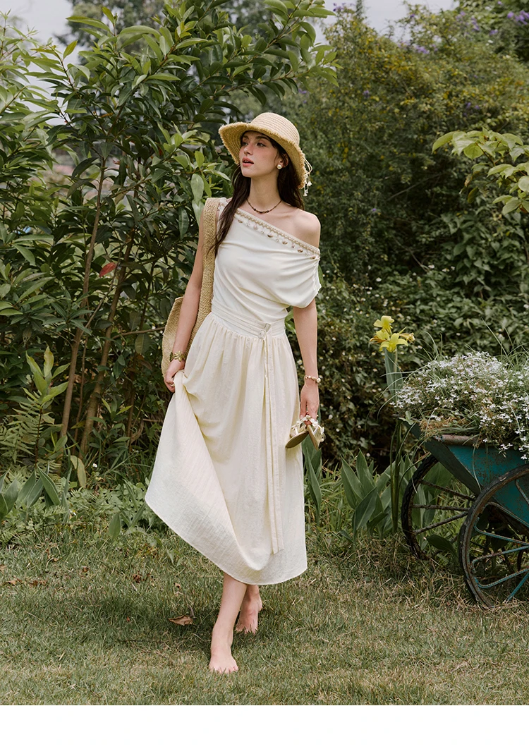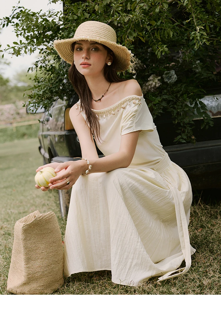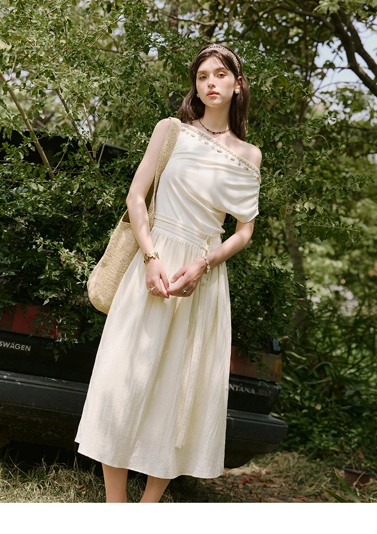 MISHOW Holiday Summer Dresses Women 2025 New Short Sleeve Shell Webbing Oblique Collar Slim Midi Dress Female Fashion MXE31L2189