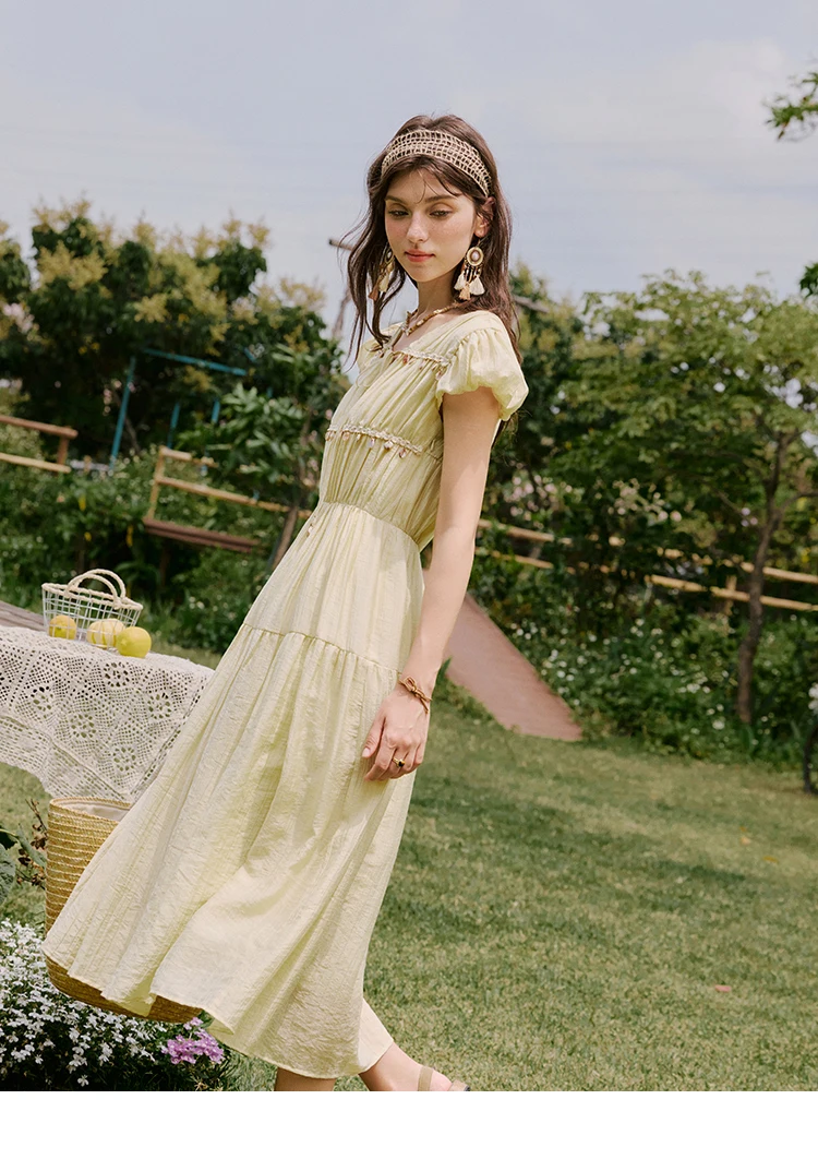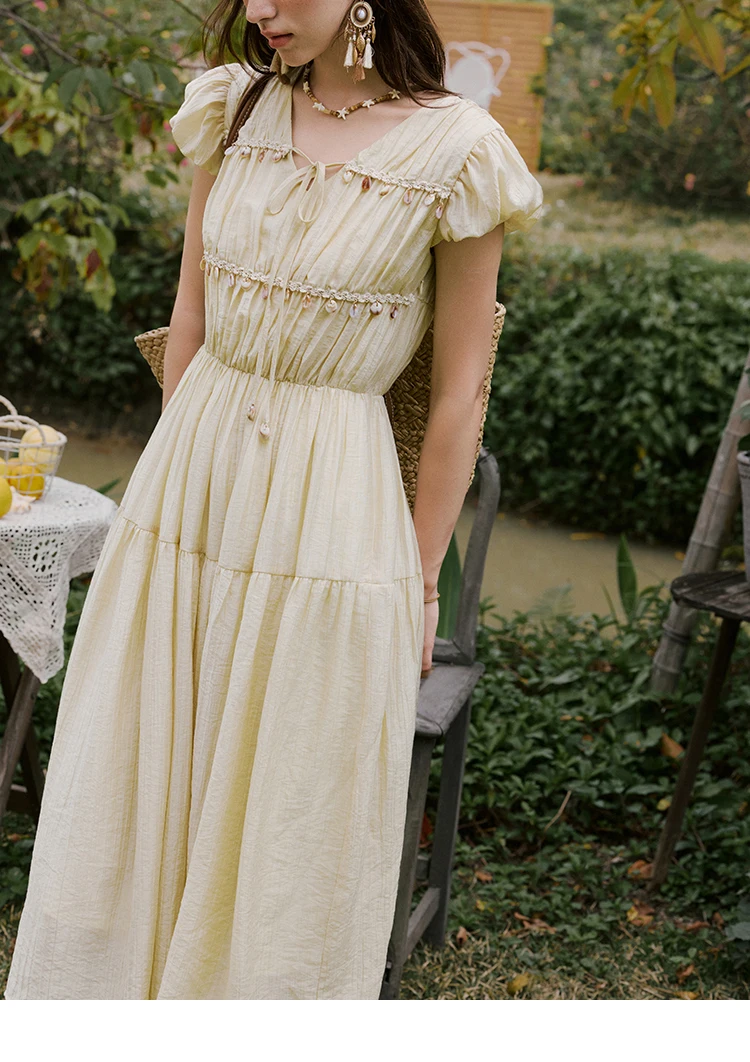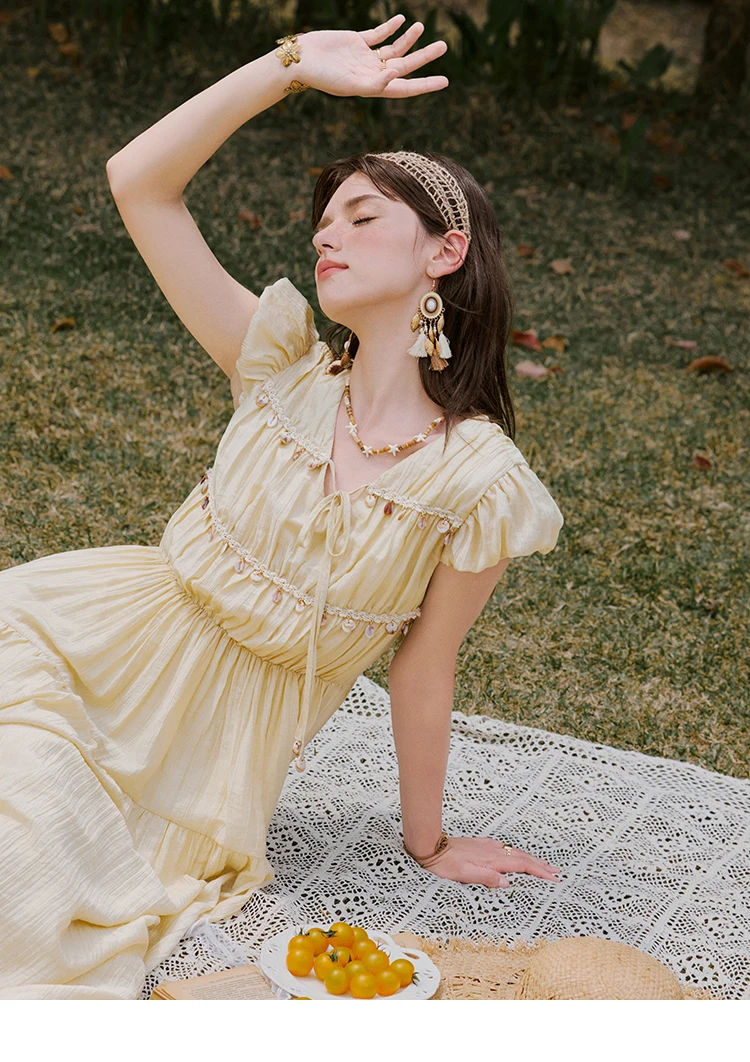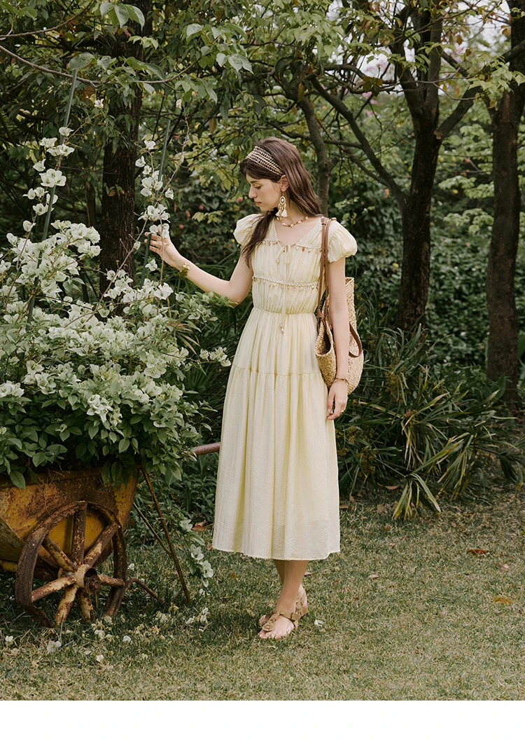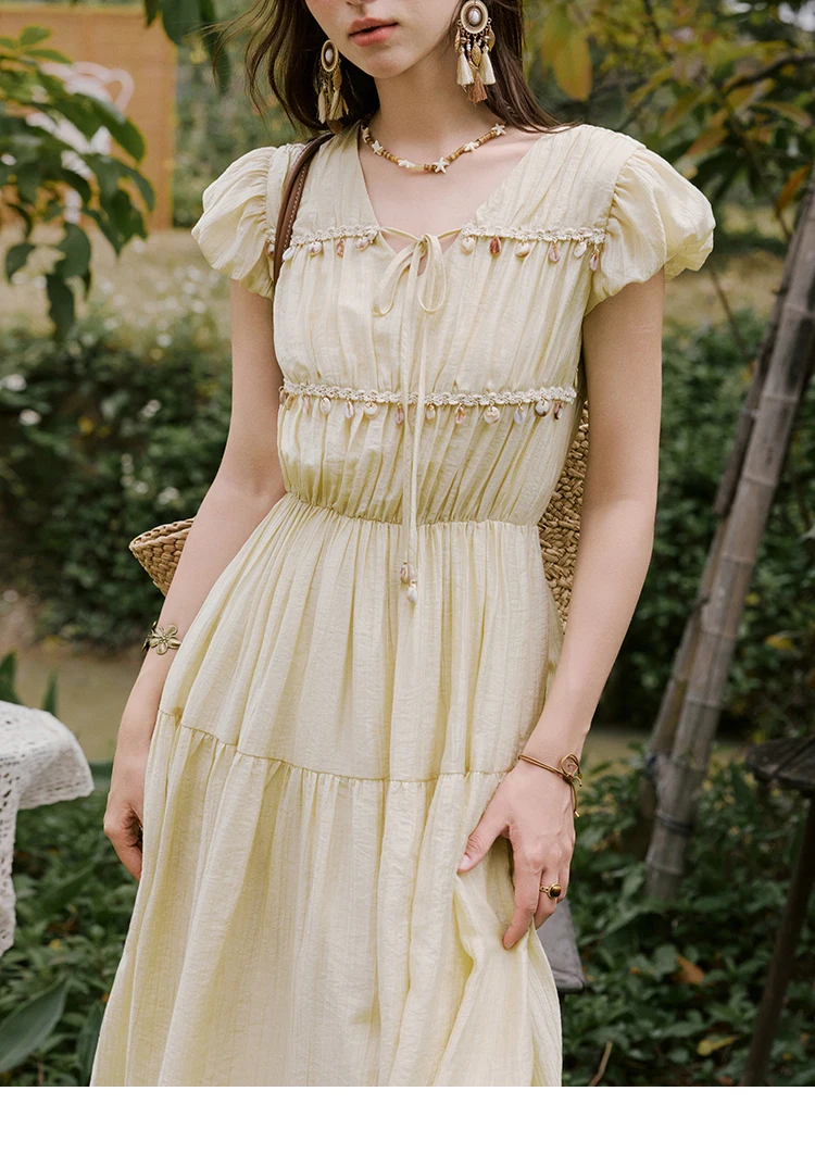 MISHOW Holiday Summer Dresses Women 2025 Solid V-neck Short Puff Sleeve Shell Ribbon High Waist Dress Woman Fashion MXE33L2193