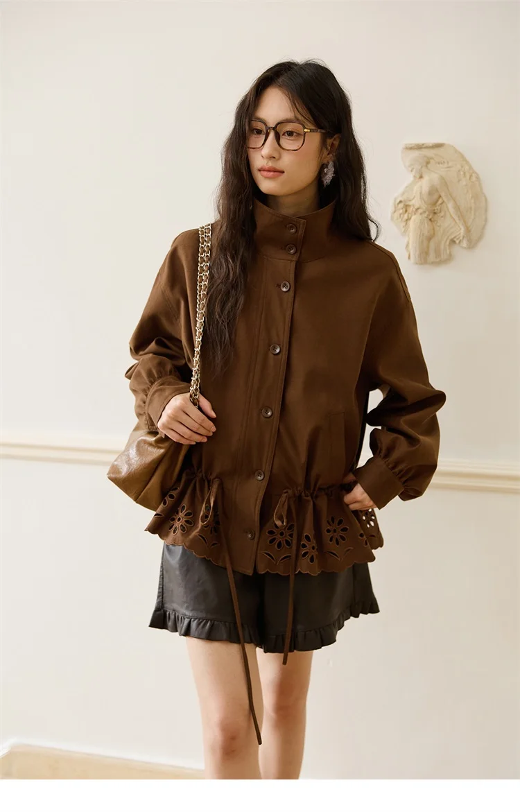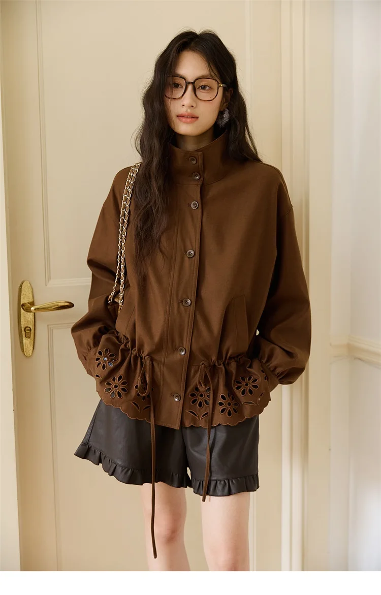 MISHOW Hollow Embroidered Trench for Women Autumn 2025 Drawstring Waist Coffee Jacket Lapel Single Breasted Coat MXE48W0855
