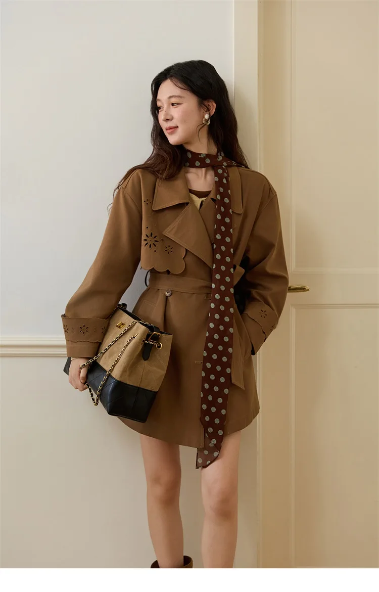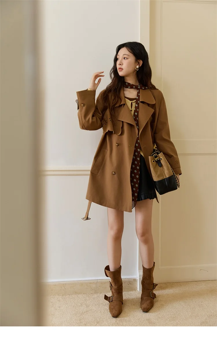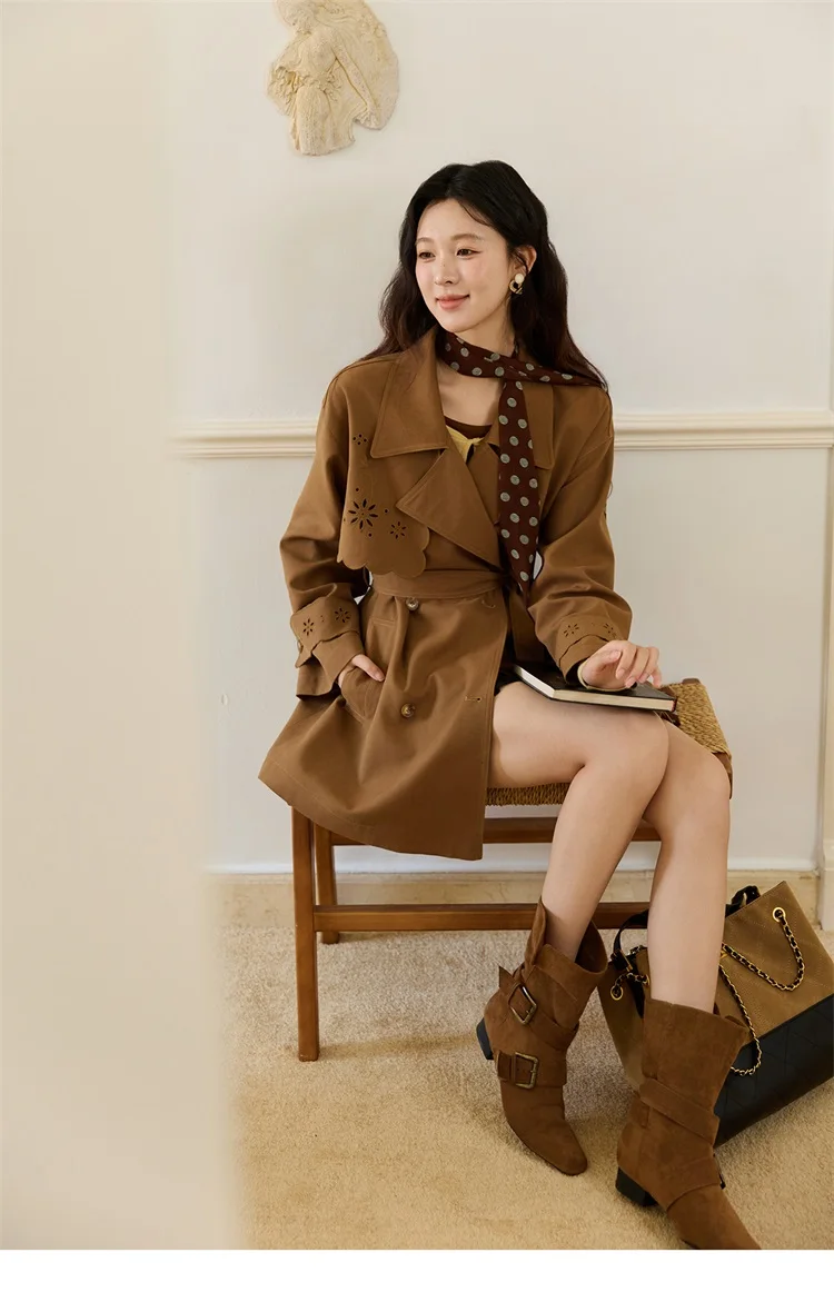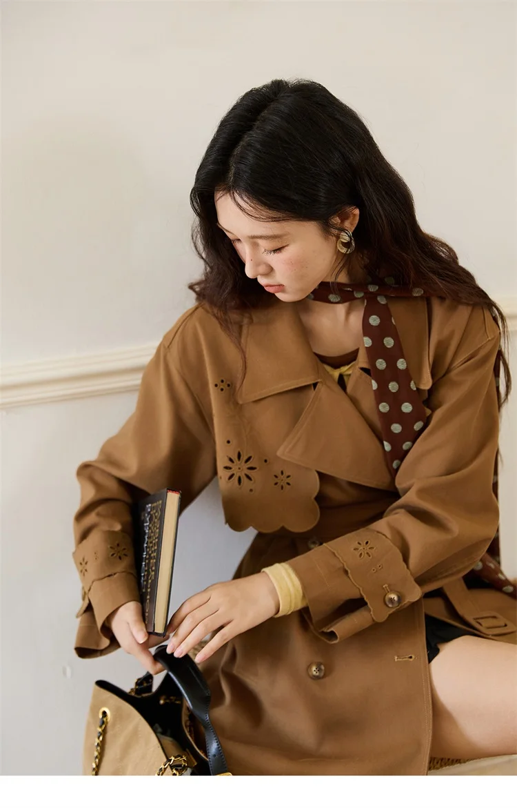 MISHOW Hollow Flower Trench Coat for Women Autumn 2025 Double Breasted Retro Trench with Slant Pocket Belt Coats MXE46W0838