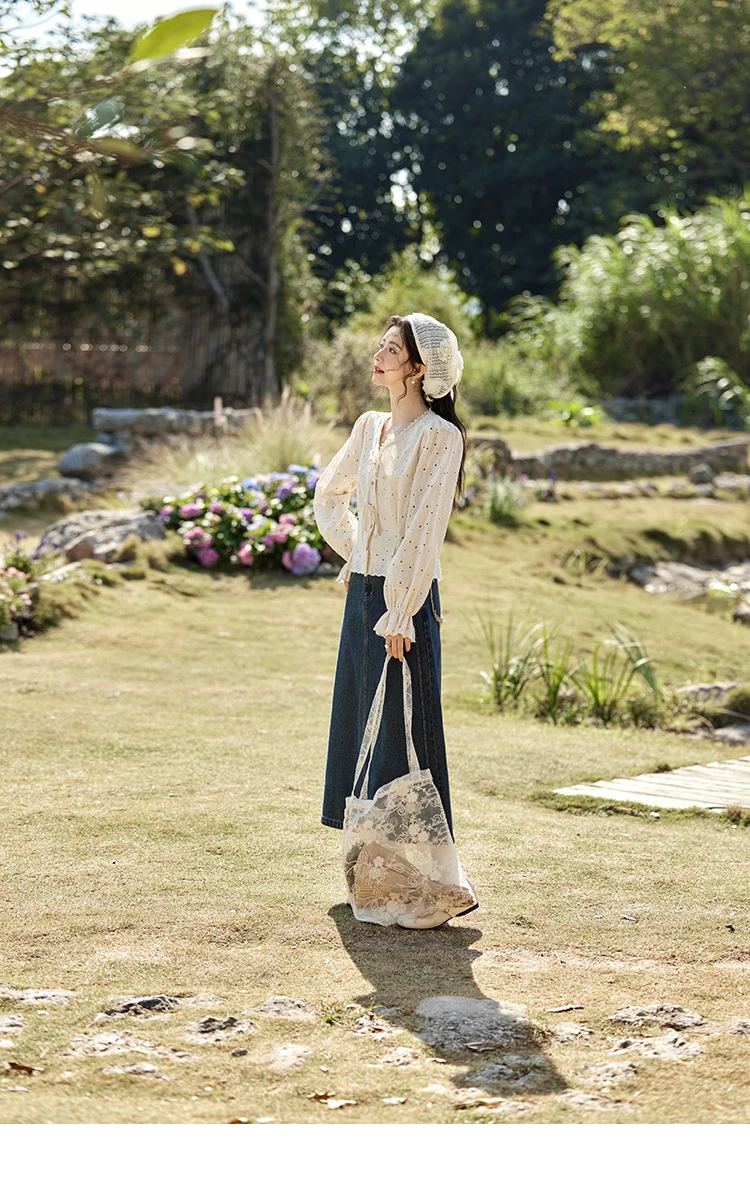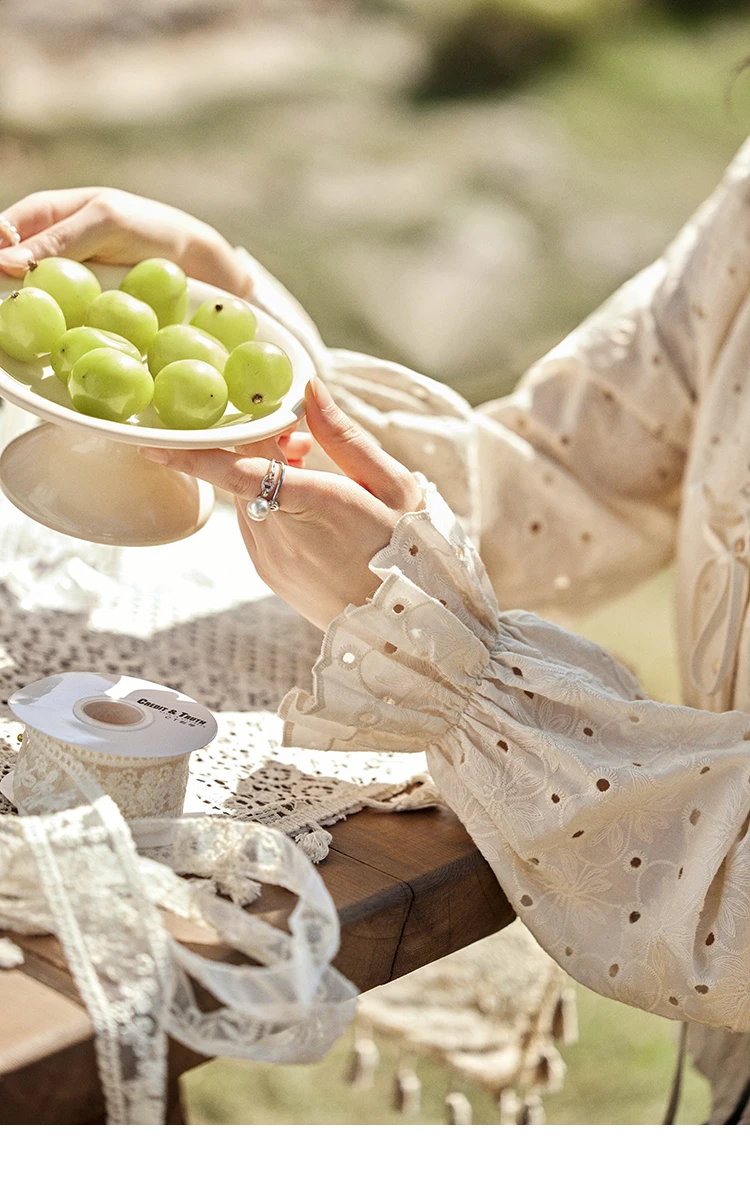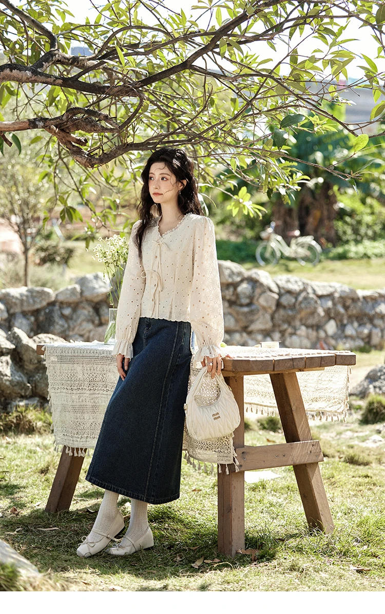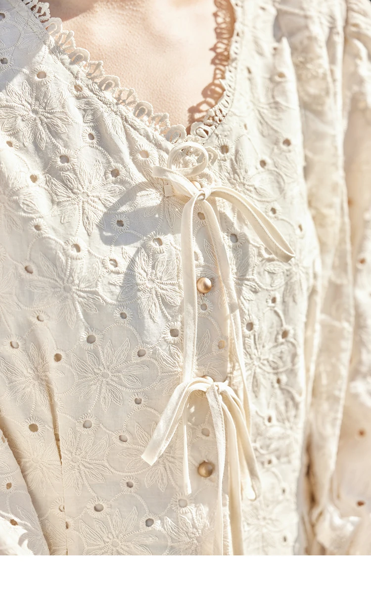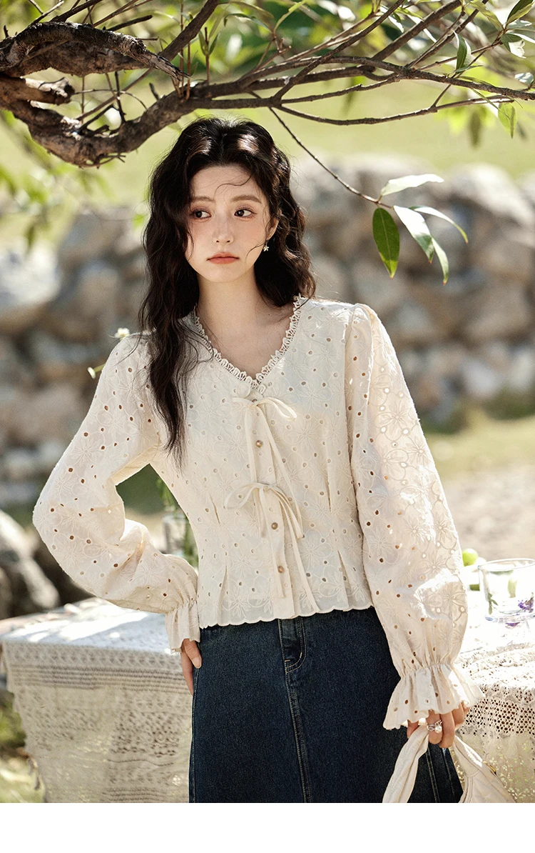 MISHOW Hollow Lace Shirt for Women Spring 2025 French Retro Lace100 Cotton Shirt V Neck Waist Elastic Cuffs Blouses MXE12X1710