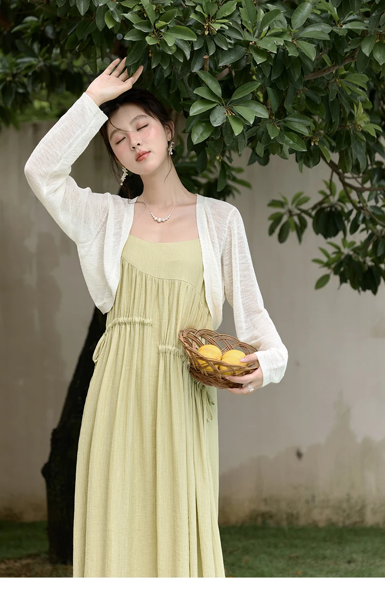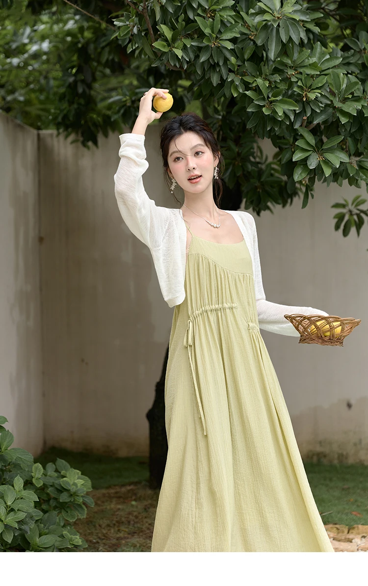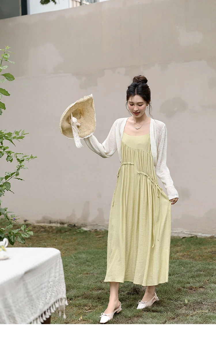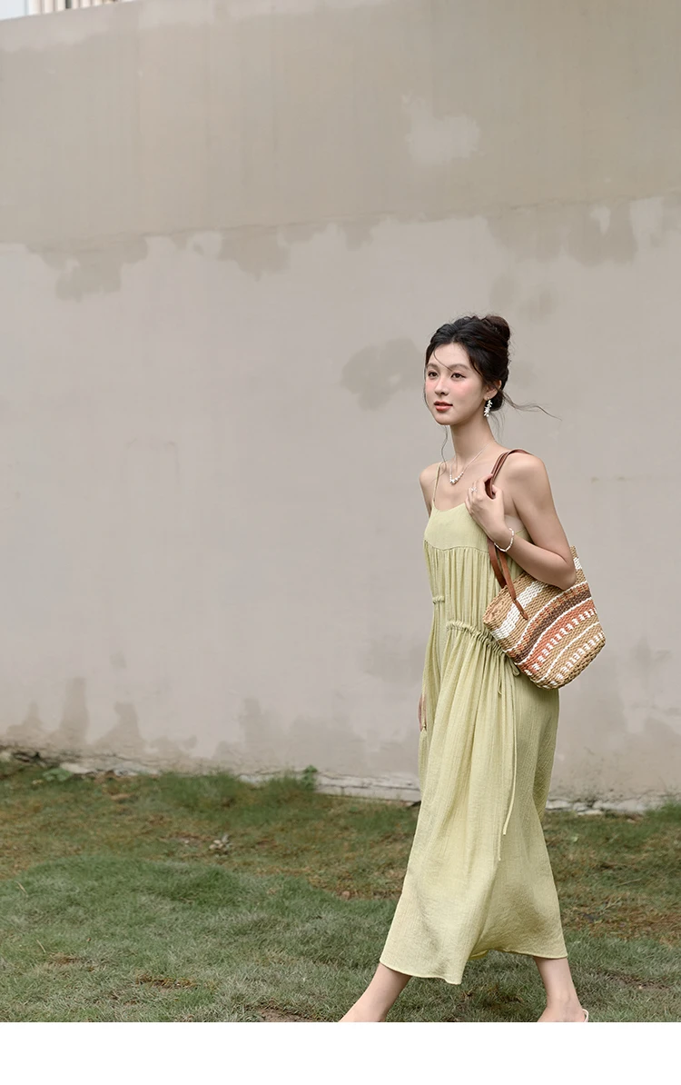 MISHOW Irregular Pleated Suspender Long Dress for Women 2025 Summer Olive Green Dress Loose Drawstring Waist Dresses MXD31L1928