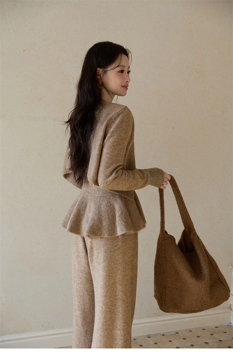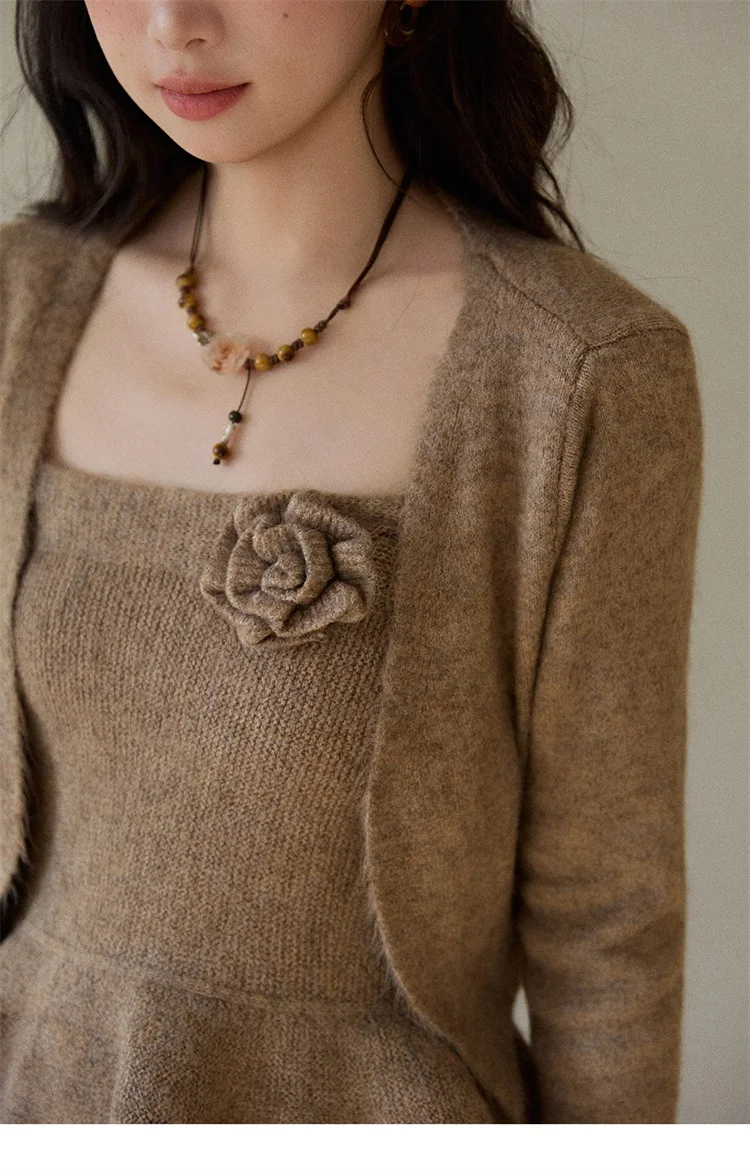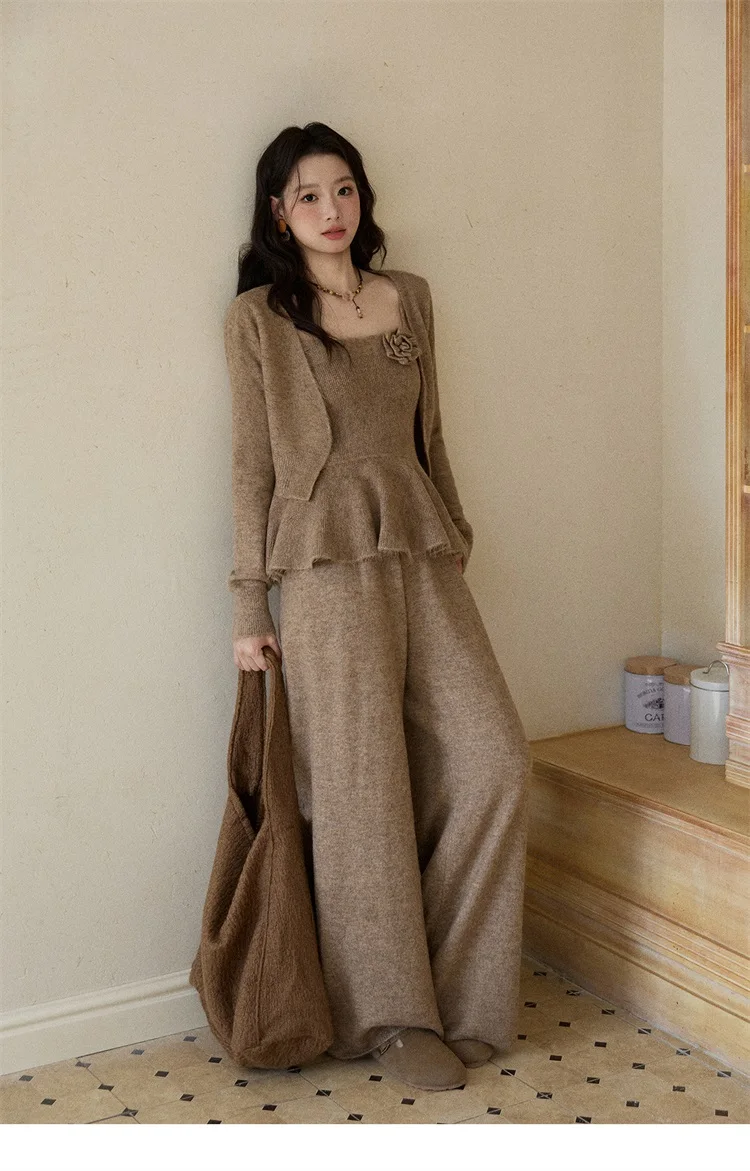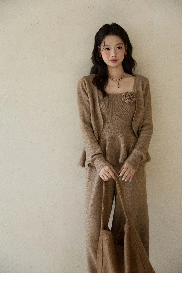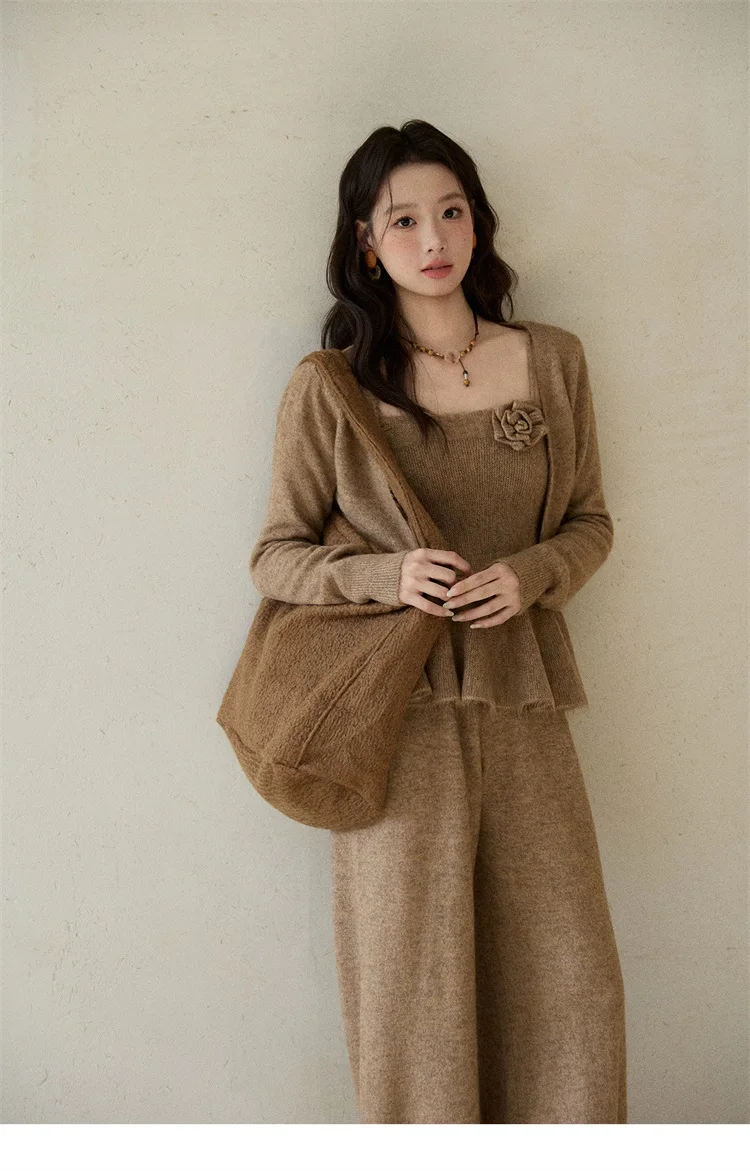 MISHOW Khaki Knitted Three-Piece Winter Set for Woman RetroThree-Dimensional Floral Camisole Cardigan Wide-Leg Pants MXE87T1449
