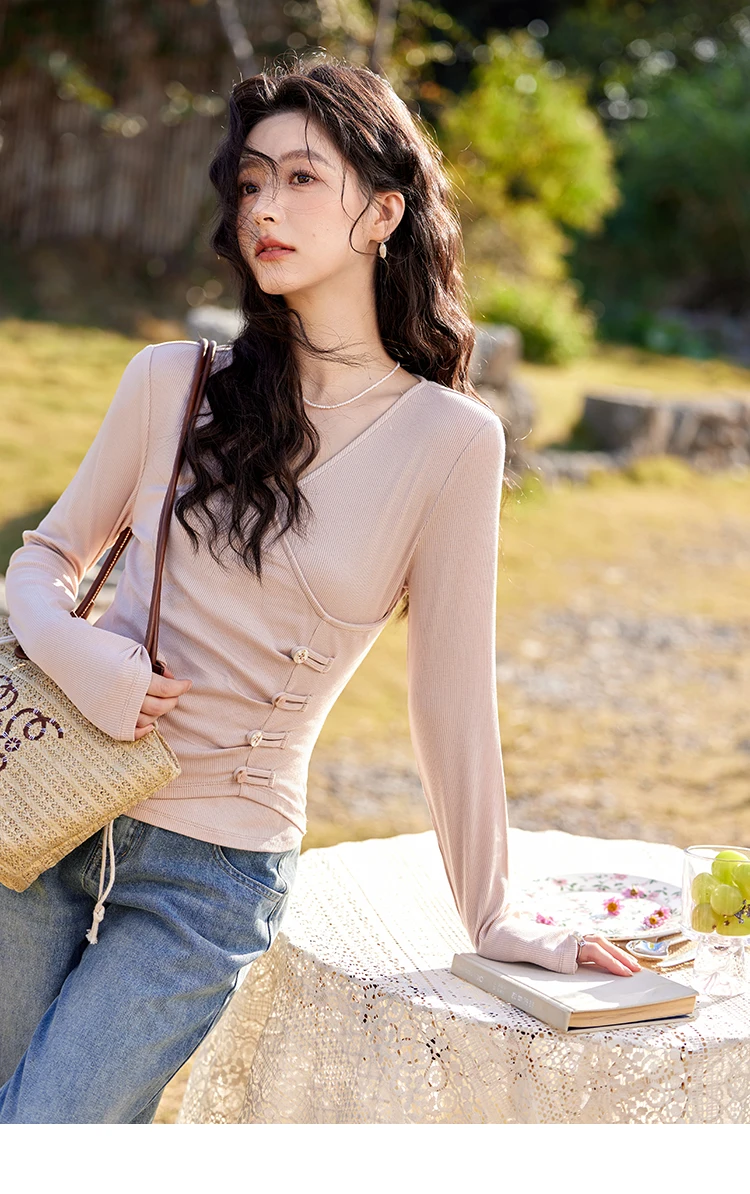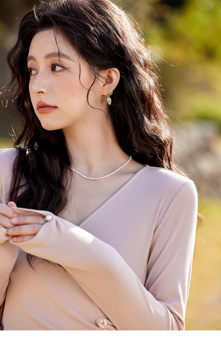 MISHOW Knitted Sweater Solid Color V-neck Long Sleeved Women Spring Summer New Fashion Elastic Slim Tshirt Tops Sweet MXE11Z1076