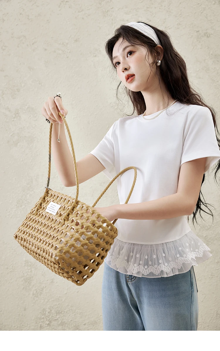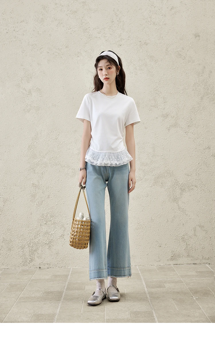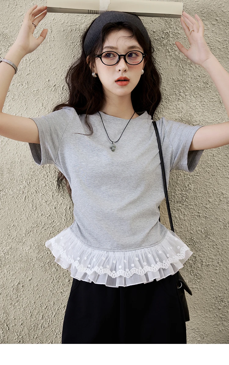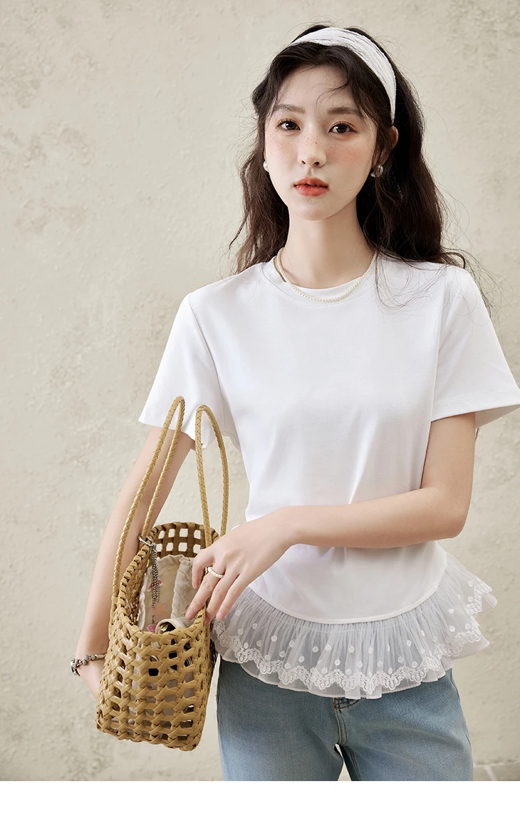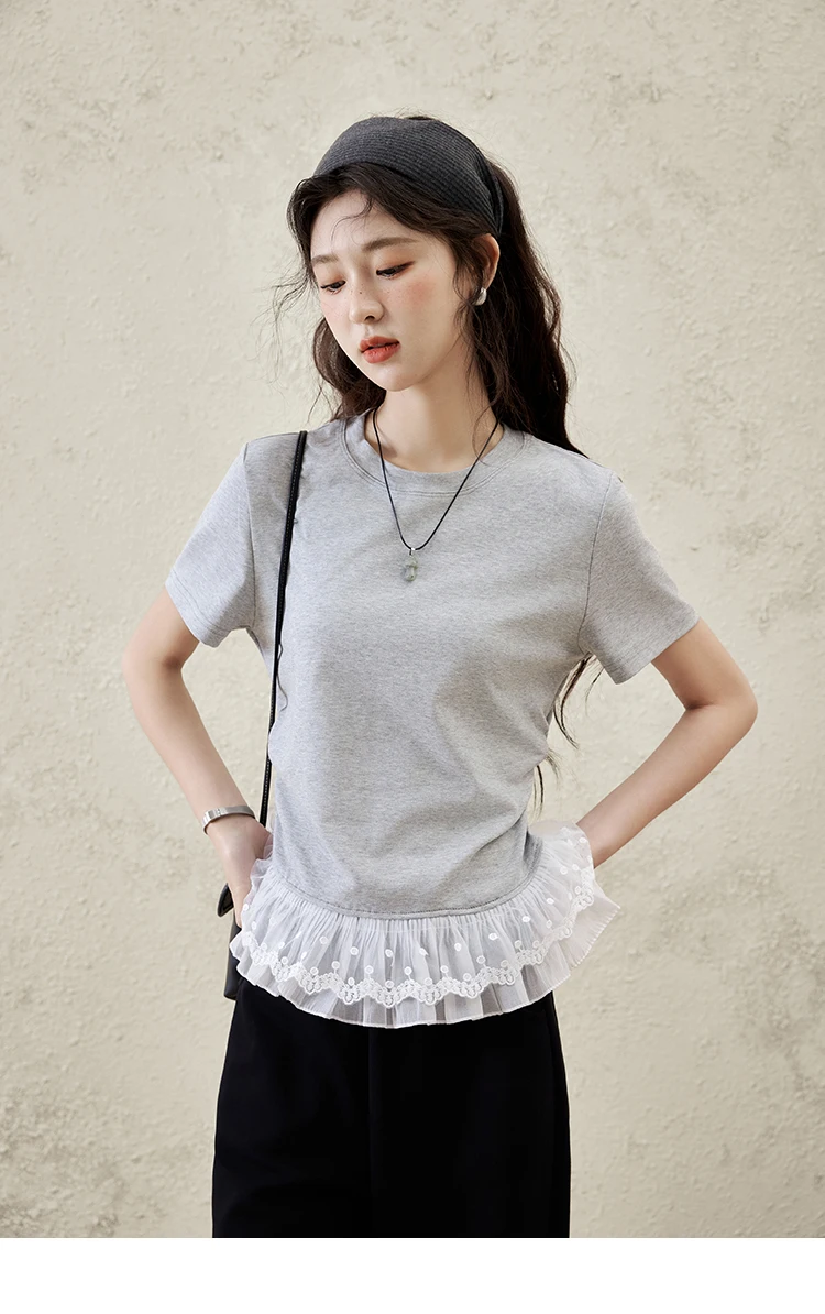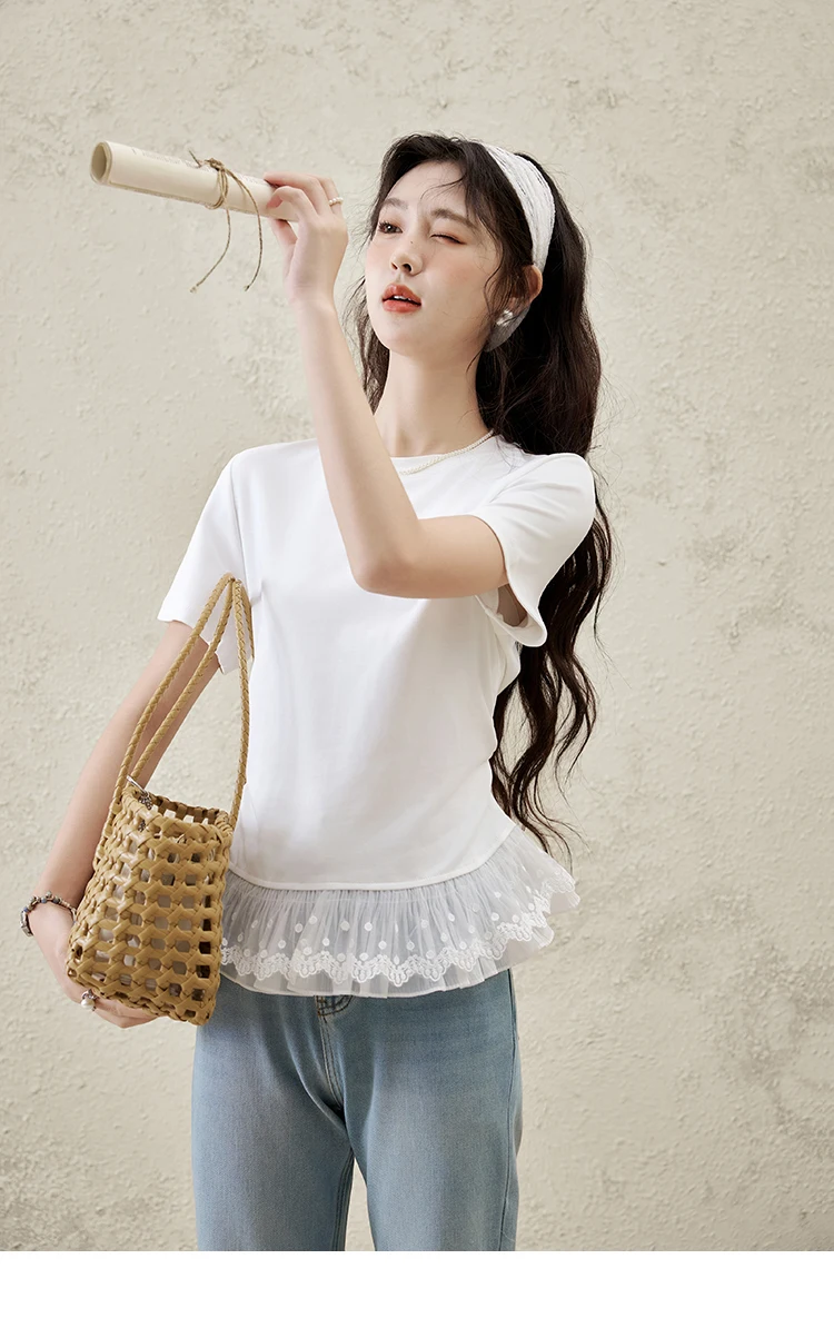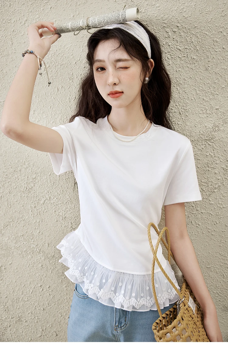 MISHOW Lace Hem Splicing T-shirt for Women Spring/summer 2025 Round Neck Versatile Top Streetwear Solid Casual Tees MXE31T0528