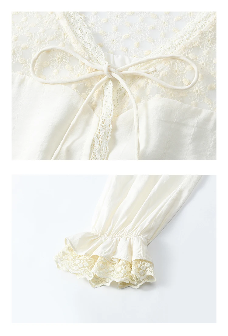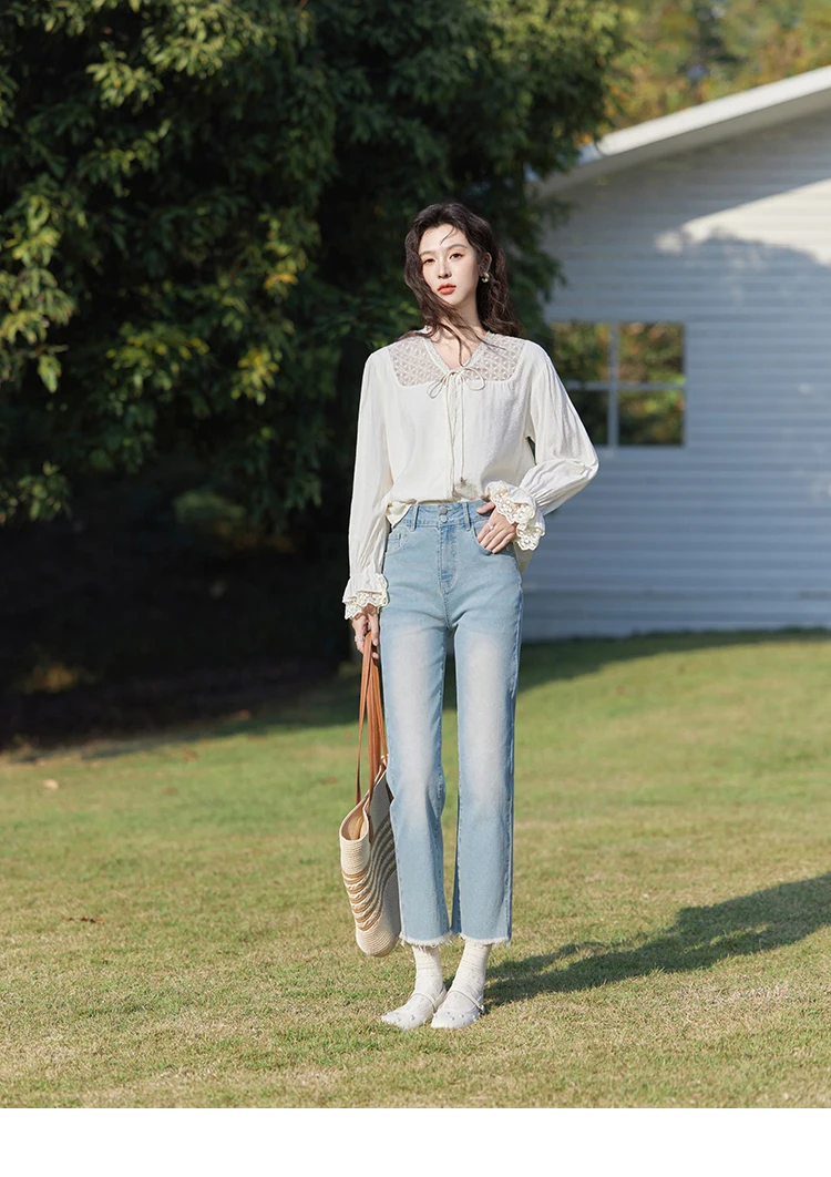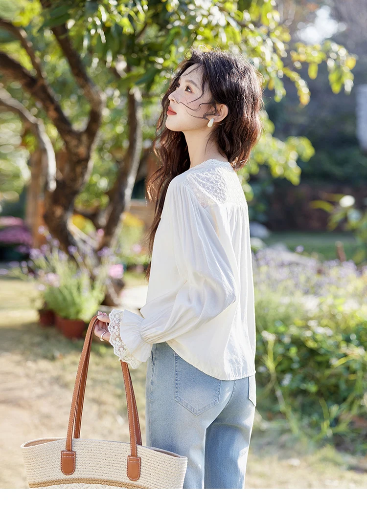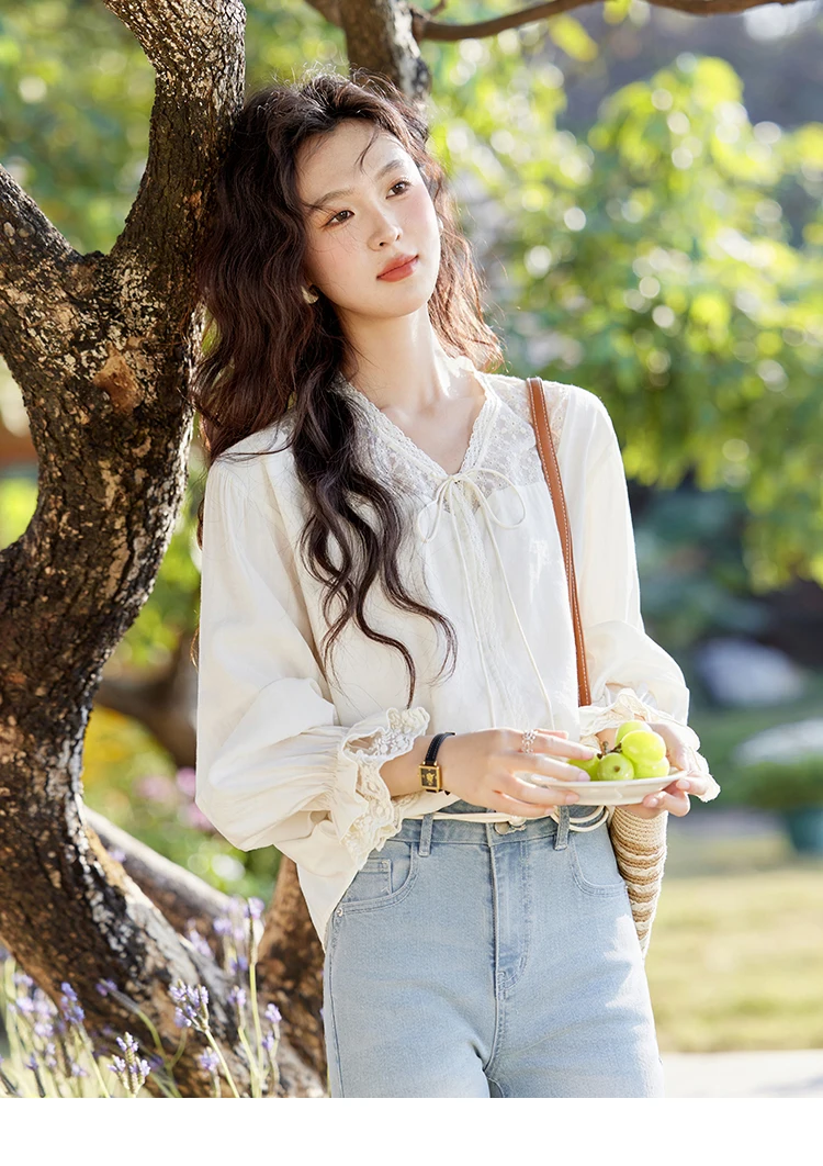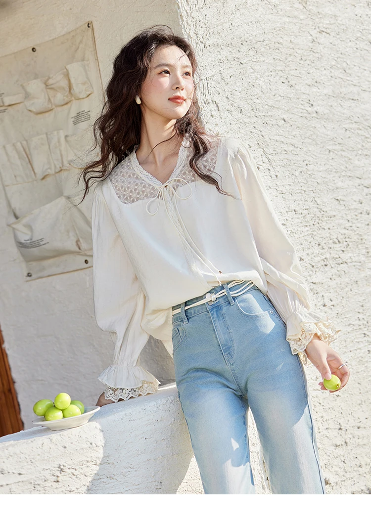 MISHOW Lace Patchwork Shirt for Women Spring 2025 V-neck with Fungus Edge Lace-up Chiffon Top Petal Sleeve Shirts MXE13X1713