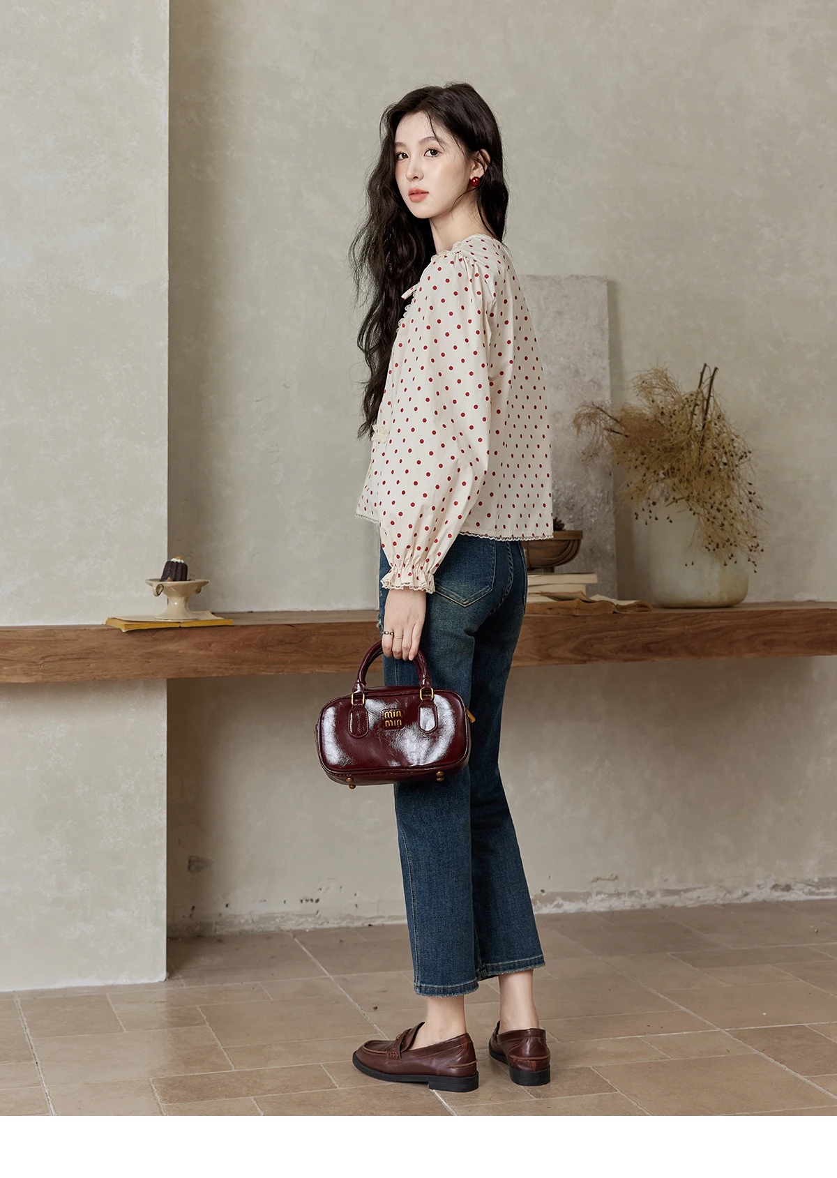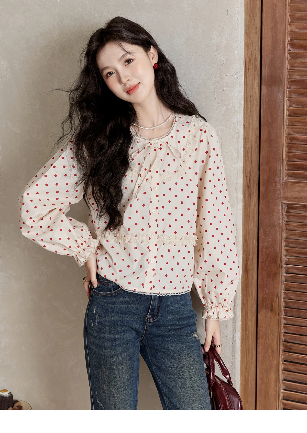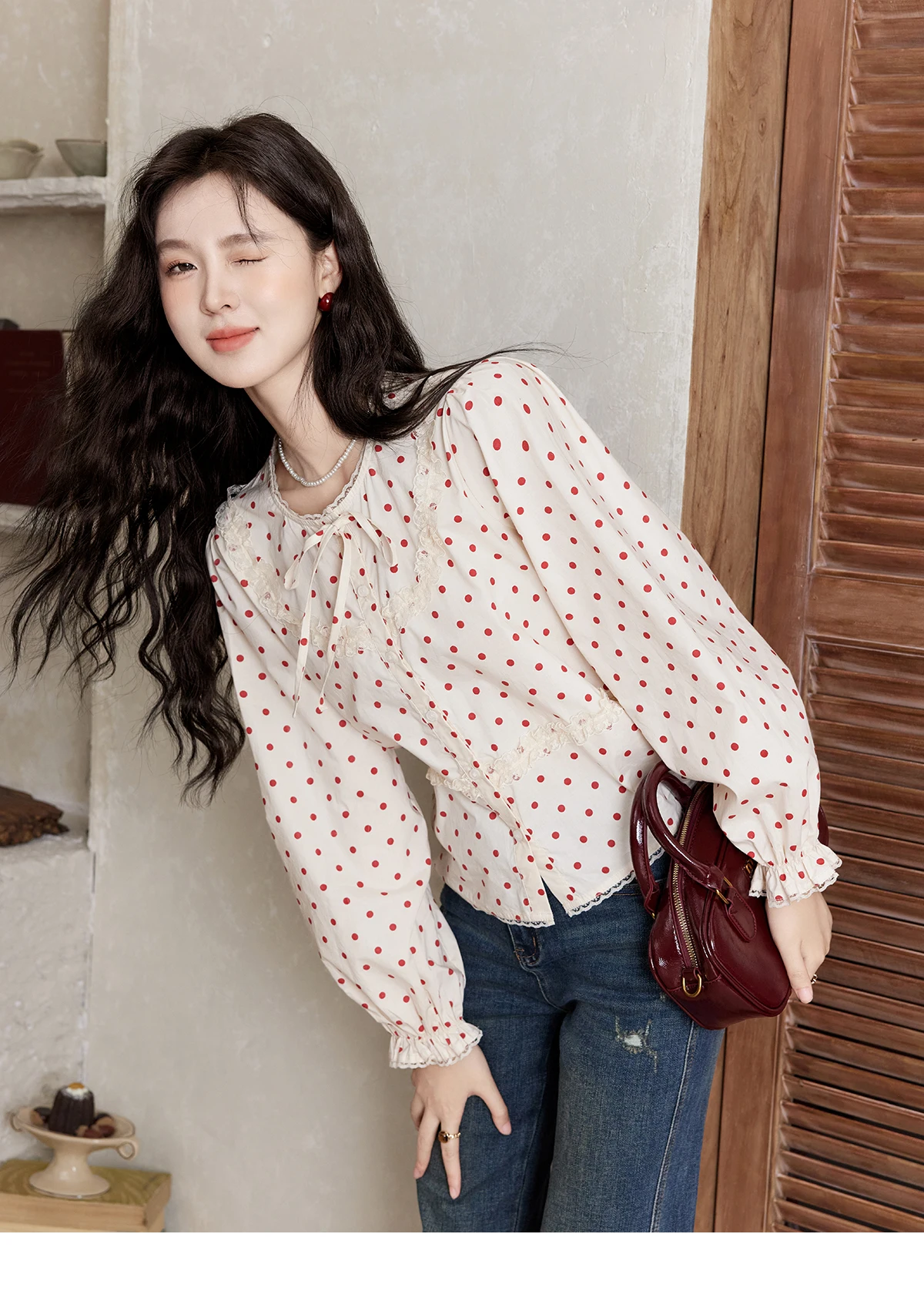 MISHOW Lace Up Polka Dot Round Neck Lace Shirt for Women Autumn 2024 Thin Sweets Shirt Elastic Petal Cuffs Chic Top MXD44X1667