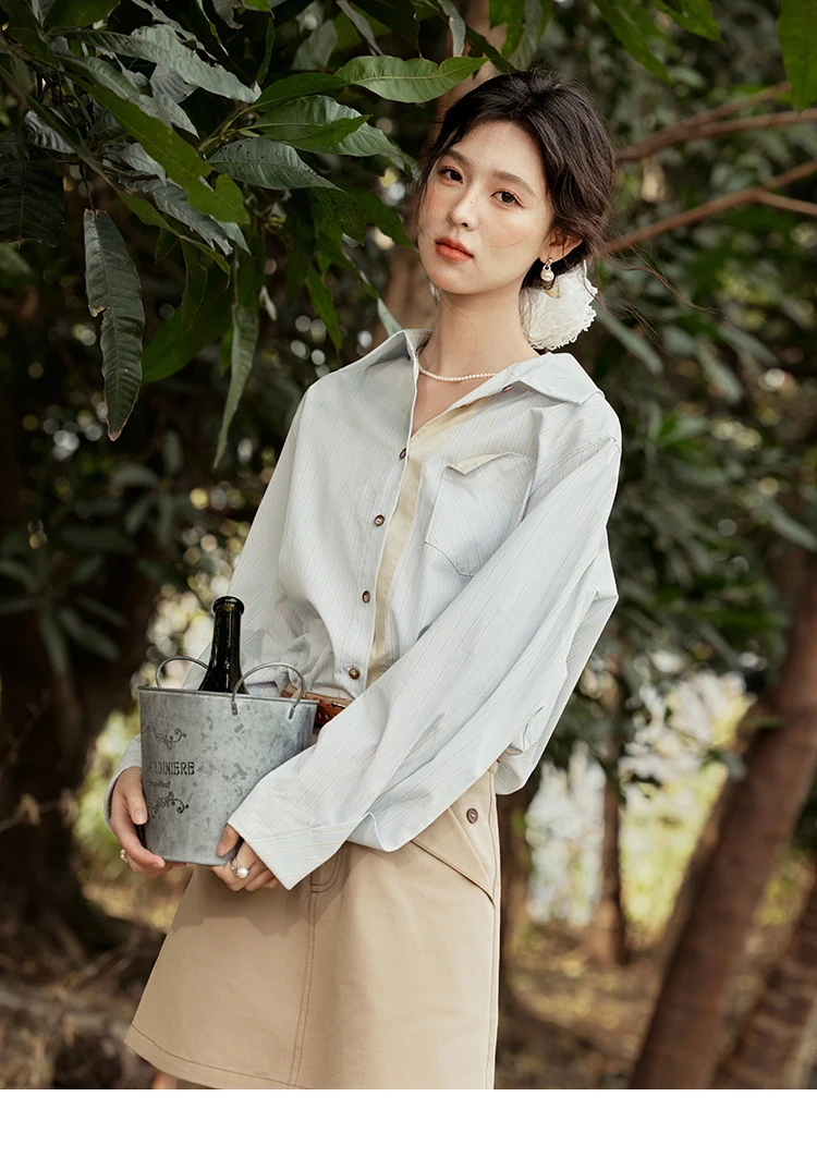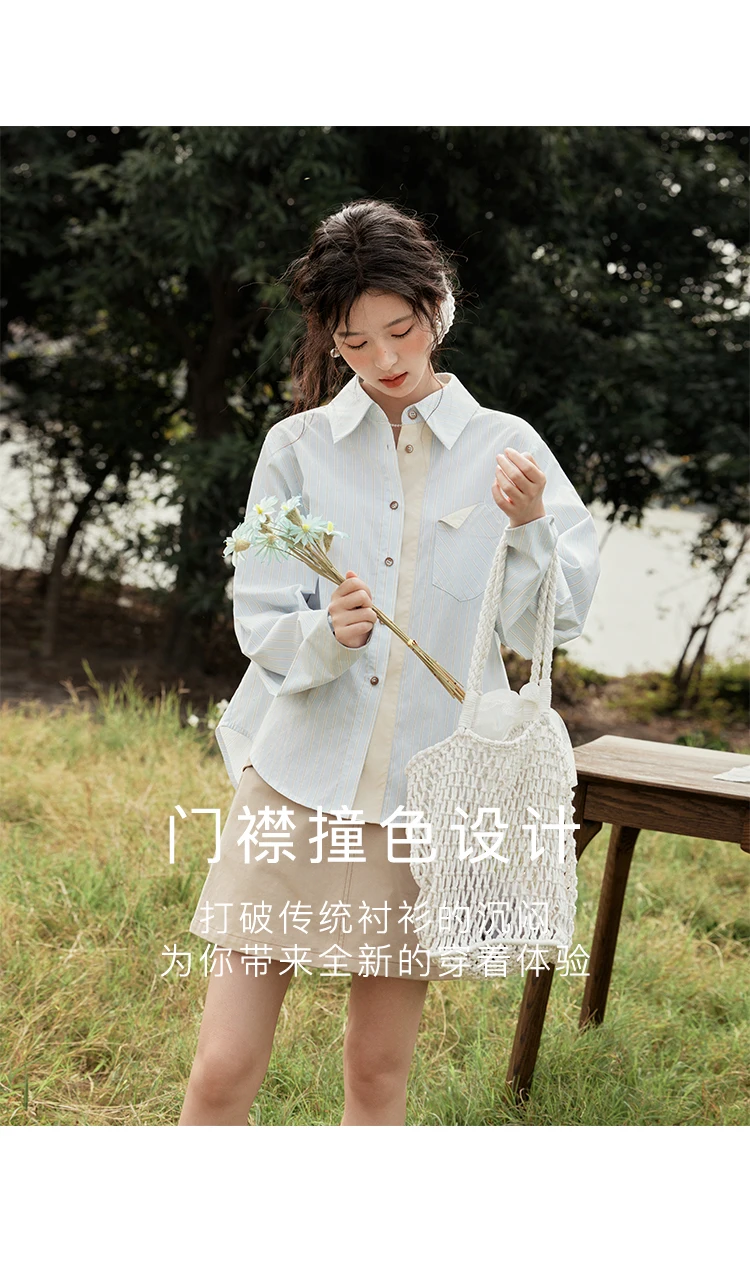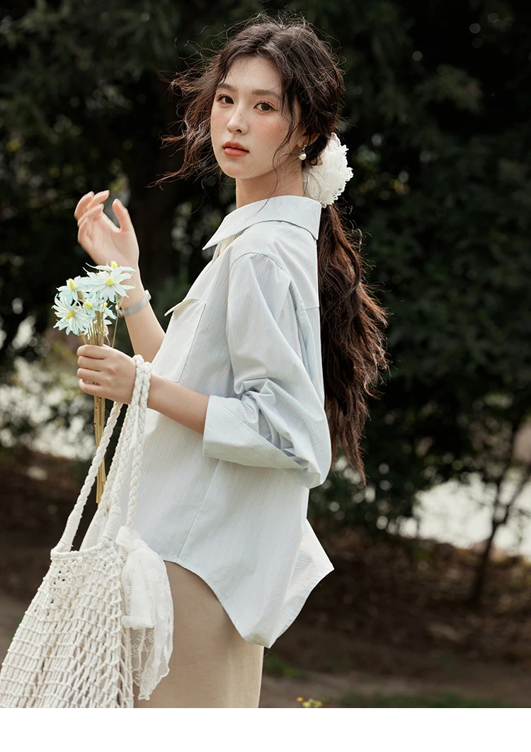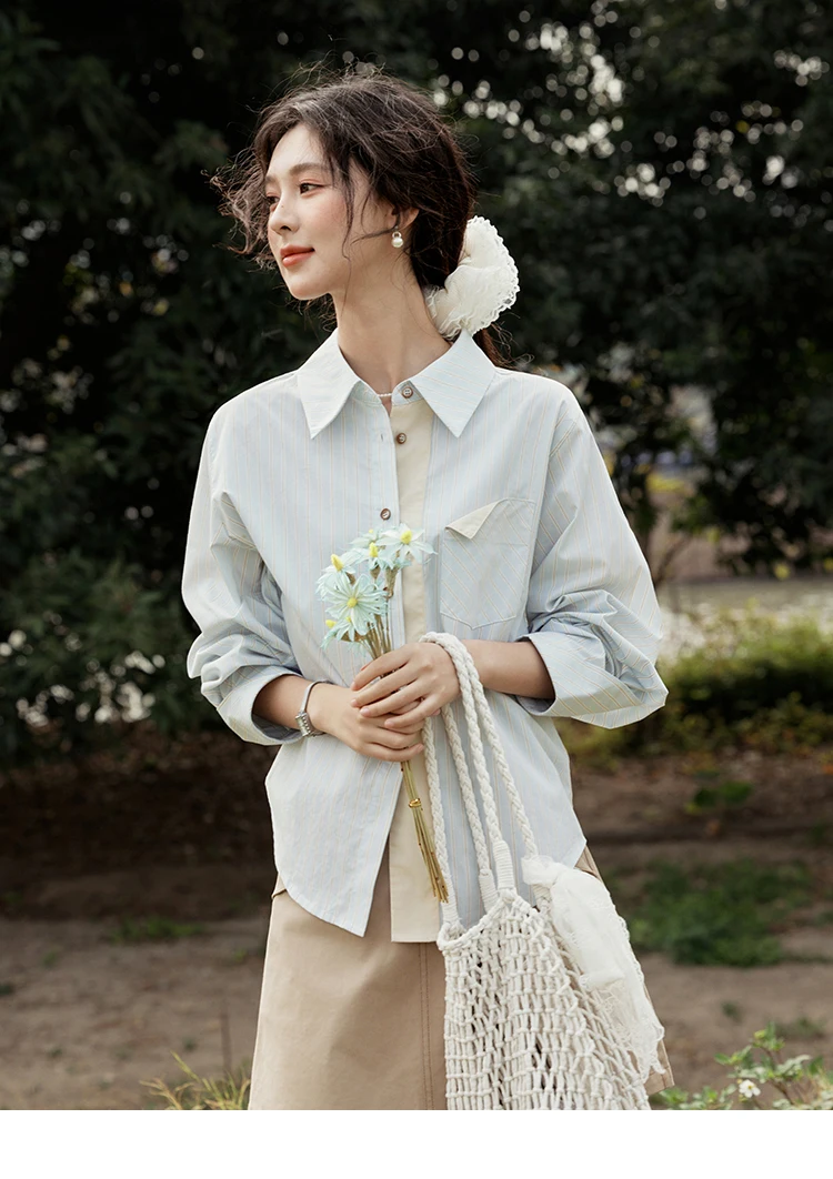 MISHOW Light Blue Striped Shirt for Women Spring 2025 Contrast Color Placket Shirt 100 Cotton Polo Neck Commuting Top MXE15C0762