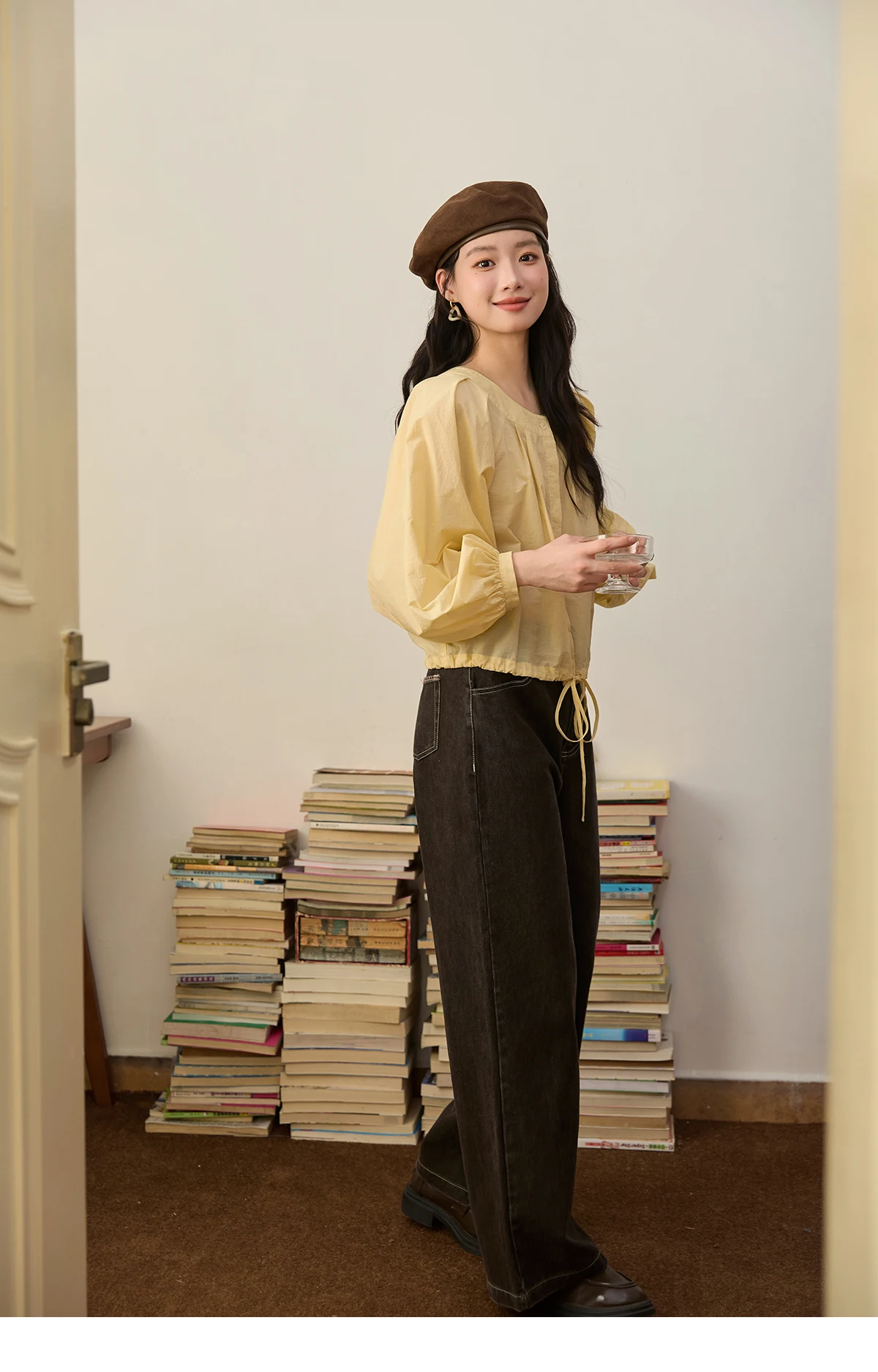 MISHOW Light Yellow Pleated Shirt 2025 Autumn Drawstring Hem Lantern Sleeve Top O-neck Cotton Blend Casual Shirts MXE45X2490