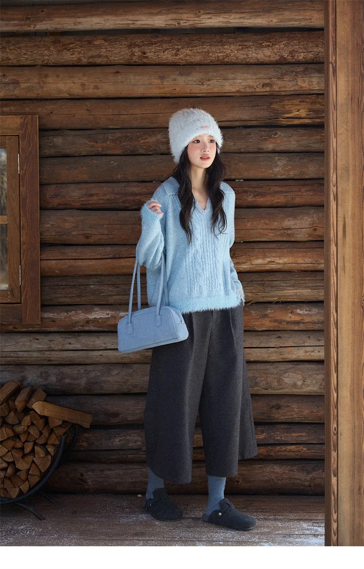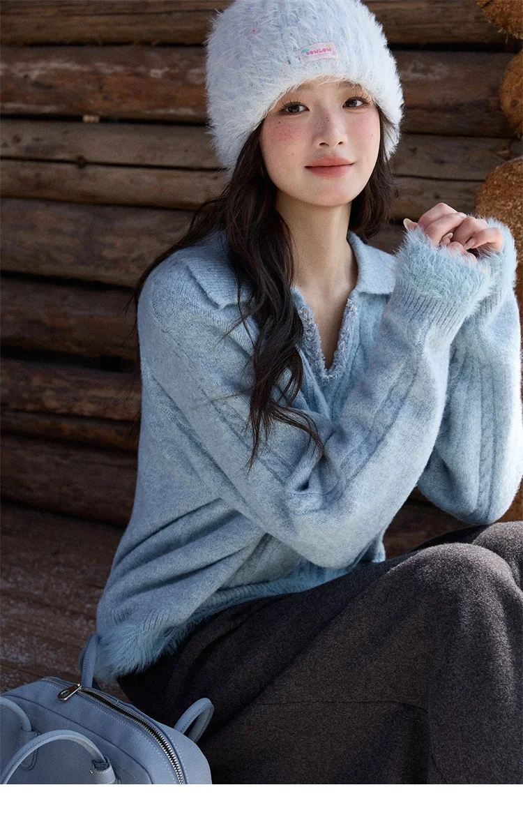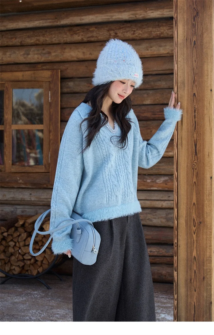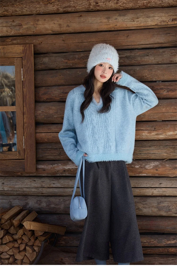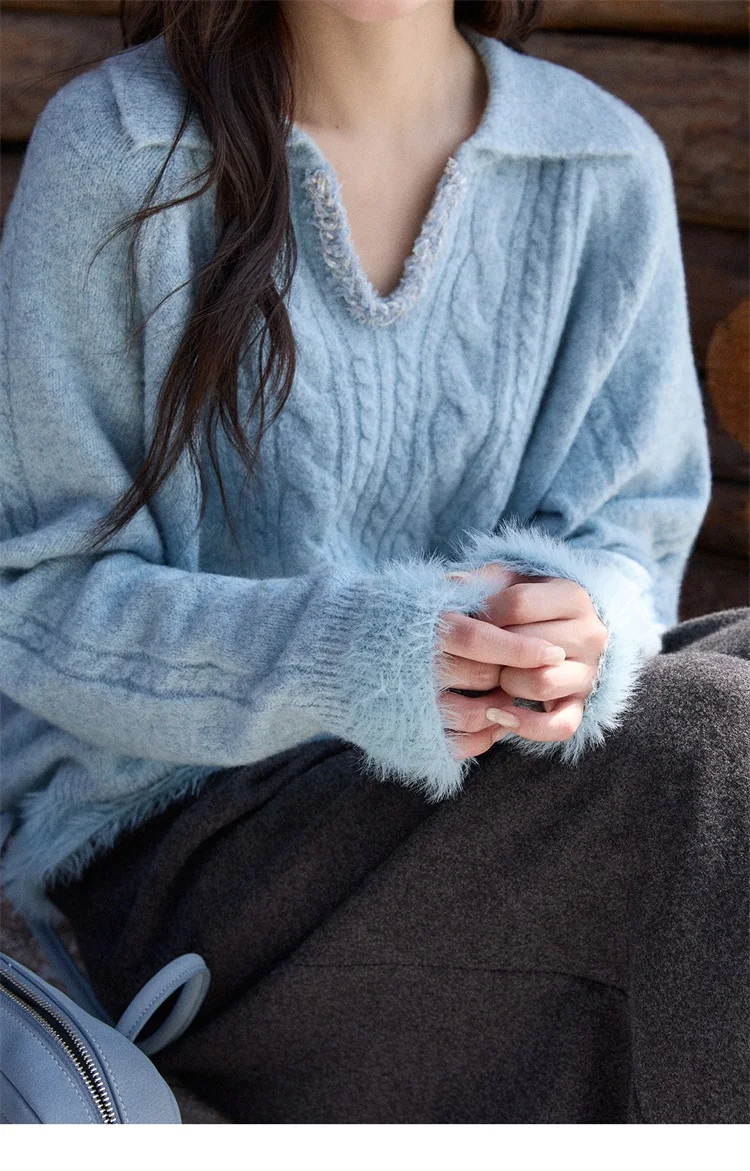 MISHOW Luxury Women's Sweaters 2025 Winter Blue Polo Collar Cable Knit Faux Mink Pullovers Loose Commute Tops Lady MXE88Z2756