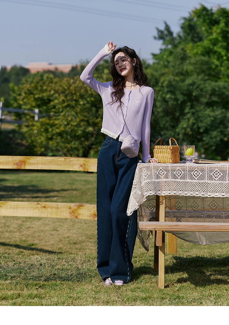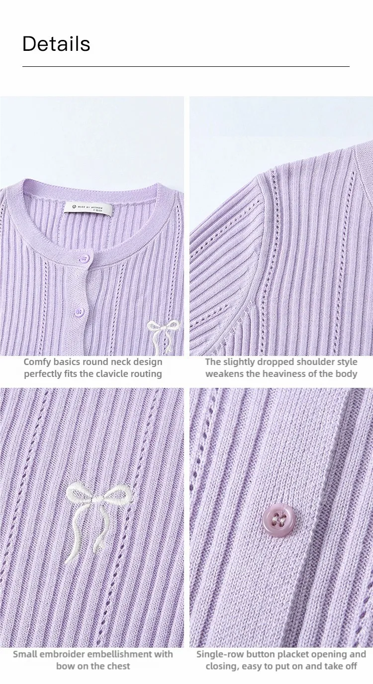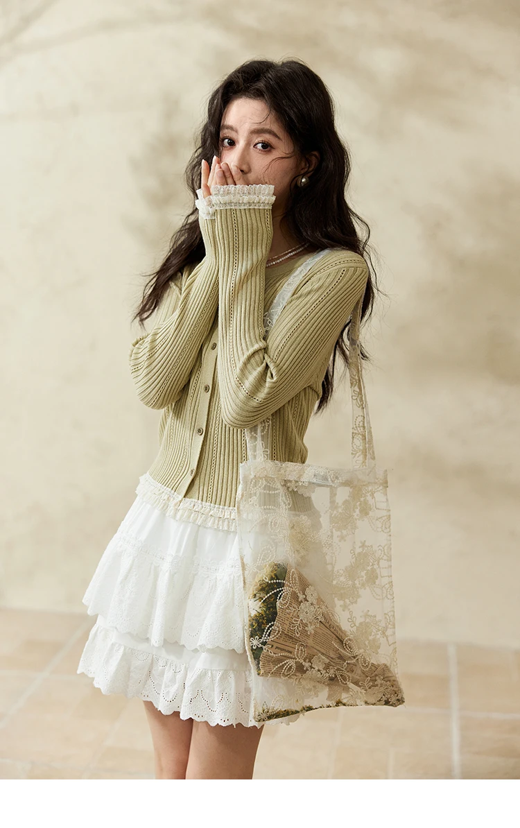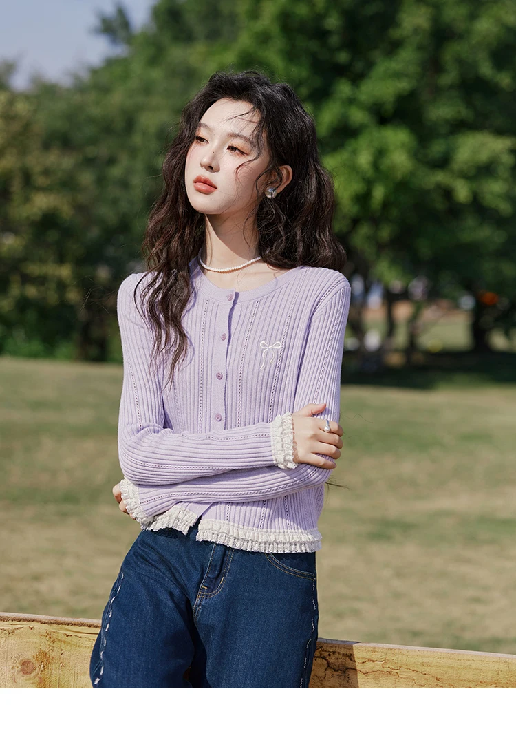 MISHOW Macaron Knitted Tops 2025 Spring Hollow Hook Flower Lace Splicing Tops Bow Embroidery O-neck Long Sleeve Tees MXE16Z1211