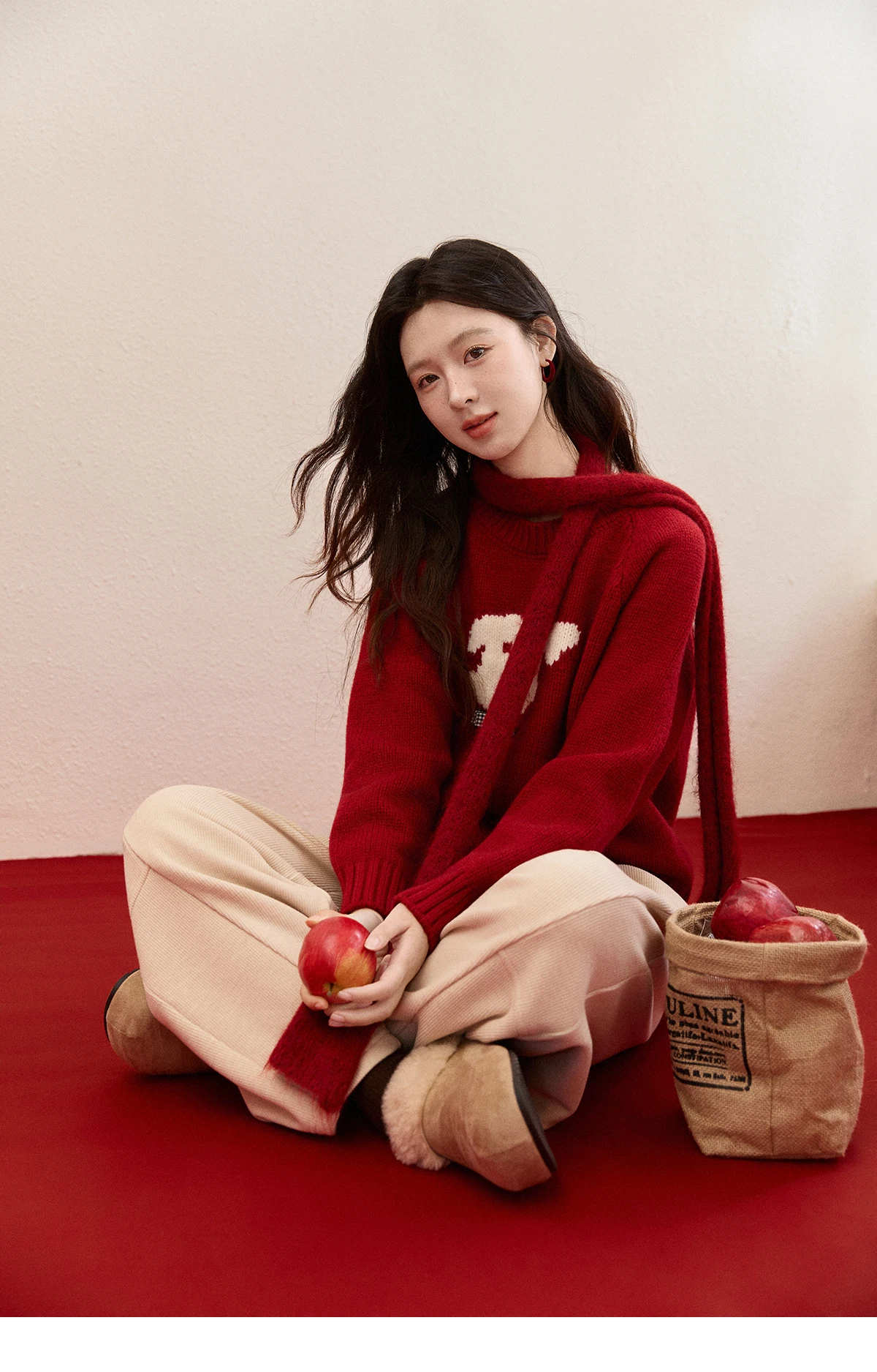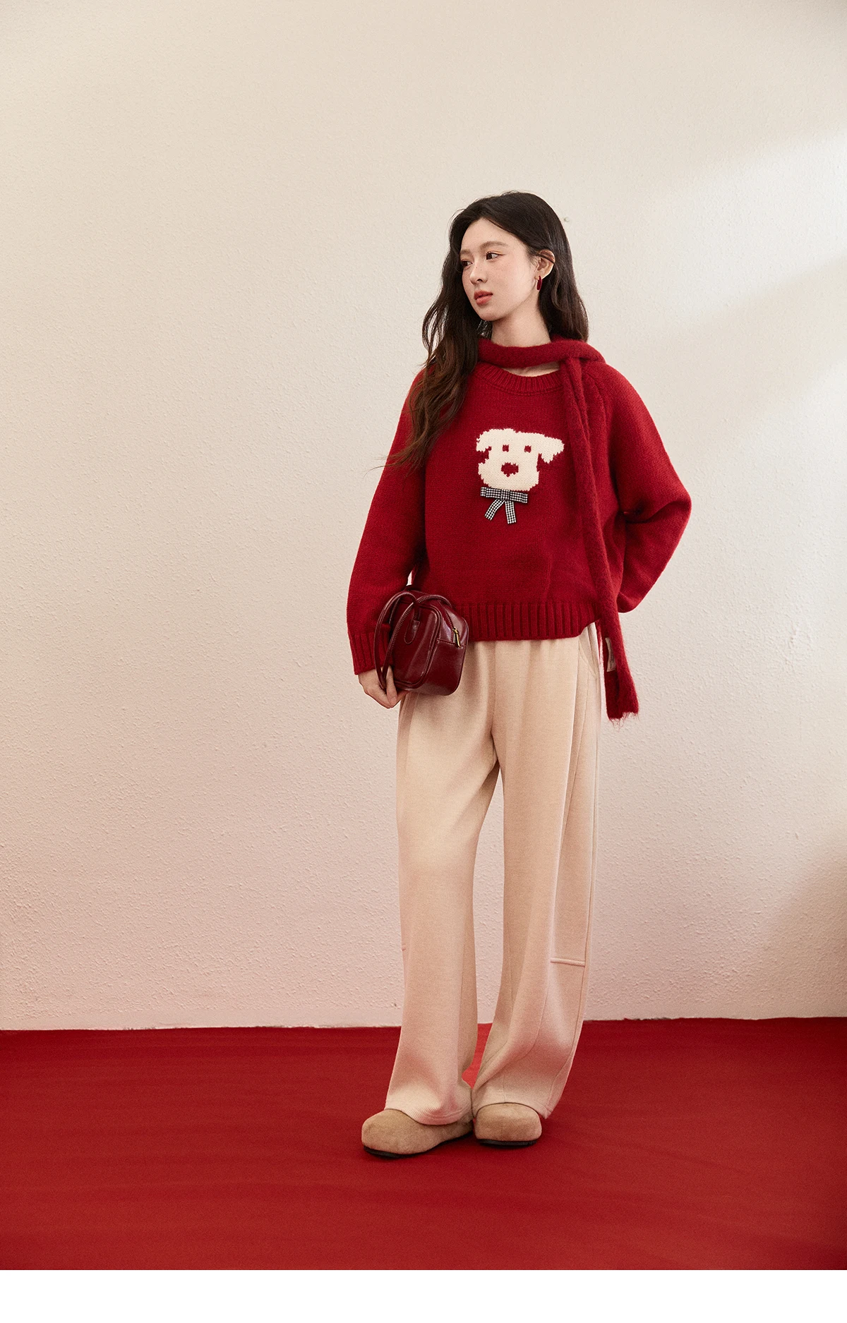 MISHOW New Year Women's Puppy Jacquard Crew Neck Knit Sweater 2026 Spring Loose Casual Red Sweater Excluding Scarf MXE93Z2932