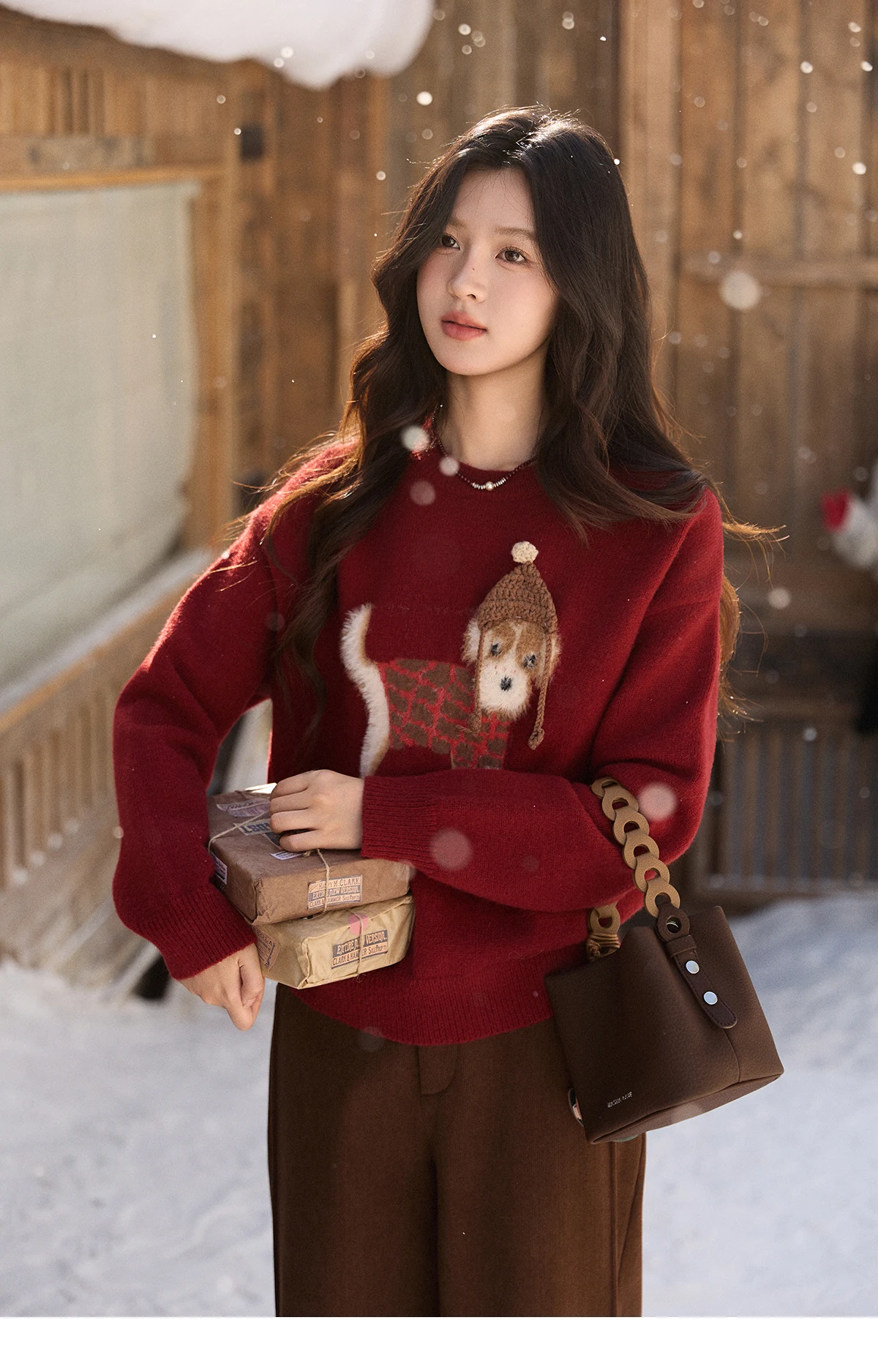 MISHOW New Year Women's Red Knitted Sweater 2025 Autumn Winter Dog Pattern Crew Neck sweaters Warm Loose Pullover Top MXE93Z2811