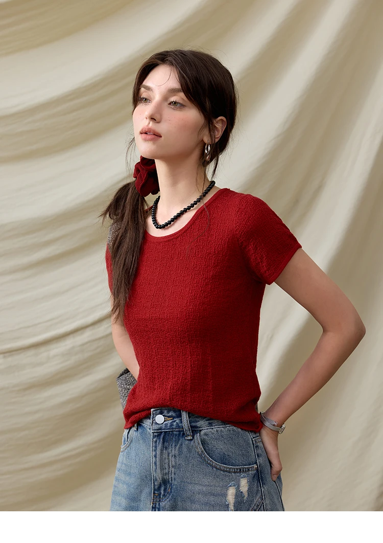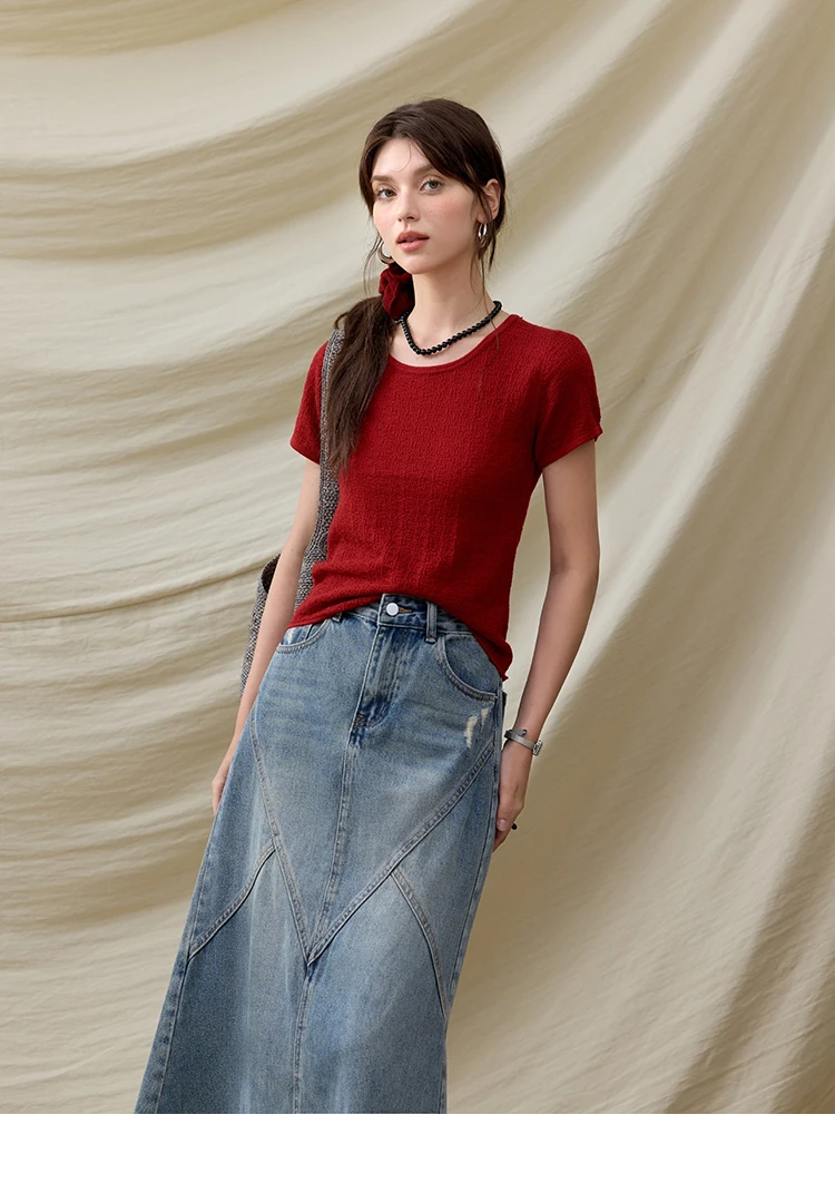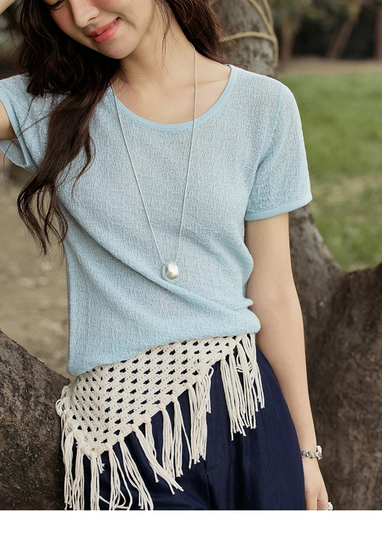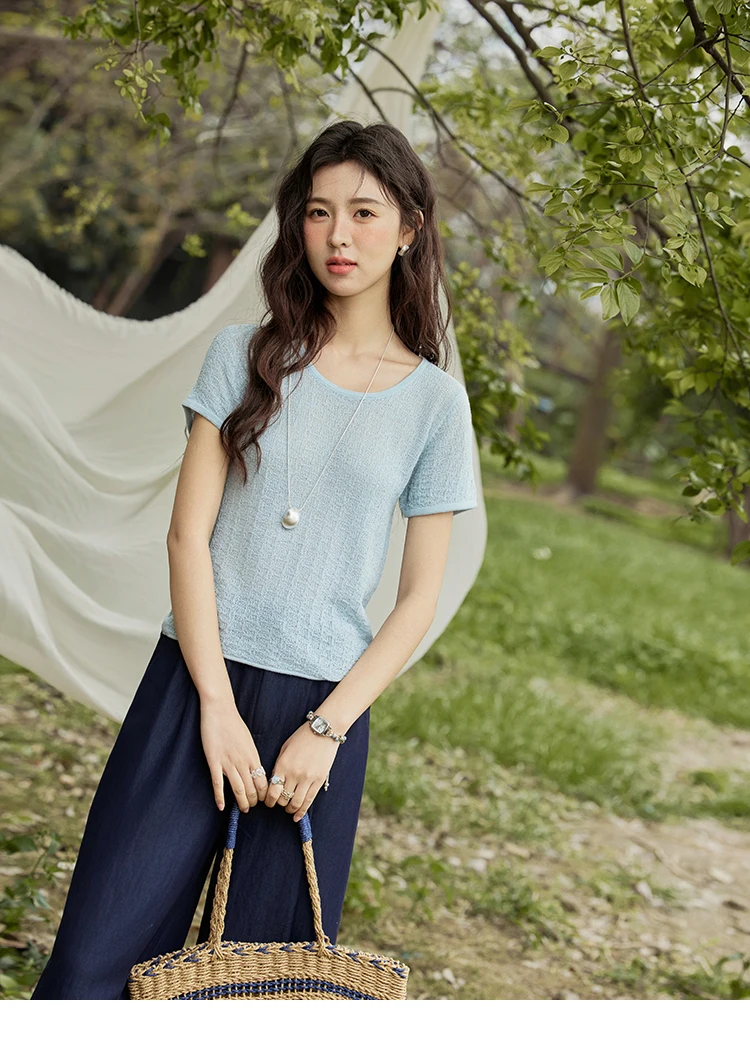 MISHOW Office Lady Women’s T-shirts Summer 2025 Short Sleeve Round Neck Solid Slimming Knitted Shirt Female Fashion MXE34Z1257
