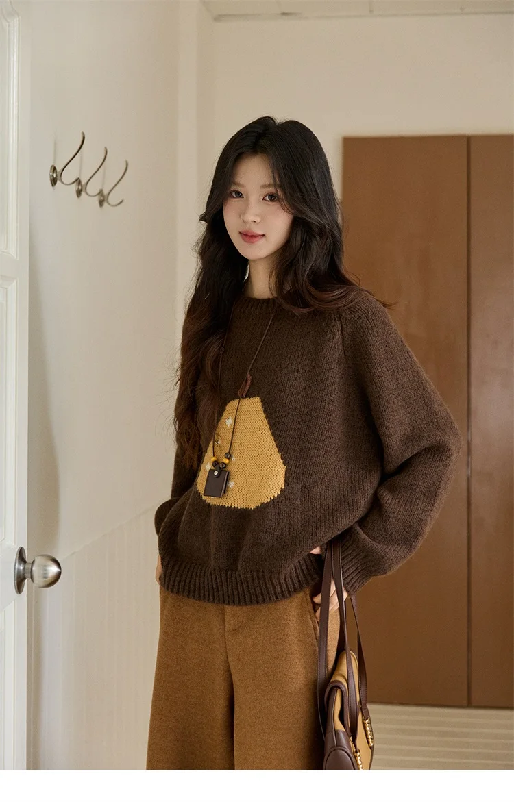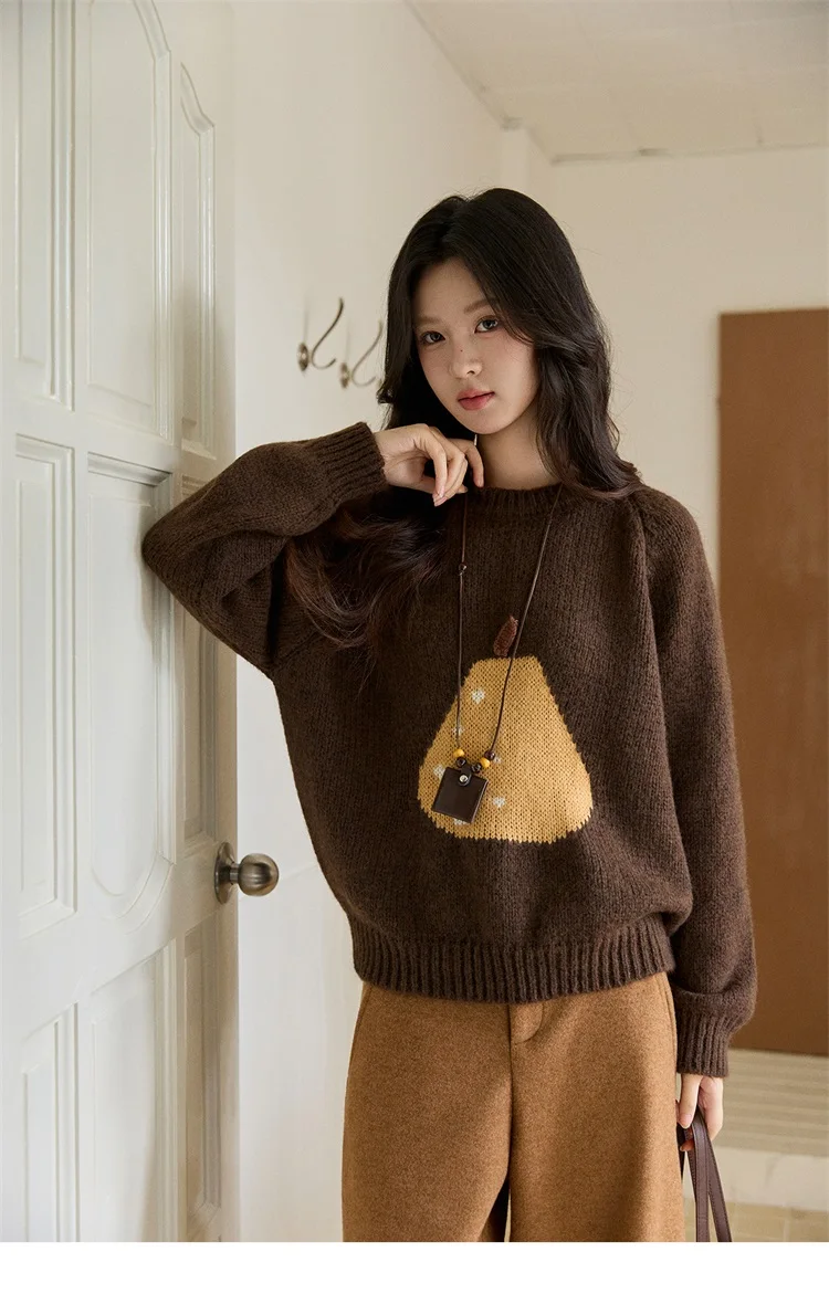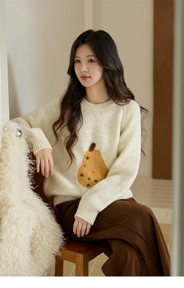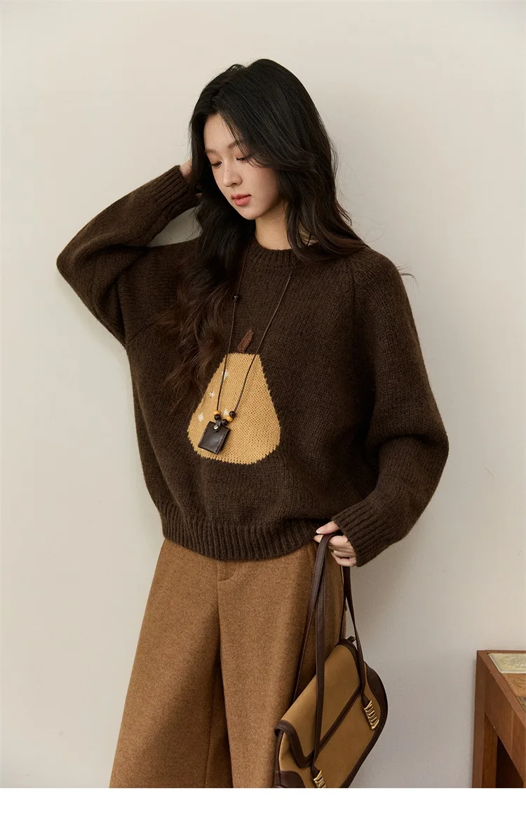 MISHOW Pear Pattern Jacquard Knitted Sweater Autumn Winter Crew Neck Loose Sweaters Wool Blend Warm Pullover Tops MXE94Z2959