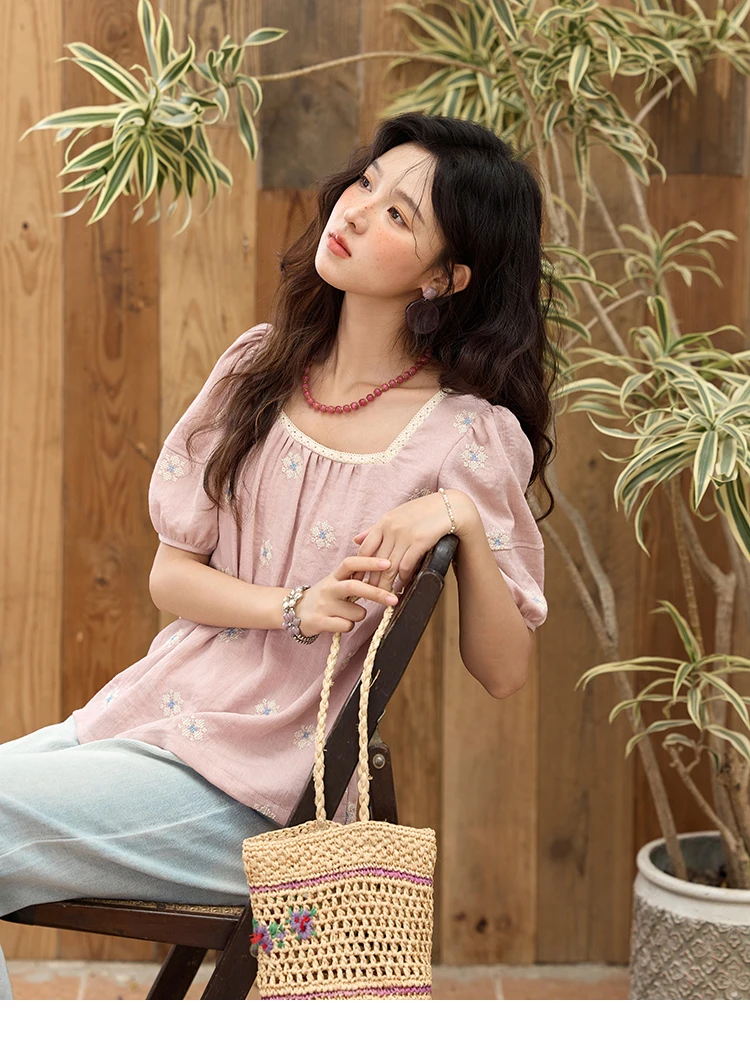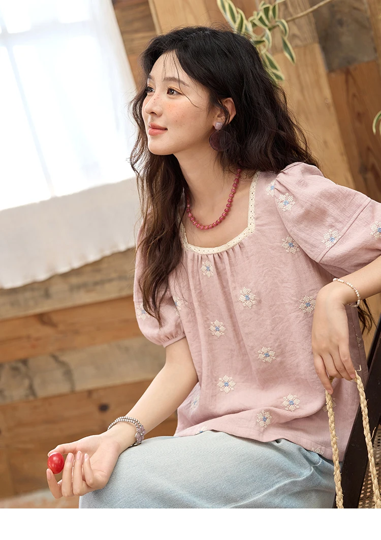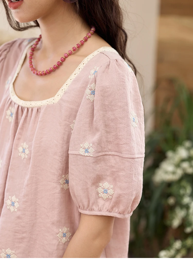 MISHOW Pink Embroidered Linen Floral Blouse for Summer 2025 A-line Square Collar Blouses Lace Patchwork Loose Tops MXE35X1834
