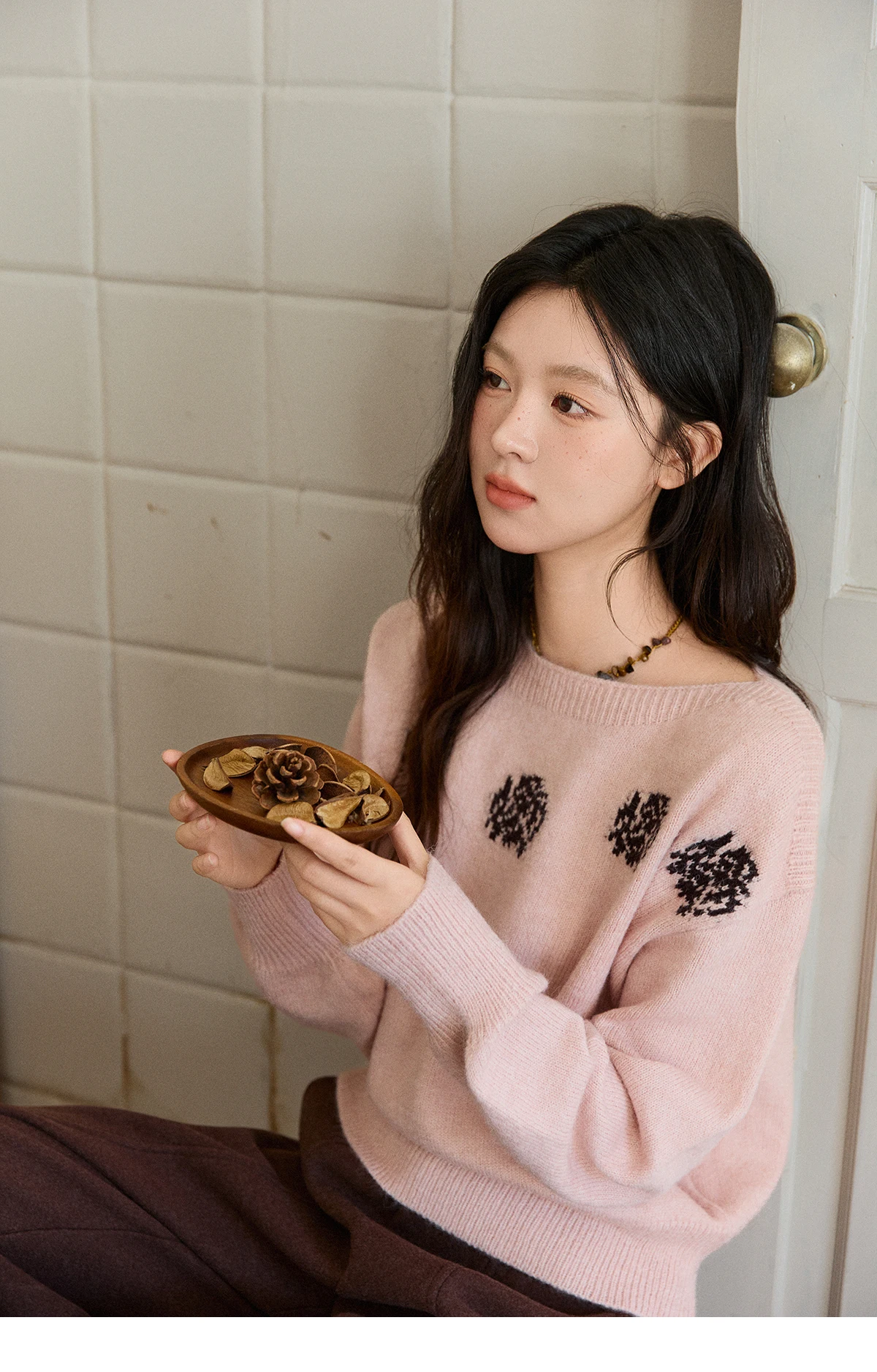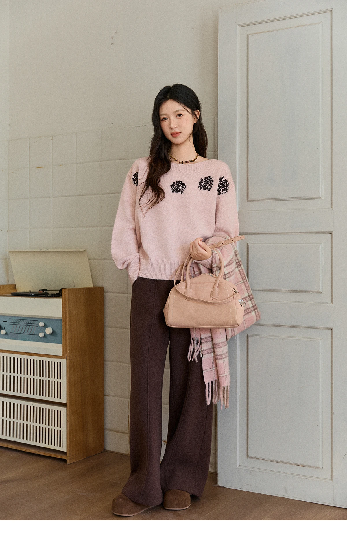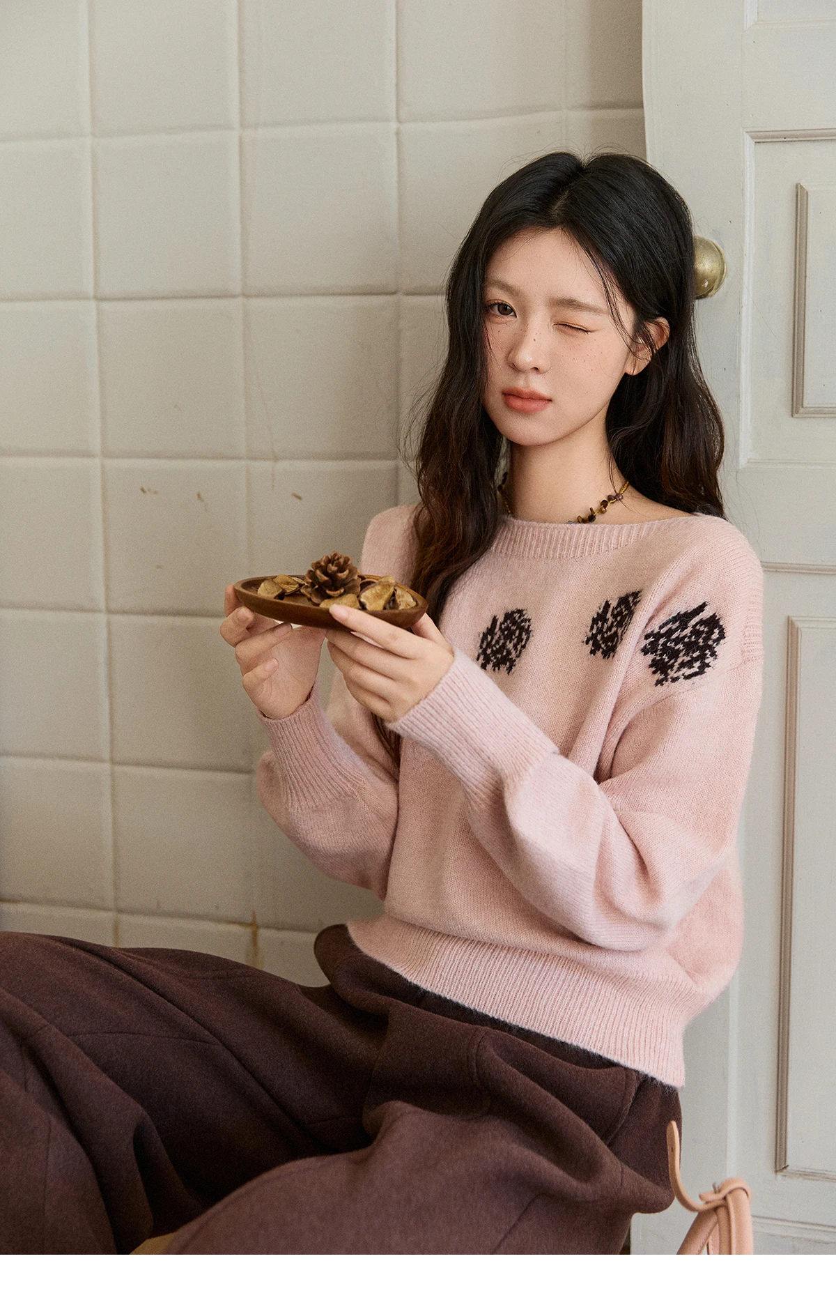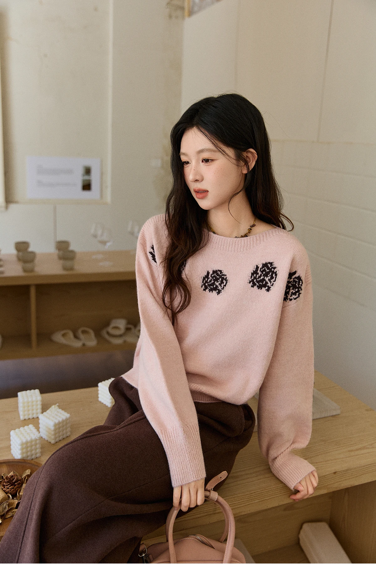 MISHOW Pink Jacquard Sweater for Women Fall Winter 2025 Lantern Sleeve Tops Shoulder Drop Thickened Knitted Sweater MXE91Z2775