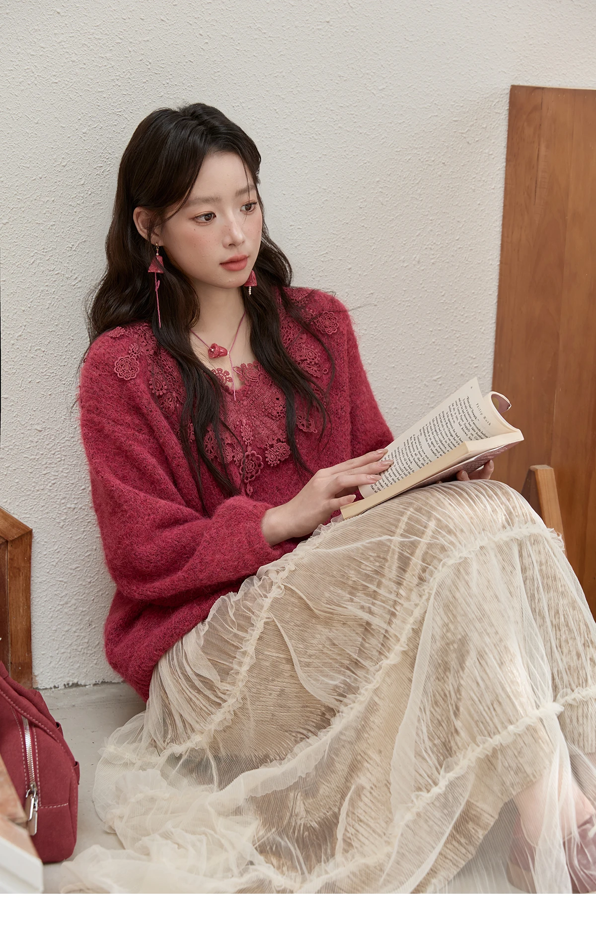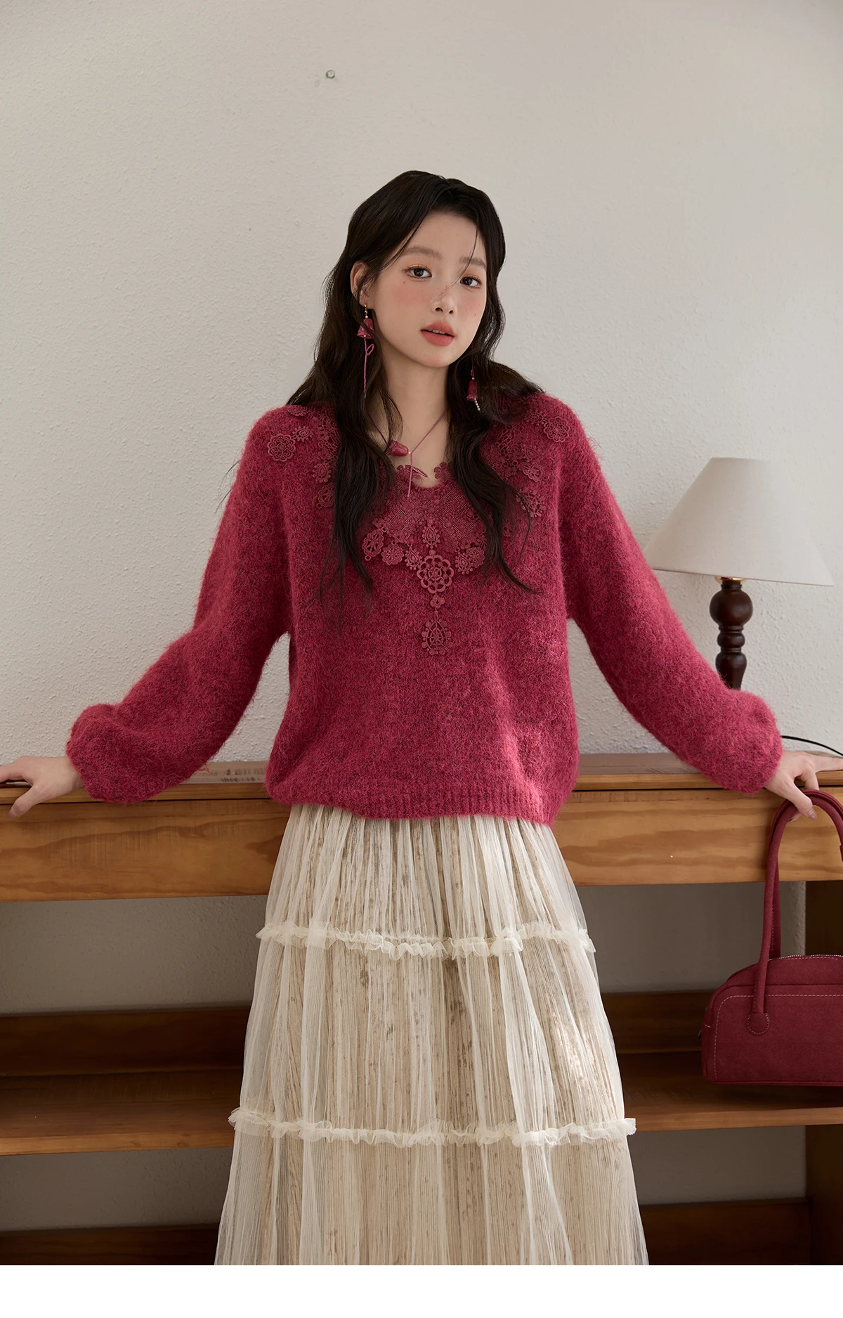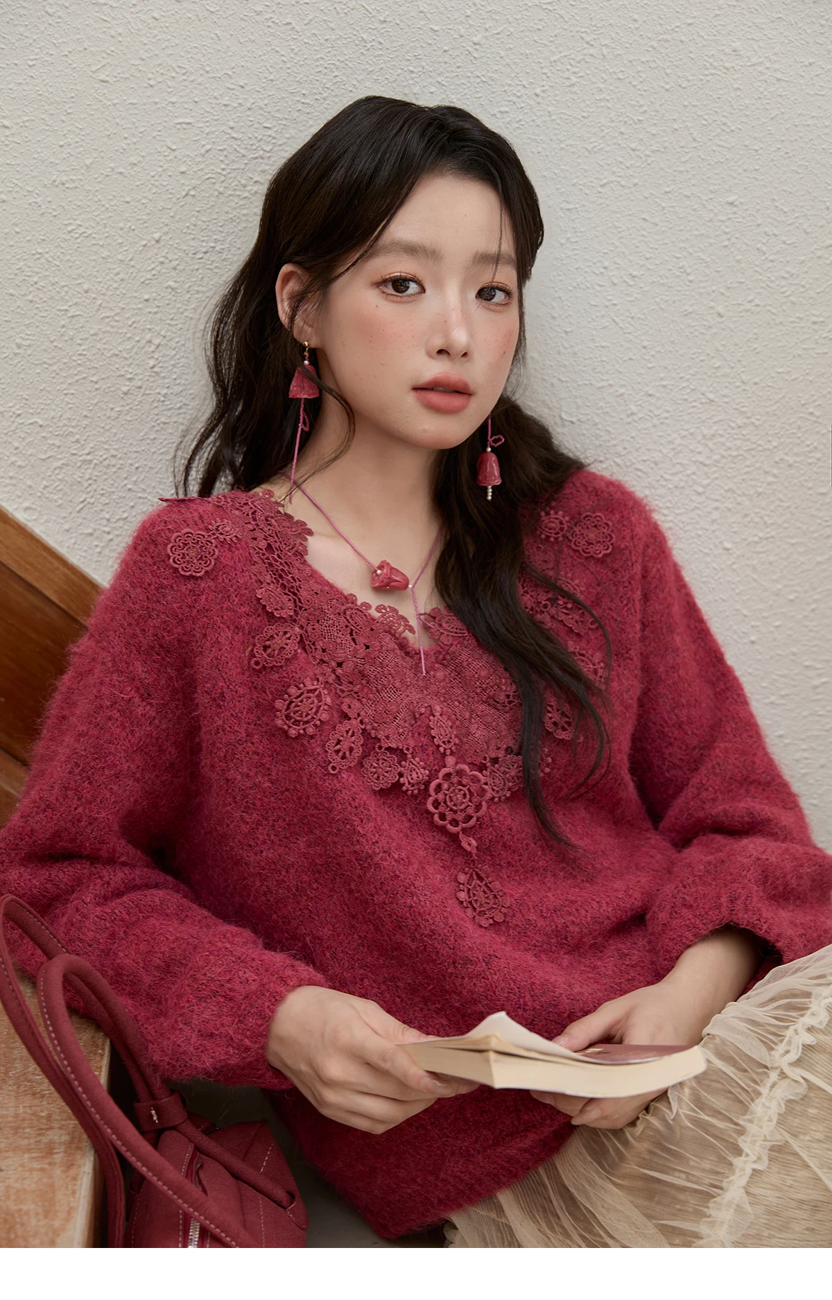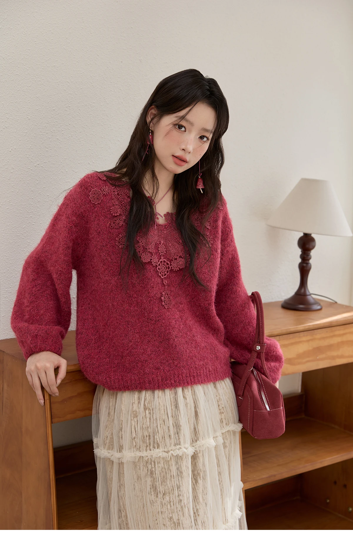 MISHOW Pink Lace Wool Sweater for Woman 2025 Winter Sweet Style V-neck Pullover Casual Loose Lantern Sleeve Sweater MXE51Z2632