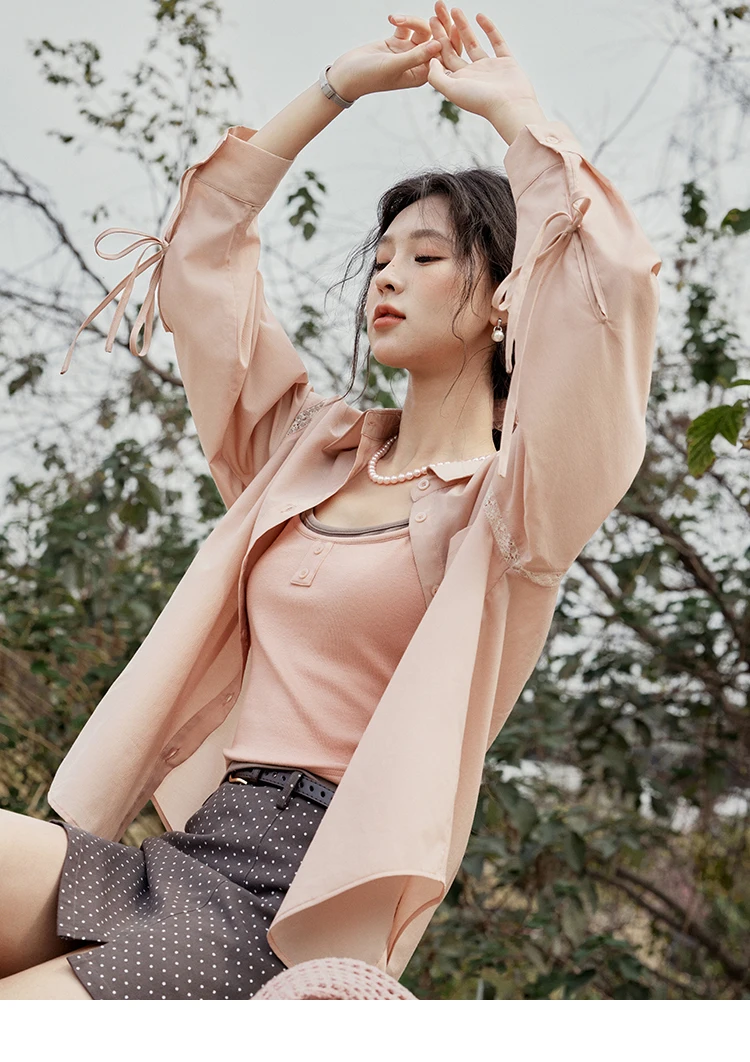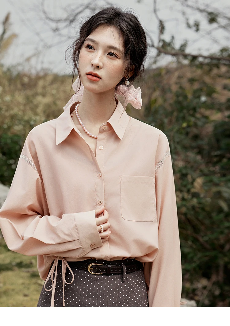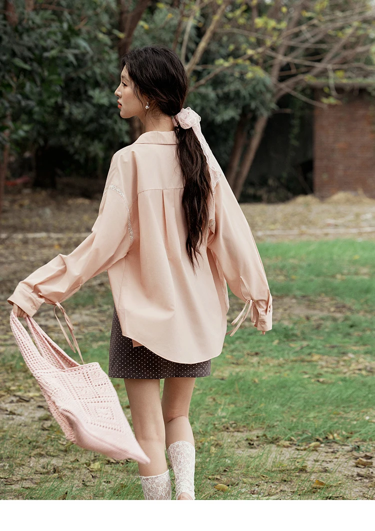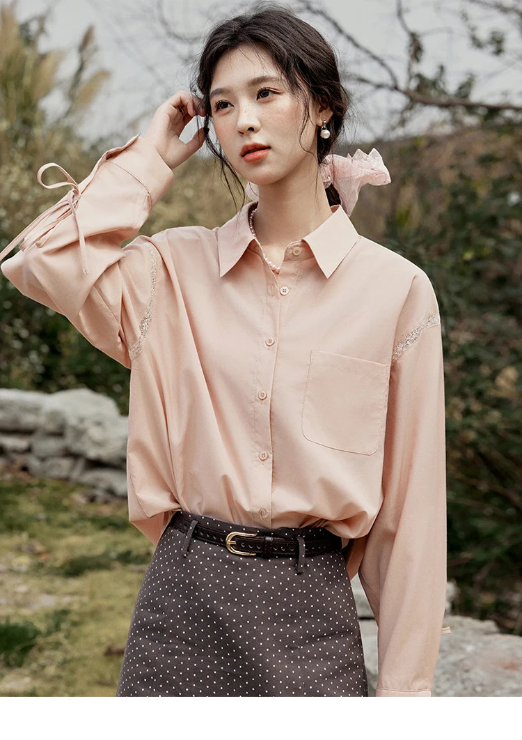MISHOW Pink Long Sleeve Shirt for Women Spring 2025 Korean Splicing Lace Bow Tie Shirt Polo-neck Solid Versatile Tops MXE16C0767