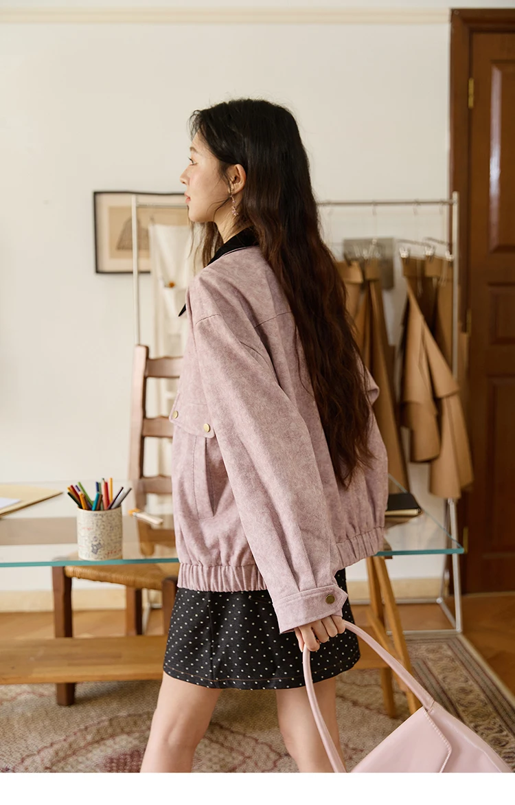 MISHOW Pink Purple Collision Black Lapel Jacket for Women Autumn Suede Metal Zipper Top Retro Loose Elastic Hem Coats MXE46W0865
