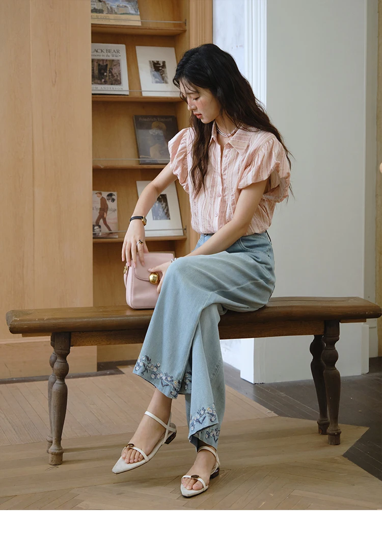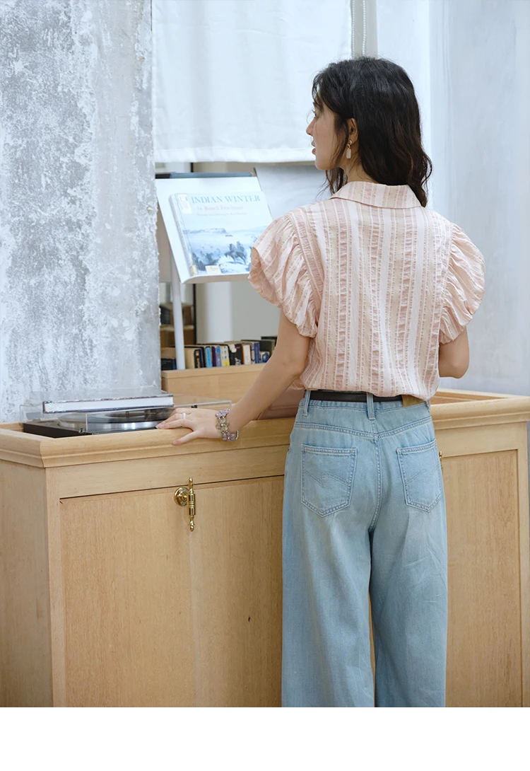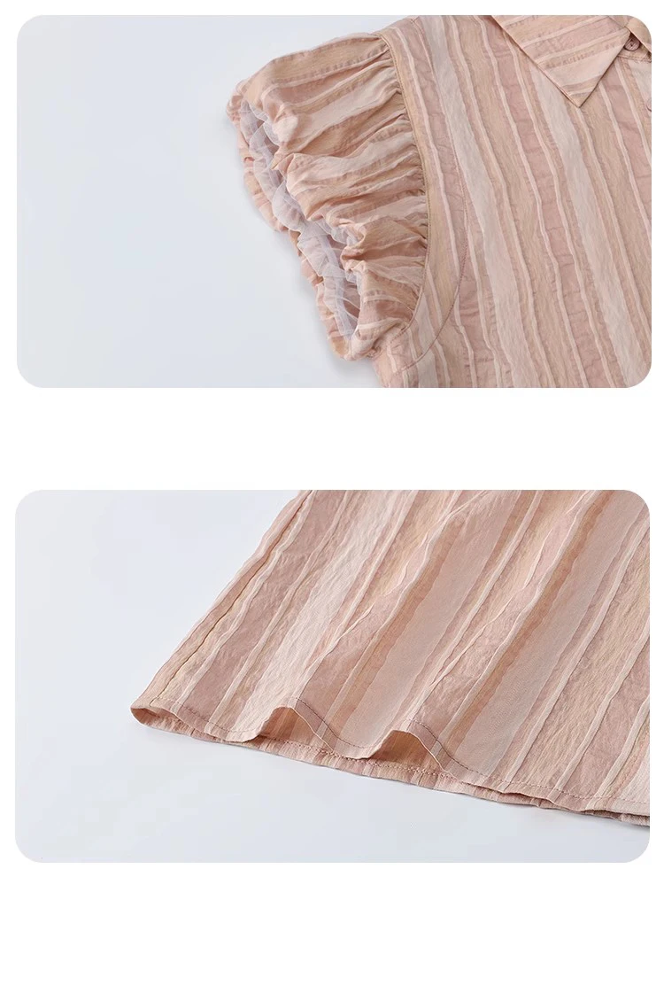 MISHOW Pink Turn-down Collar Flower Bud Sleeve Shirt for Women 2025 Summer New Women's Clothing Button Striped Shirt MXD24C0204