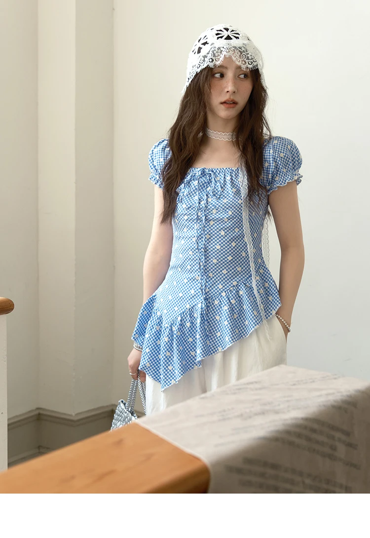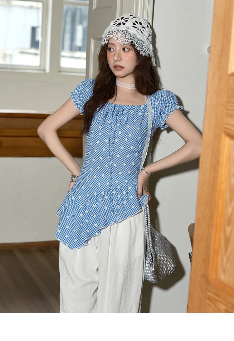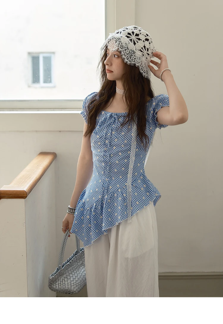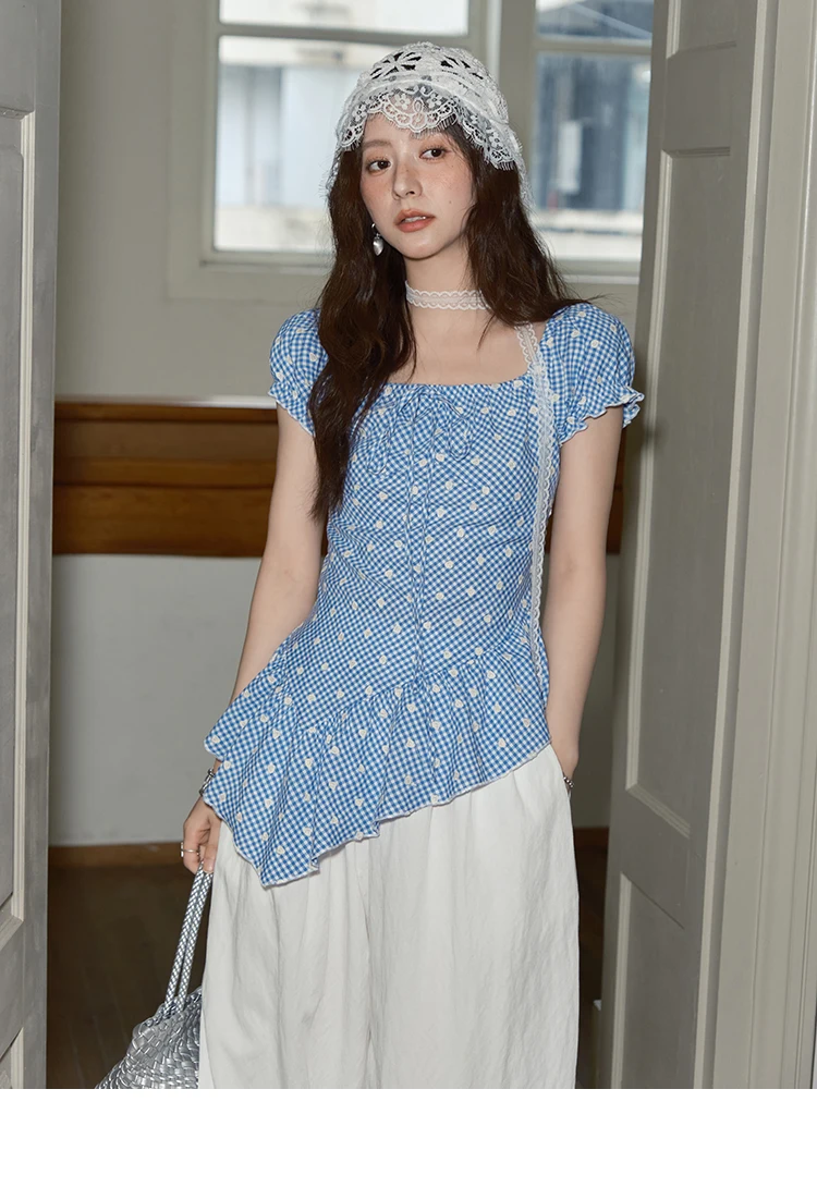 MISHOW Plaid Print Puff Sleeve Top for Women 2025 Summer Slim Square Neck Lace Up Asymmetrical Blouse Ladies Clothing MXE39X1930