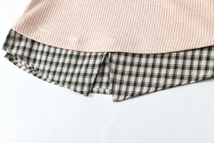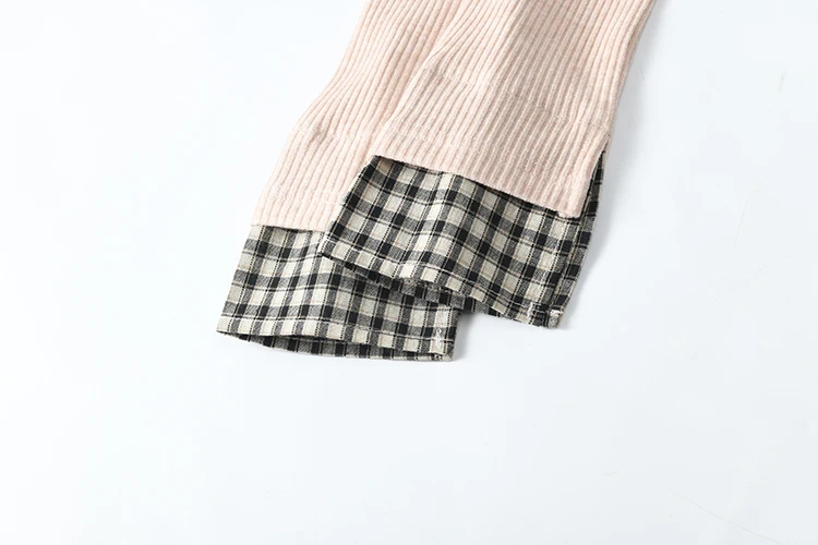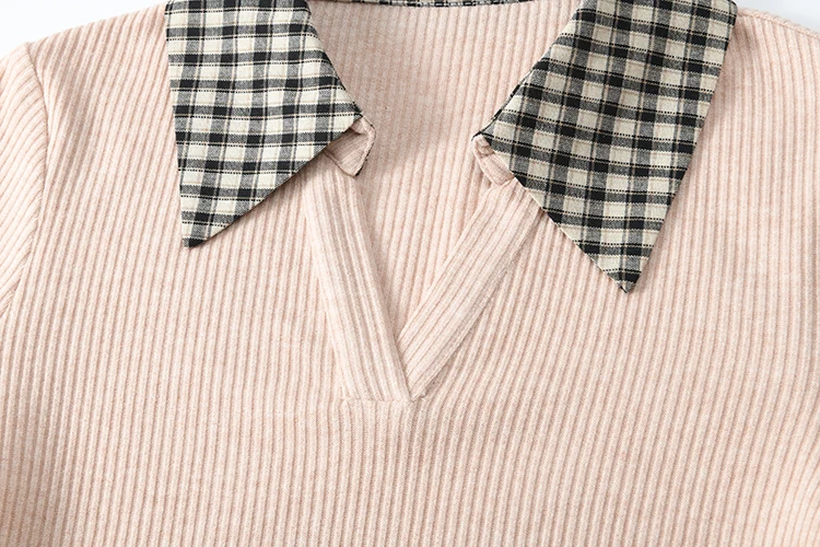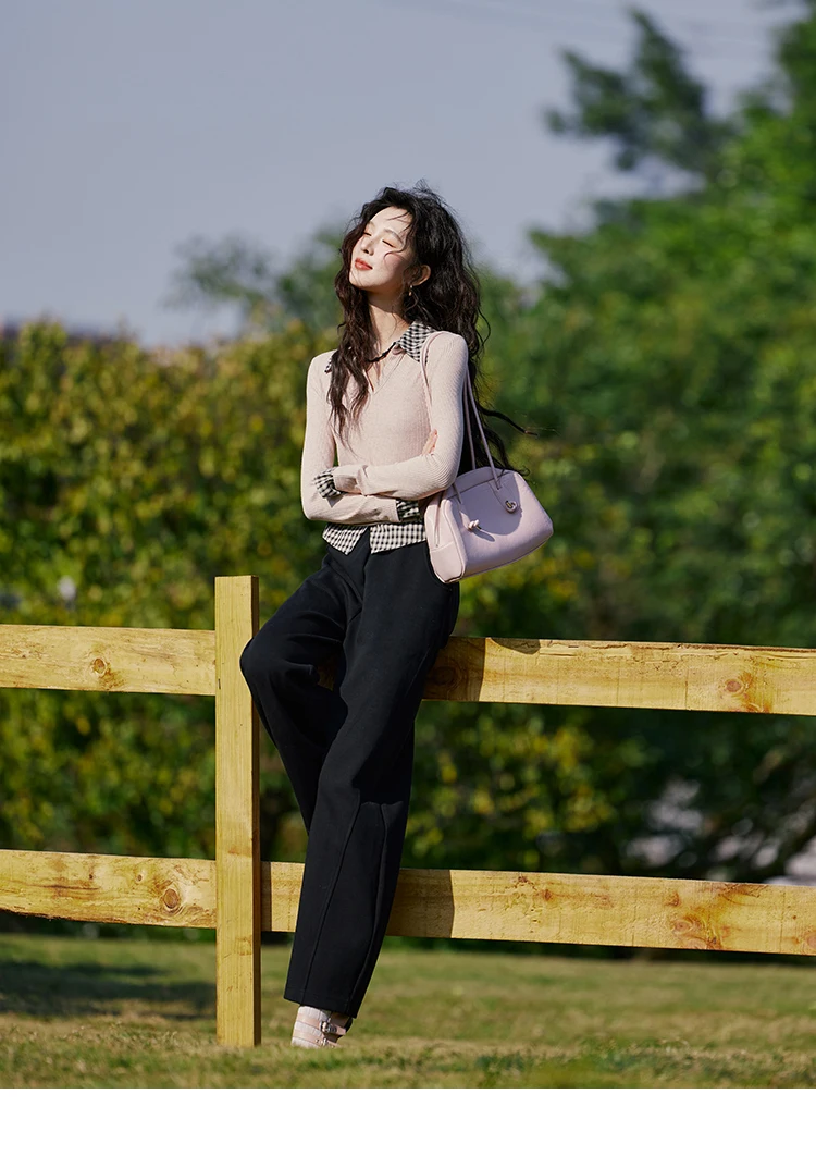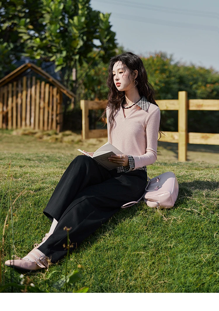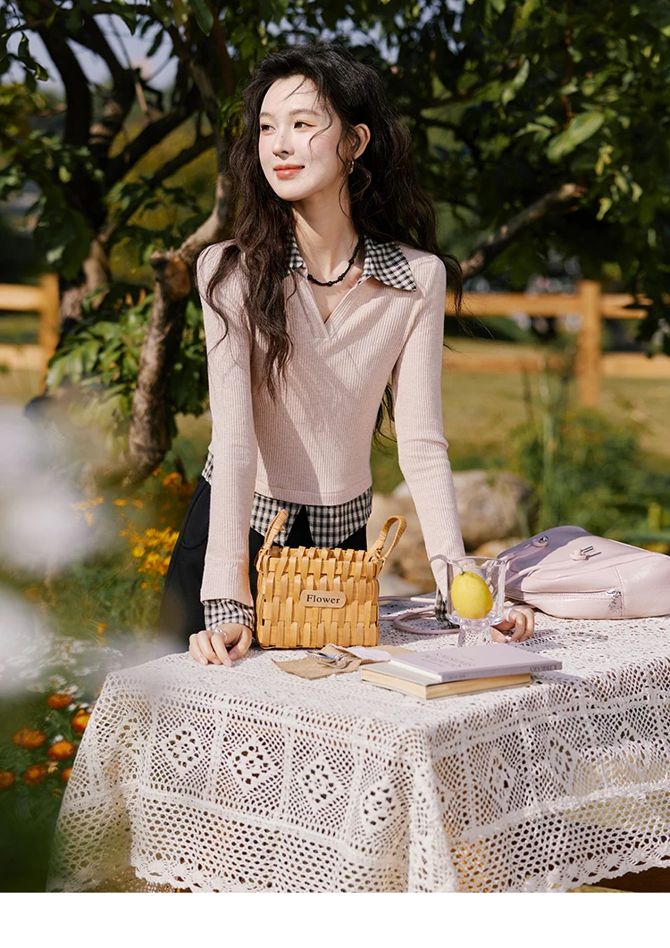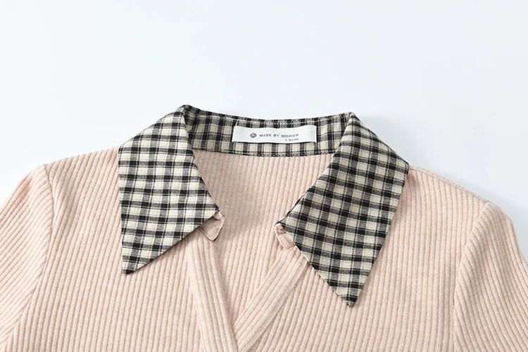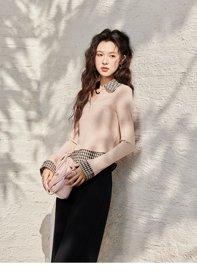 MISHOW Plaid Splicing Fake Two-piece Tops for Women Spring 2025 Contrasting Colors Slim Thin Top V-neck Casual Tees MXE13Z1108